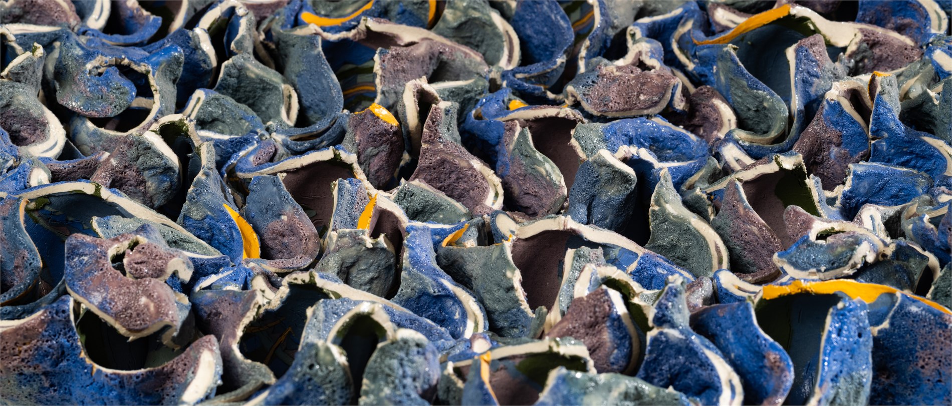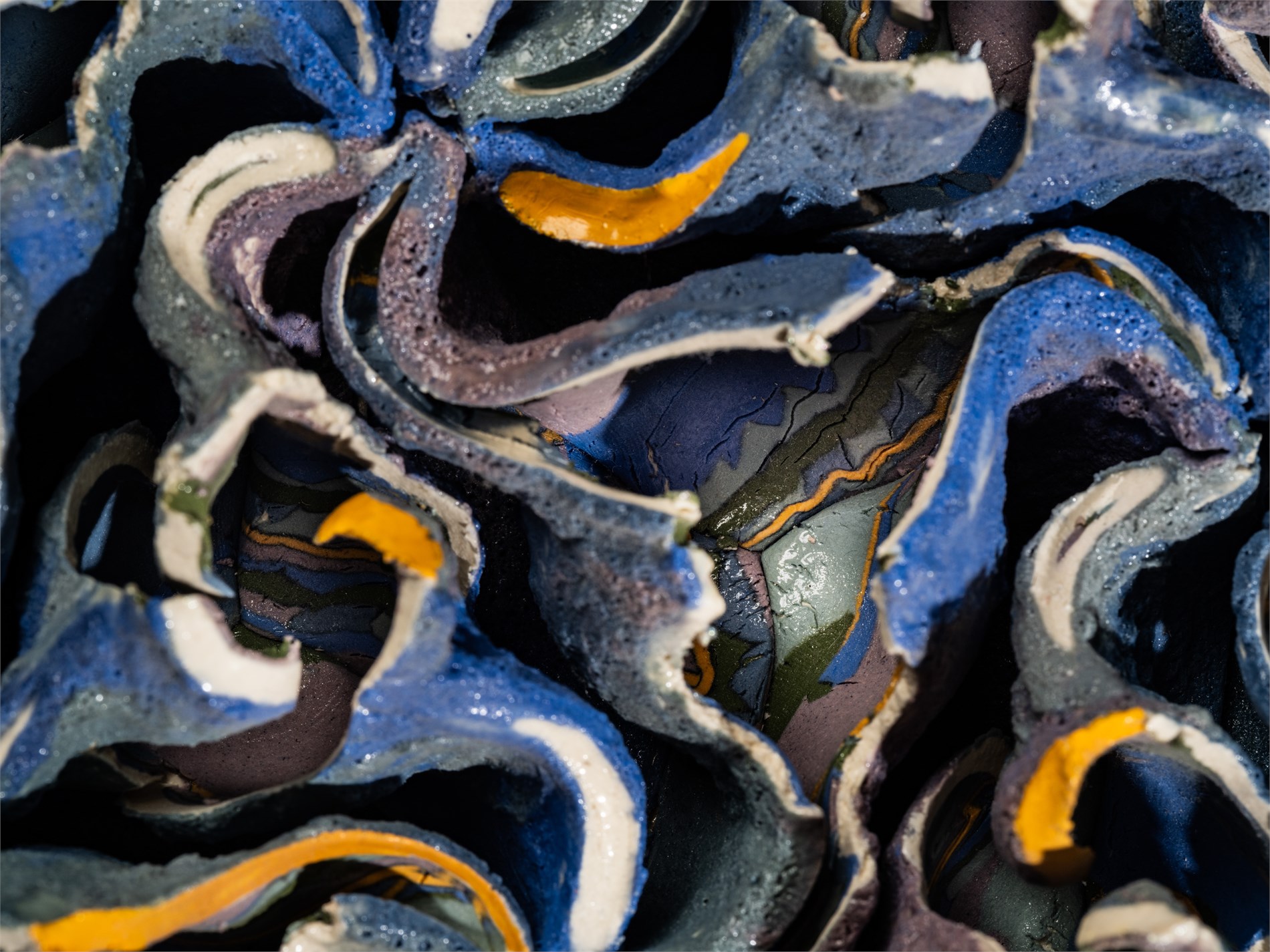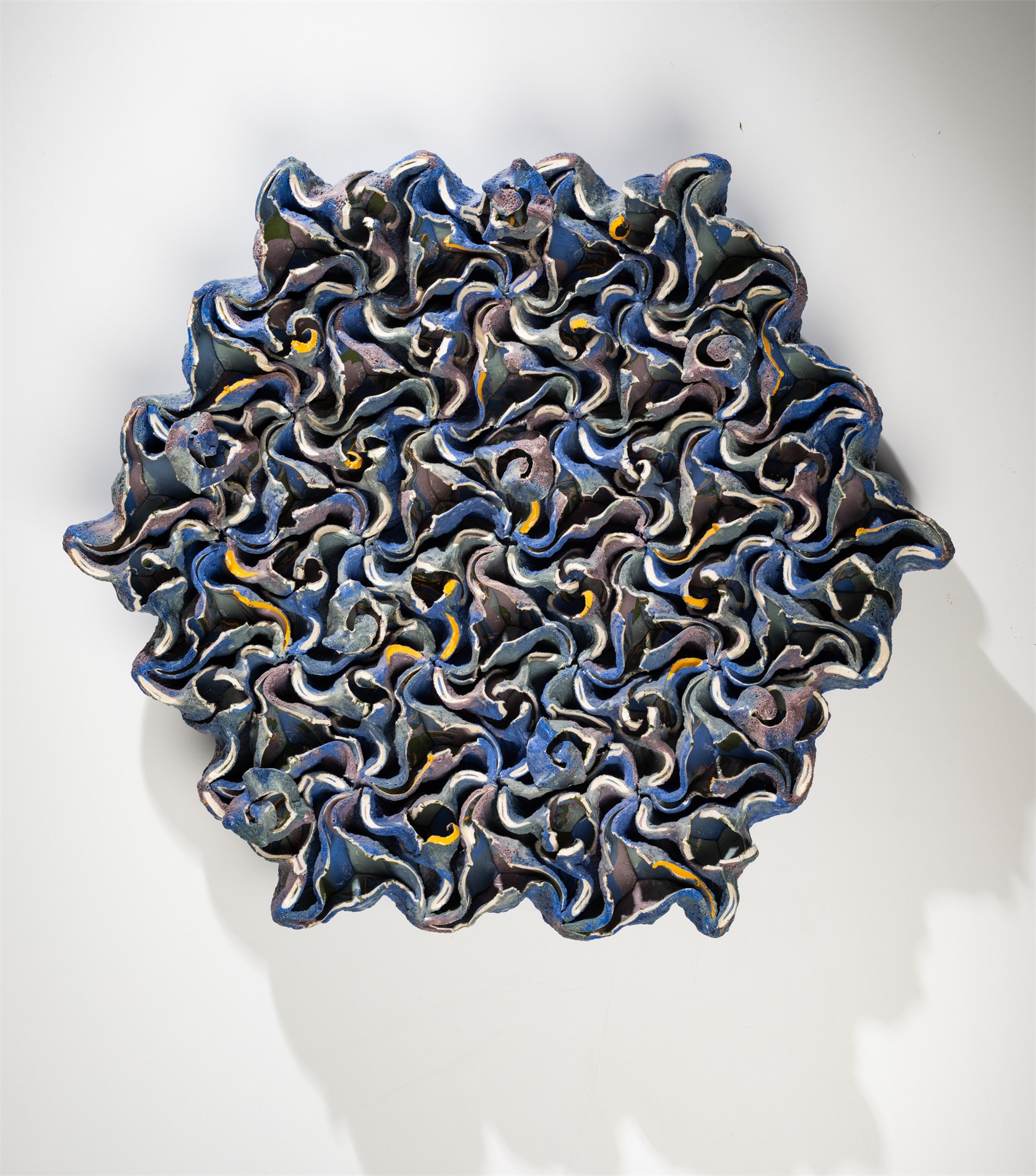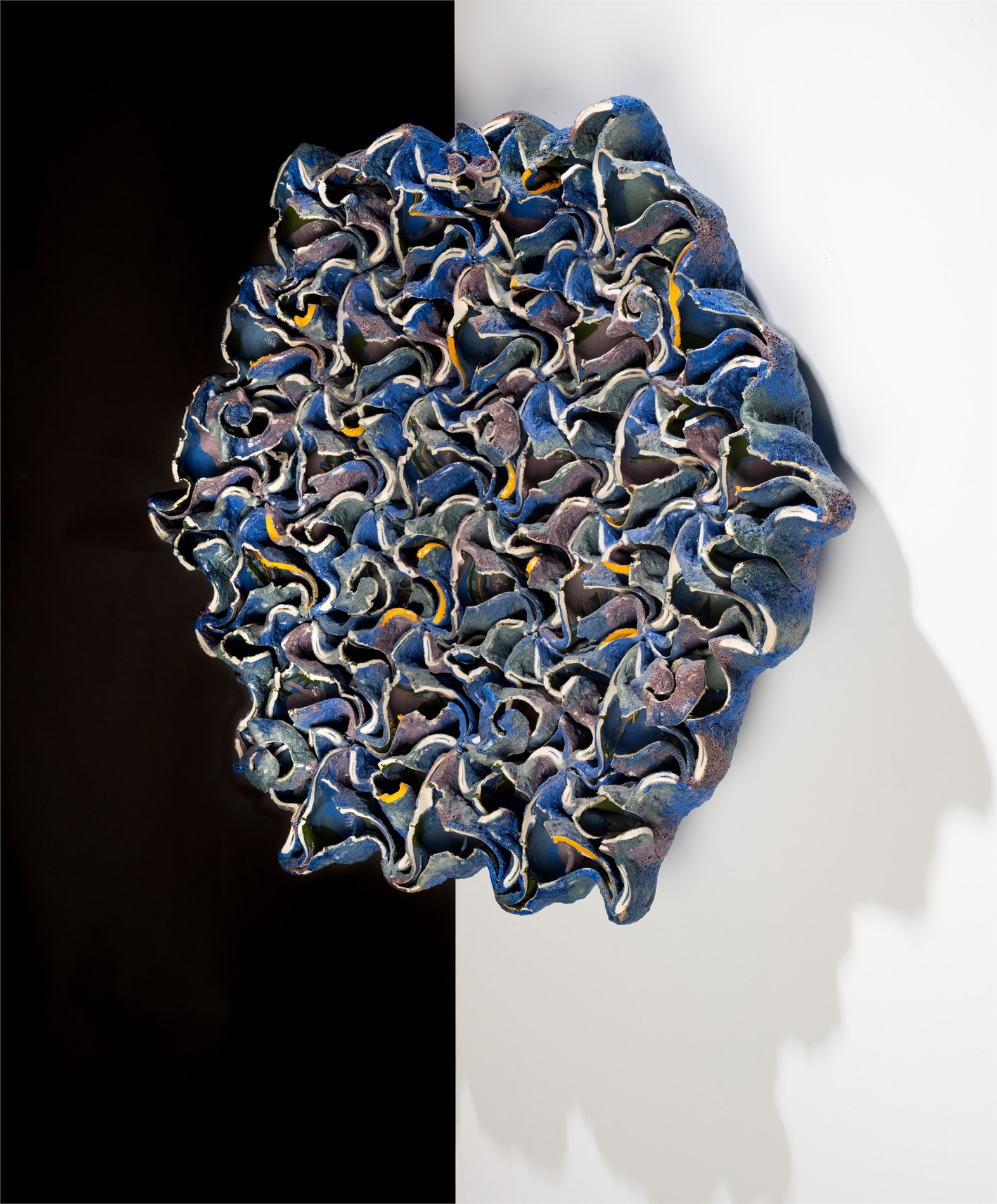 Veggobjekt i stengods, 52 cm diameter, Innfarget porselensleire og steingodsleire i kombinasjon med selvglasserende leire, underglassurblyanter, luster og emaljefarger, Signert med stempel bak. Oppheng