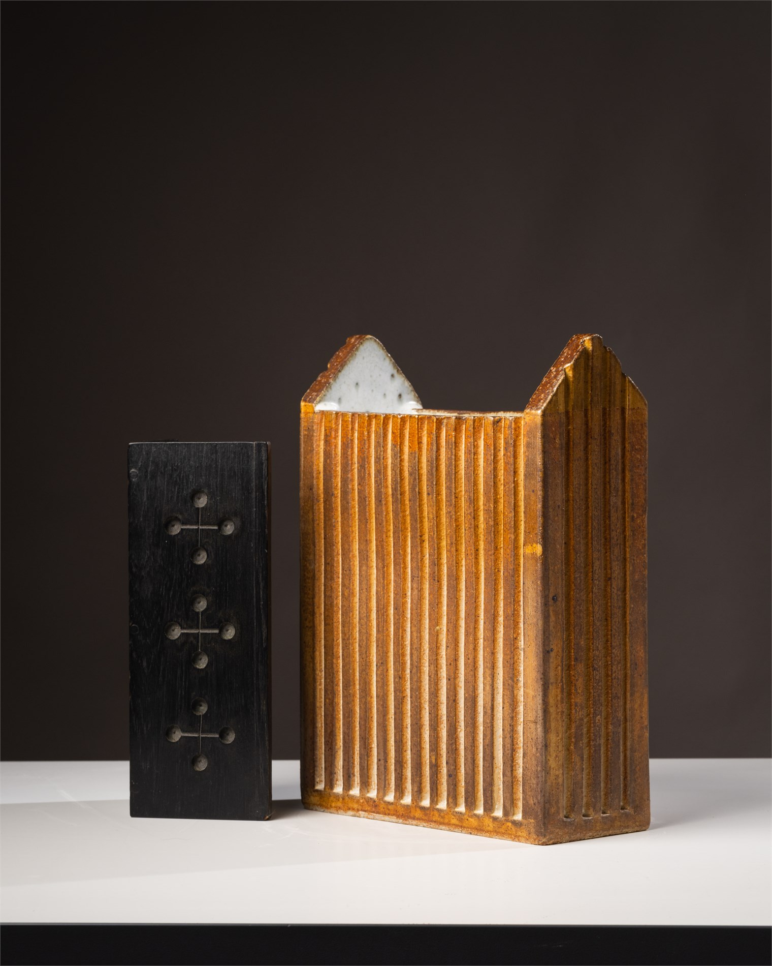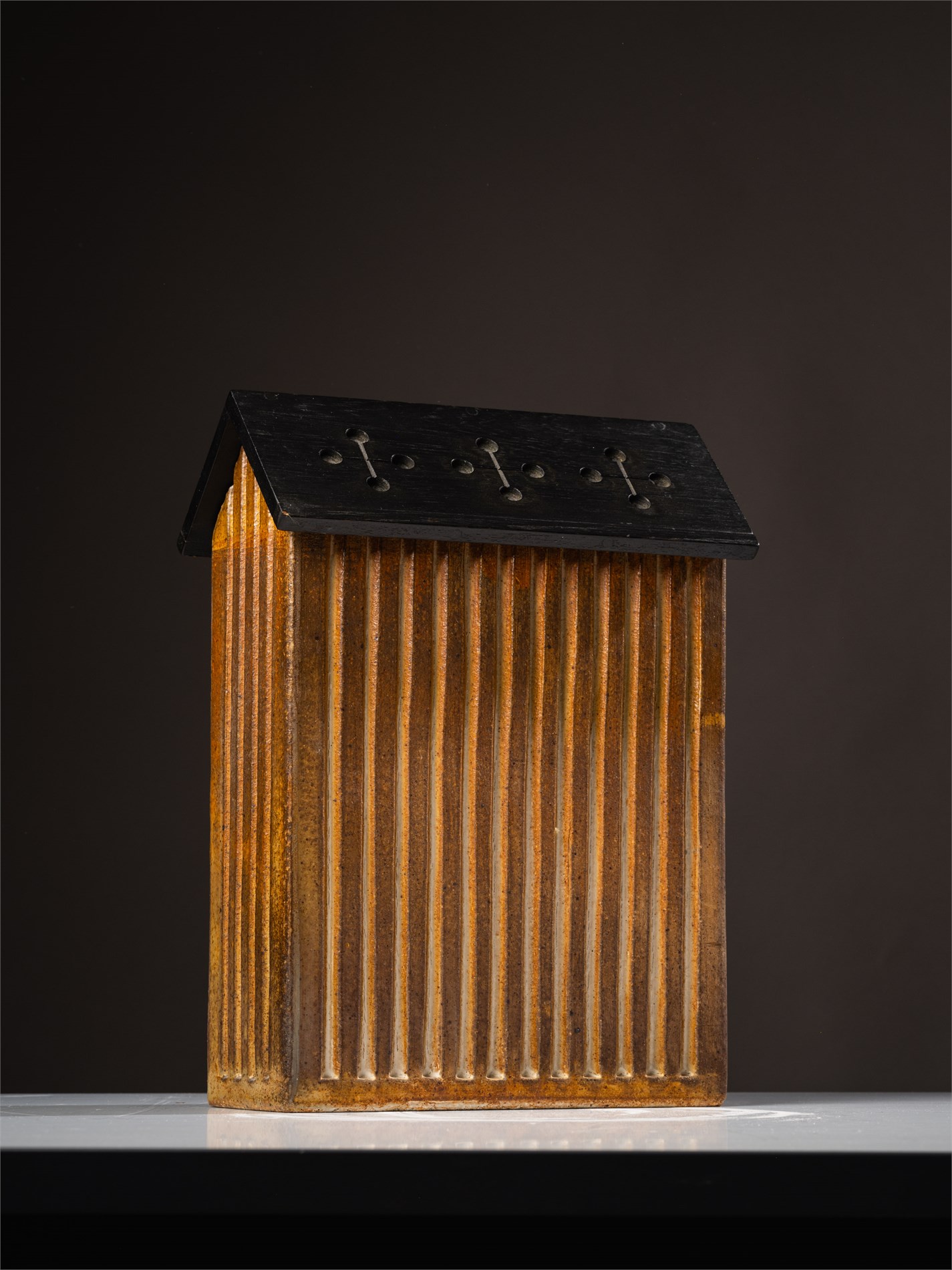 "Huskiste" antagelig 1998, Glasert stengods med tretak, 27 x 36 x 14 cm, Signert under: G T