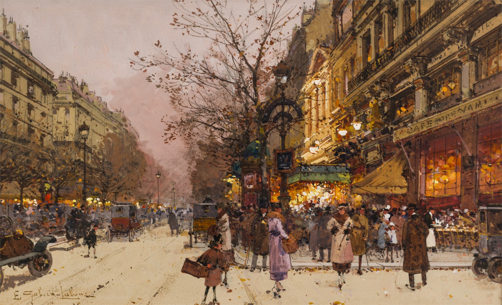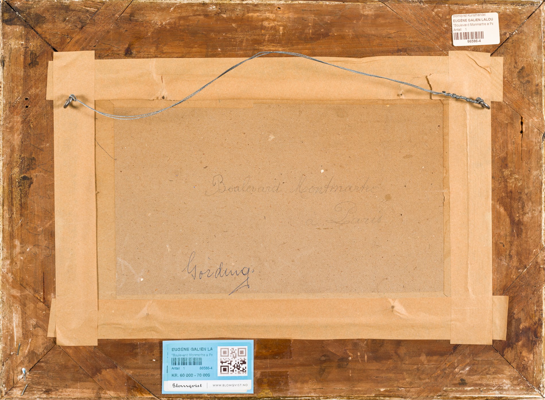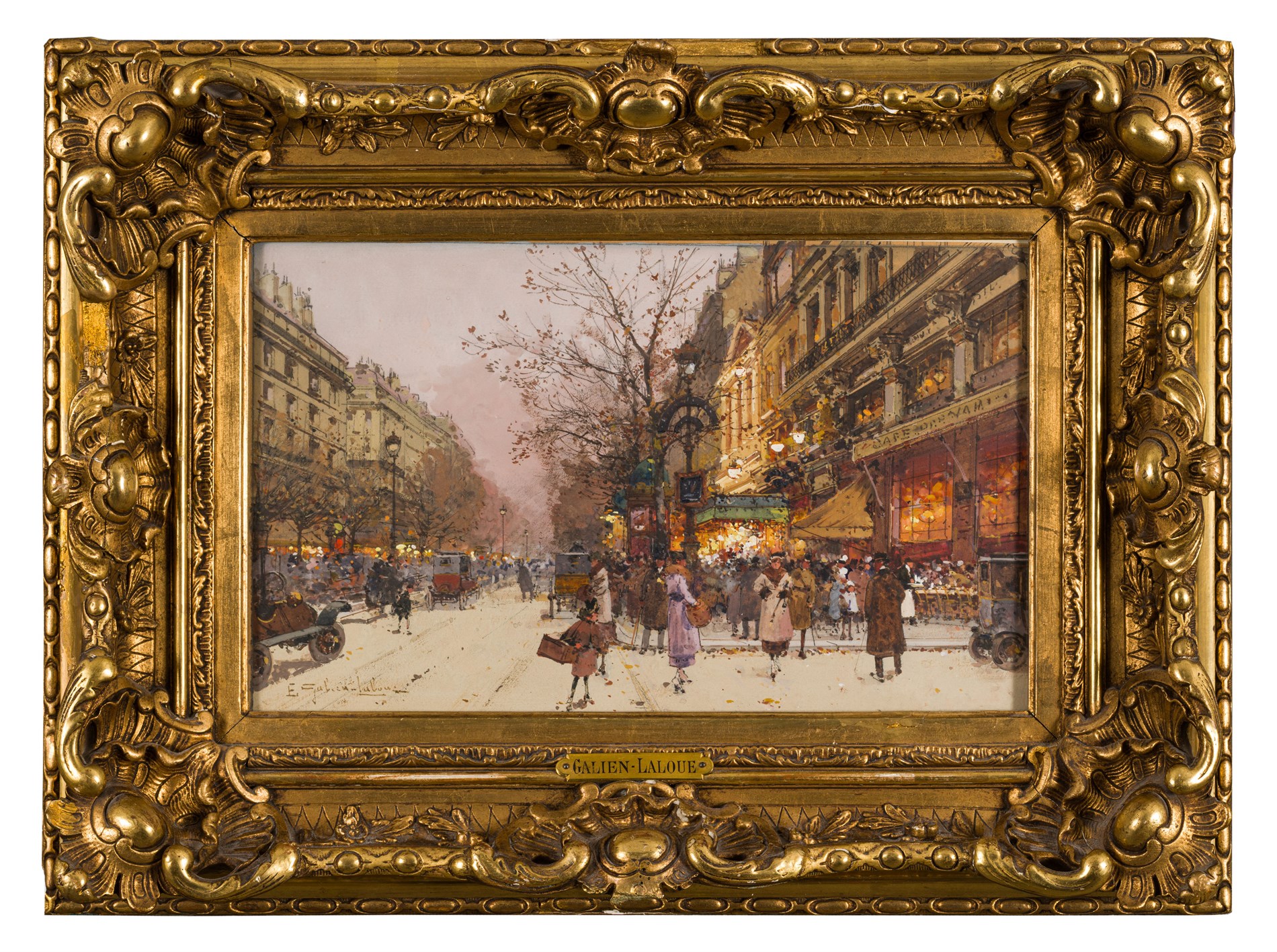"Boulevard Montmartre, Paris", Gouache, 19 x 31 cm, Signert nede til venstre: E. Galien-Laloue