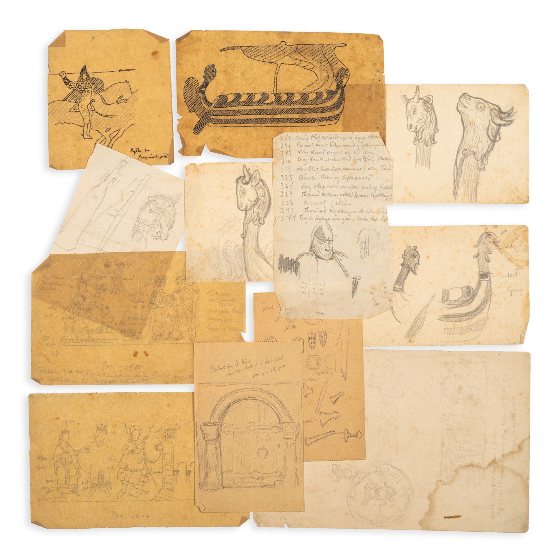 4 skisser fra Bayeux teppet, samt 8 blyantskisser, forberedelser til Snorre illustrasjonenene. Løse ark i varierende format og tilstand.