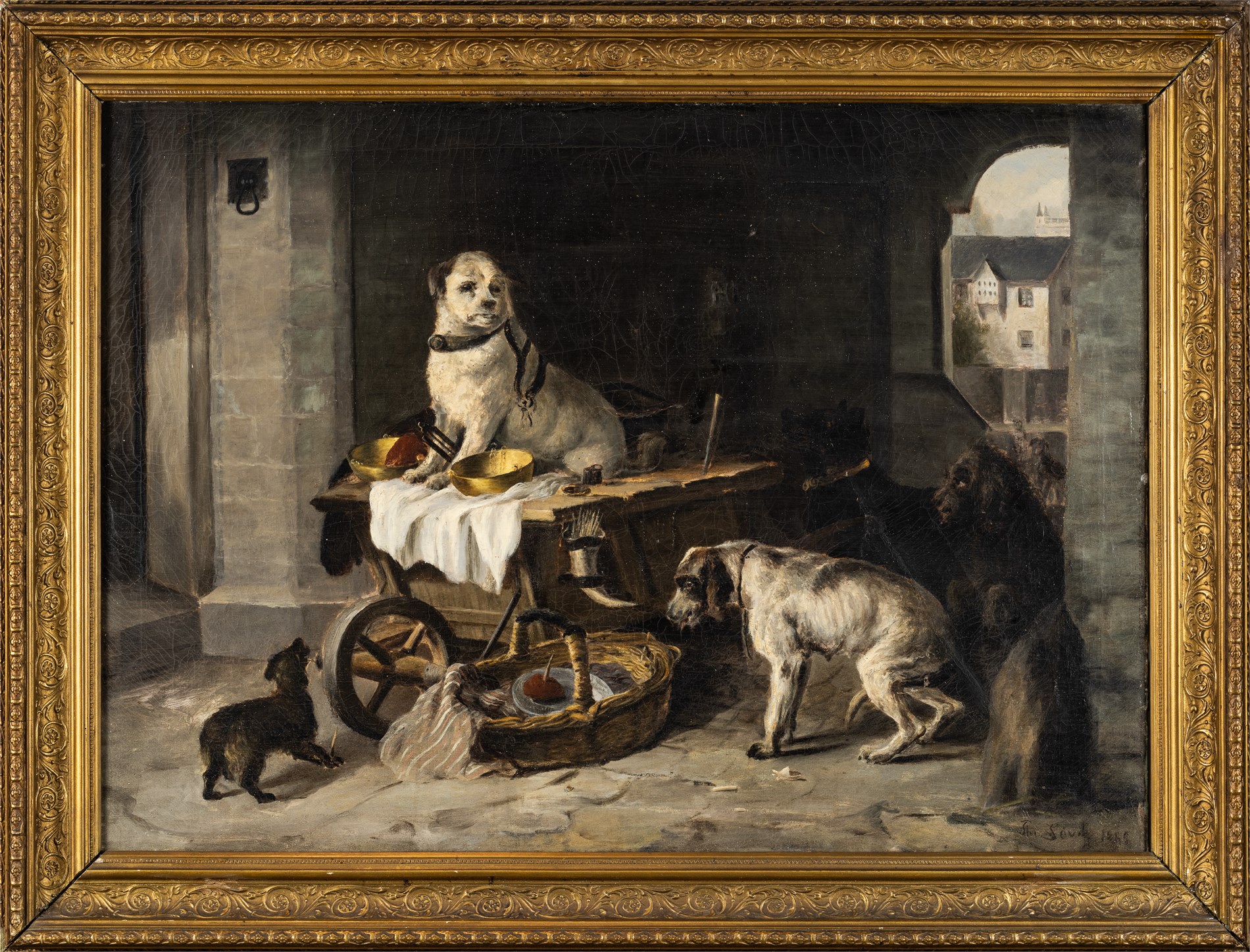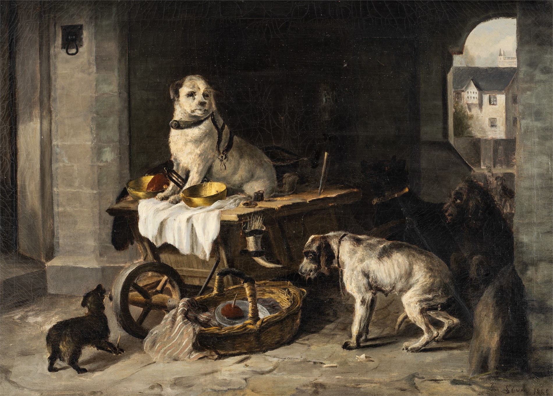 Hundedominans, 1885, Olje på lerret, 64 x 88 cm, Signert nede til høyre: Th Søvig 1885