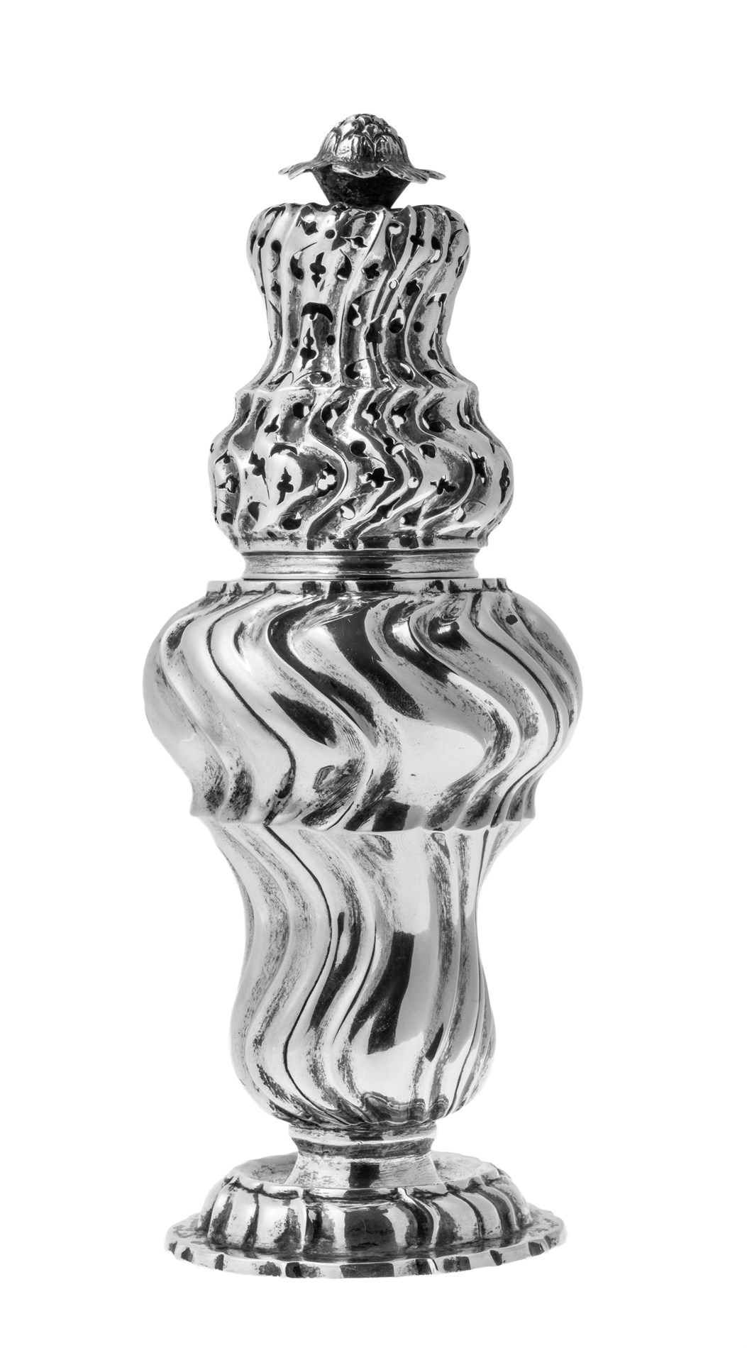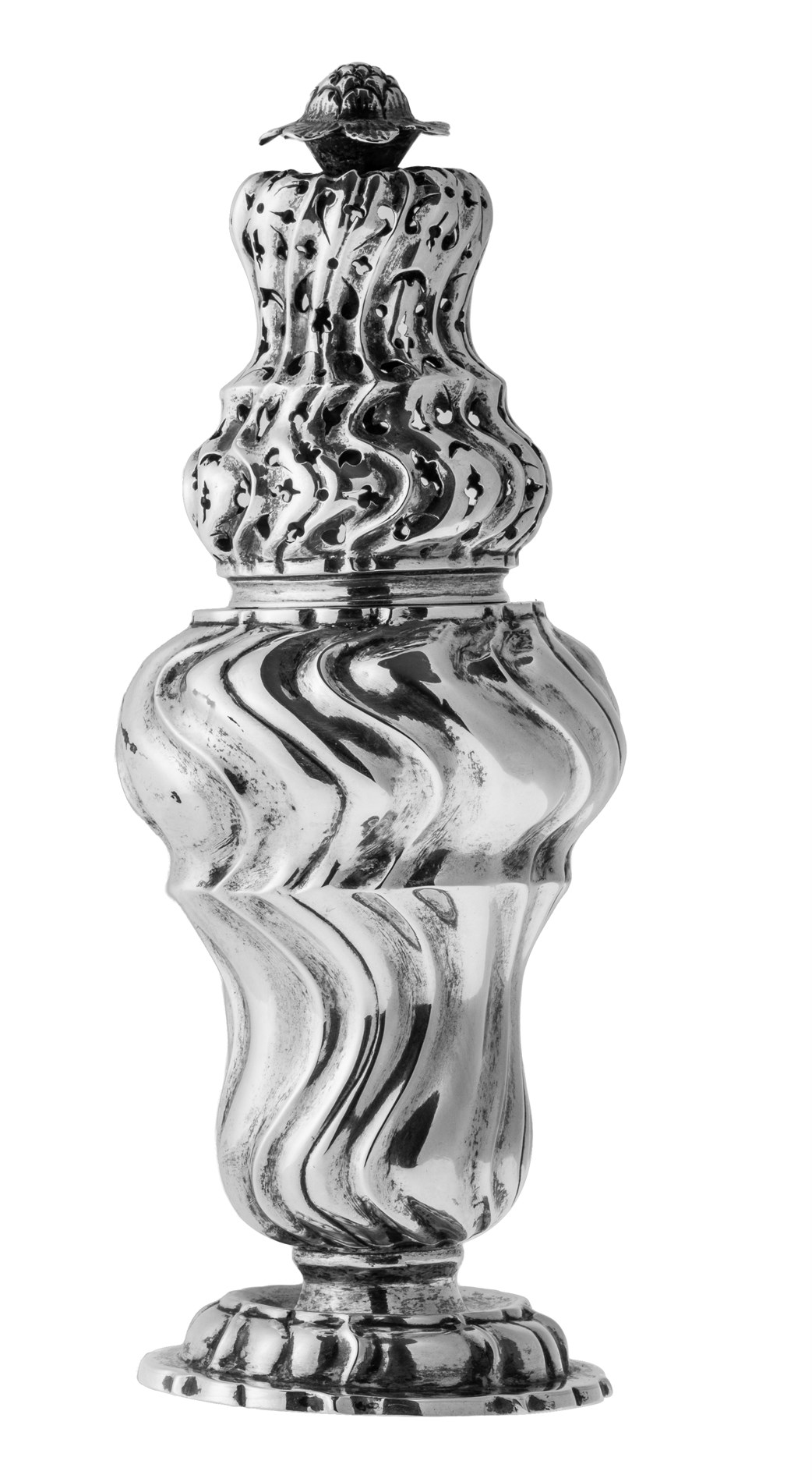 Vaseformet korpus drevet med svungne åser, lokknopp Trondhjemrose, hvelvet fotstykke. Jens Peter Larsen Dorenfeldt, Trondhjem 1748-1773