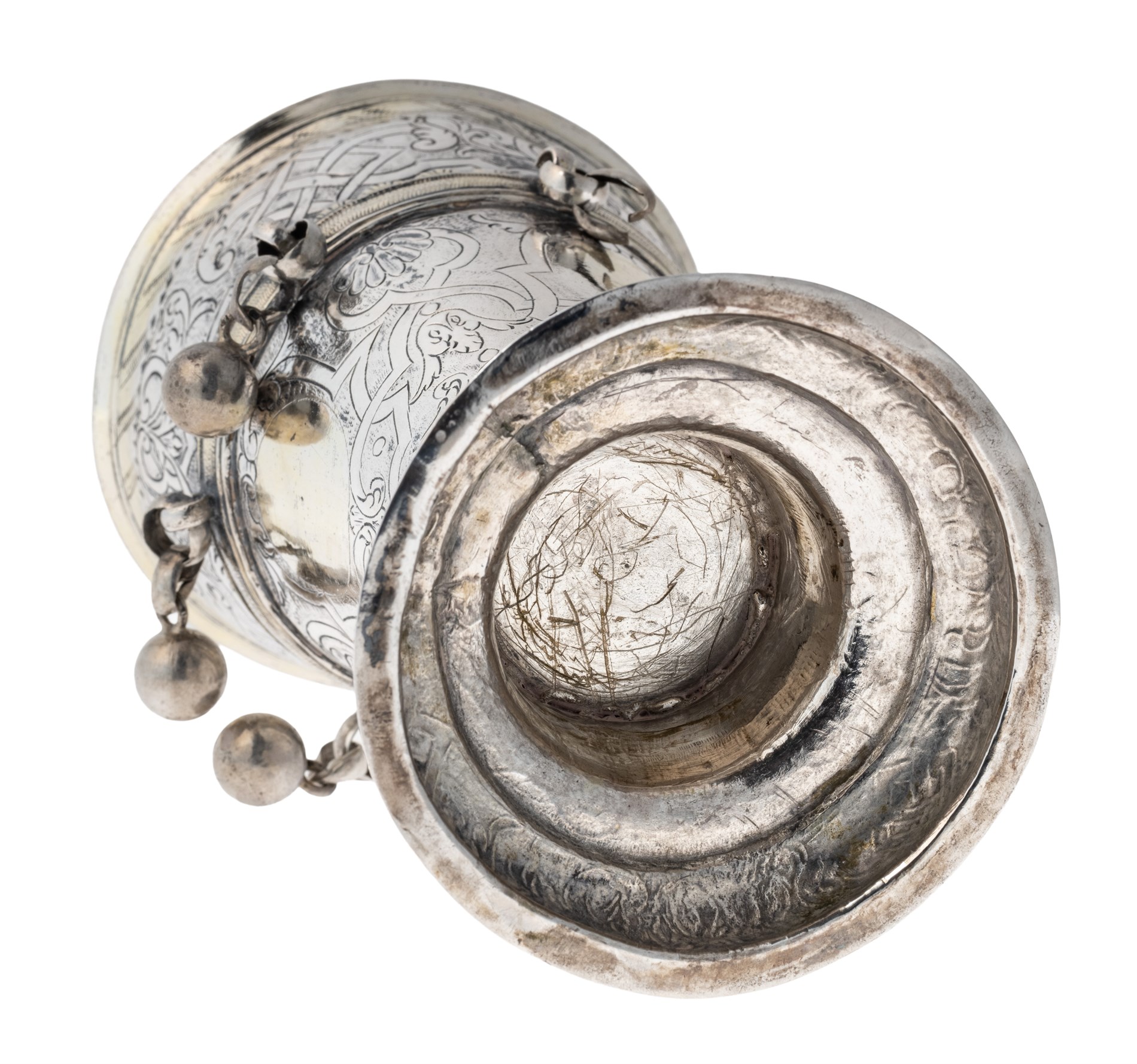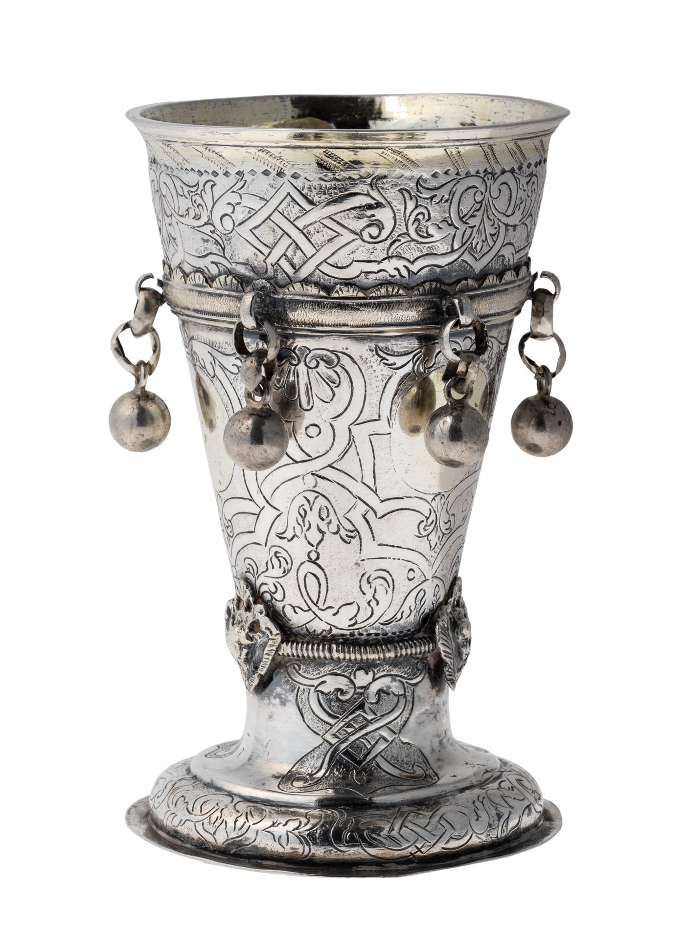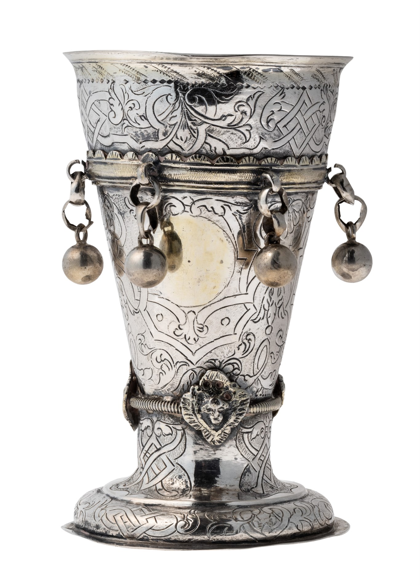 Sølv, rikt gravert regence dekor, 2 bånd med raslekuler og engler, ustemplet, tilskrevet Mester: Hagen Brun 1715-1737