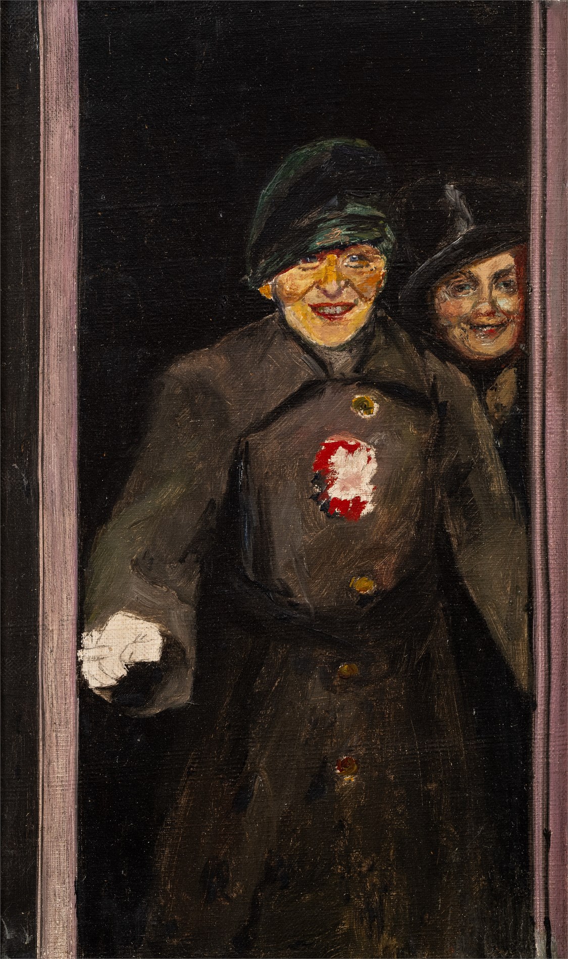 I de senere år av sitt virke malte Christian Krohg ofte unge modeller i helt hverdagslige situasjoner, som her, hvor de blide og glade unge damene er malt der de synes å strømme inn gjennom en dør. Han malte modeller som hadde sin gang ved Kunstakademiet, der han var blitt professor i 1909. Disse unge kvinnenes umiddelbare, naturlige vesen tiltalte ham. Krohg brydde seg ikke om å male sine modeller i en eller annen kunstig stilling på podiet. Han skildret dem i de mest dagligdagse situasjoner.