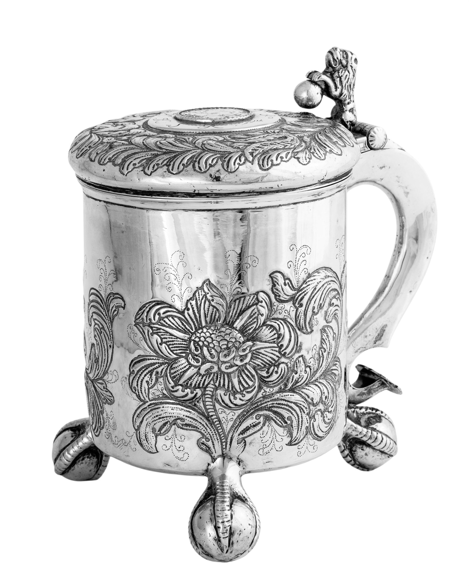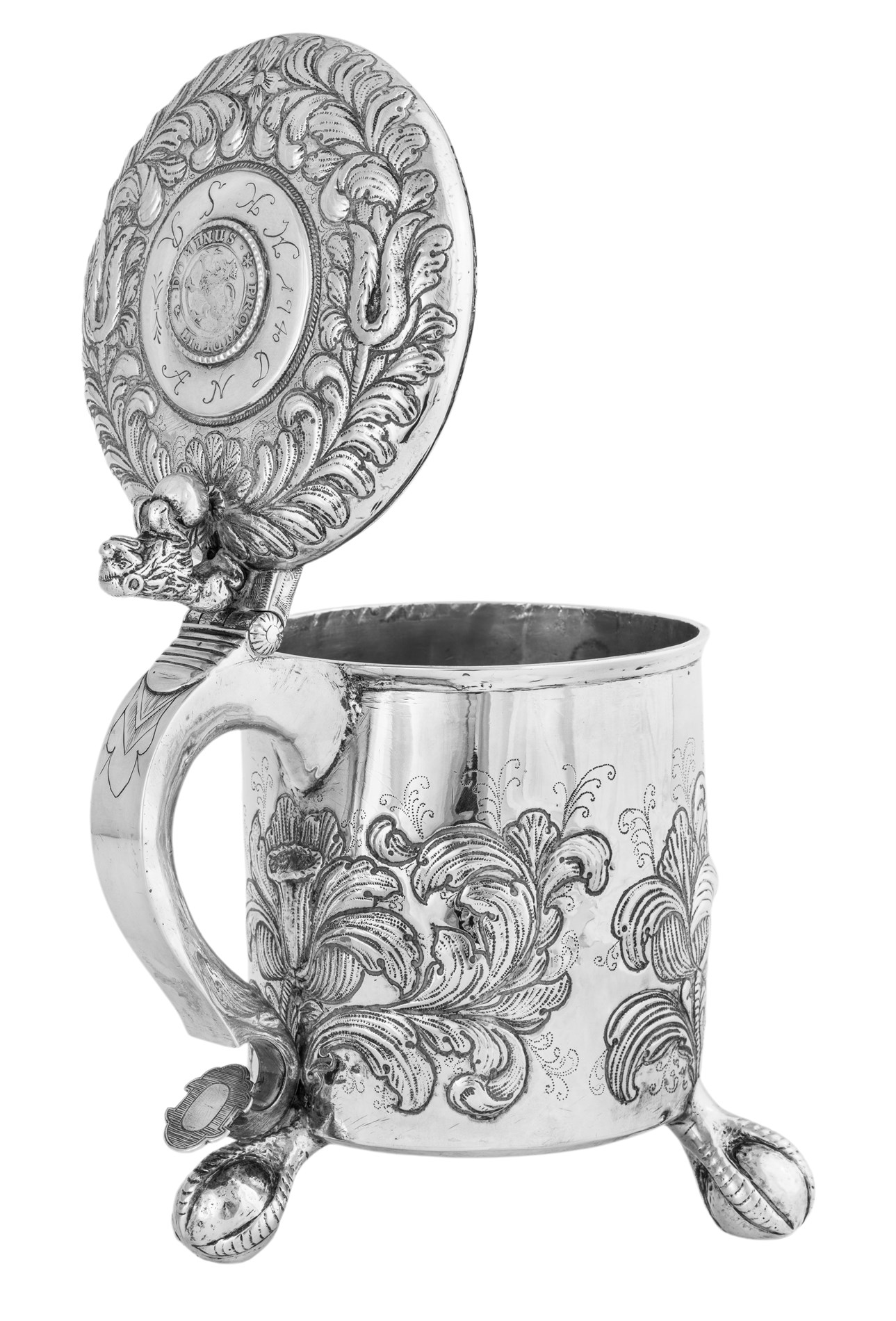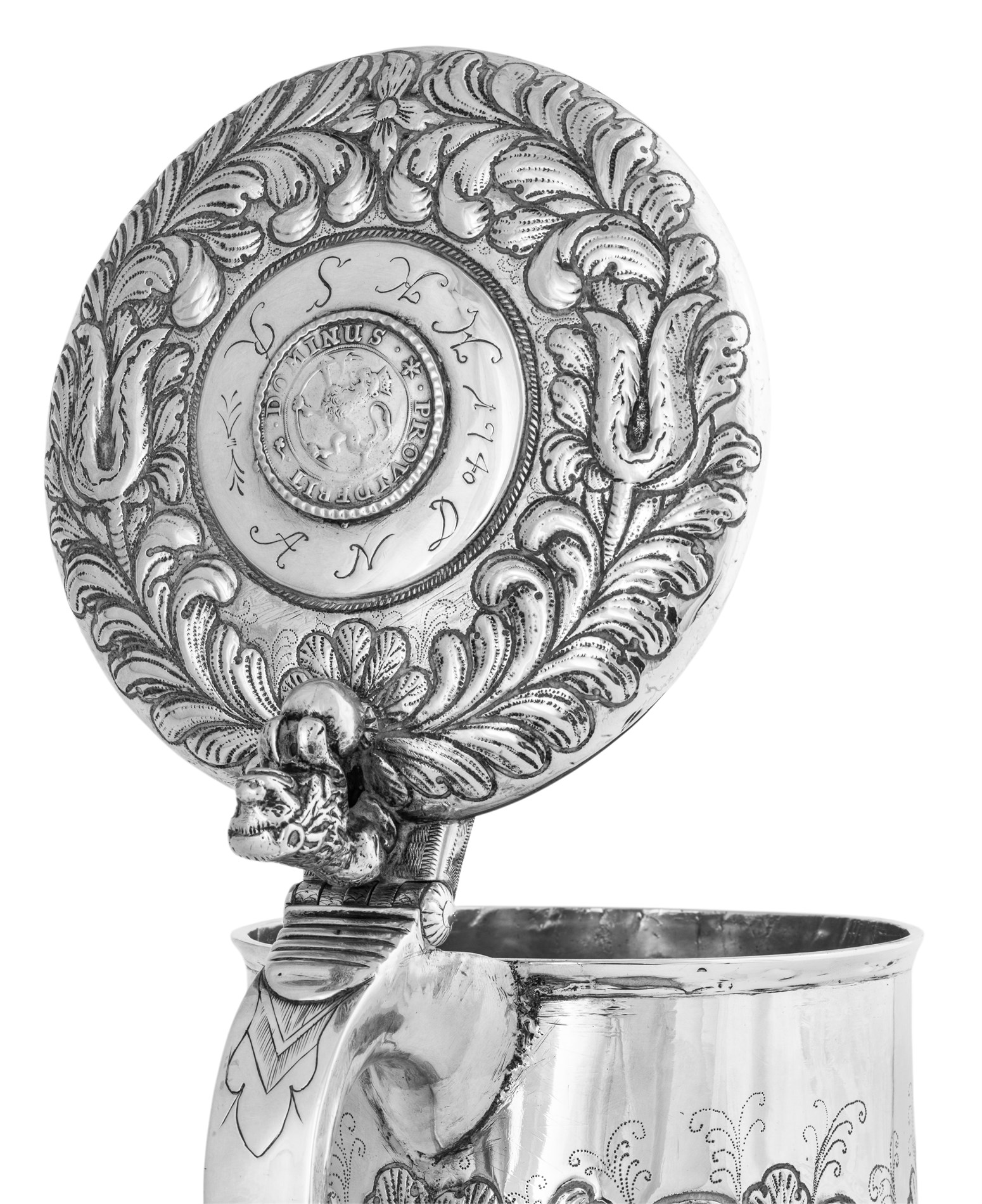 Sølv 830s Barokkstil drikkekanne med drevet siselert dekor II marks mynt datert 1665 innfelt i lokket, Johan Dybesland (1872-1944) 21 cm 756 gram