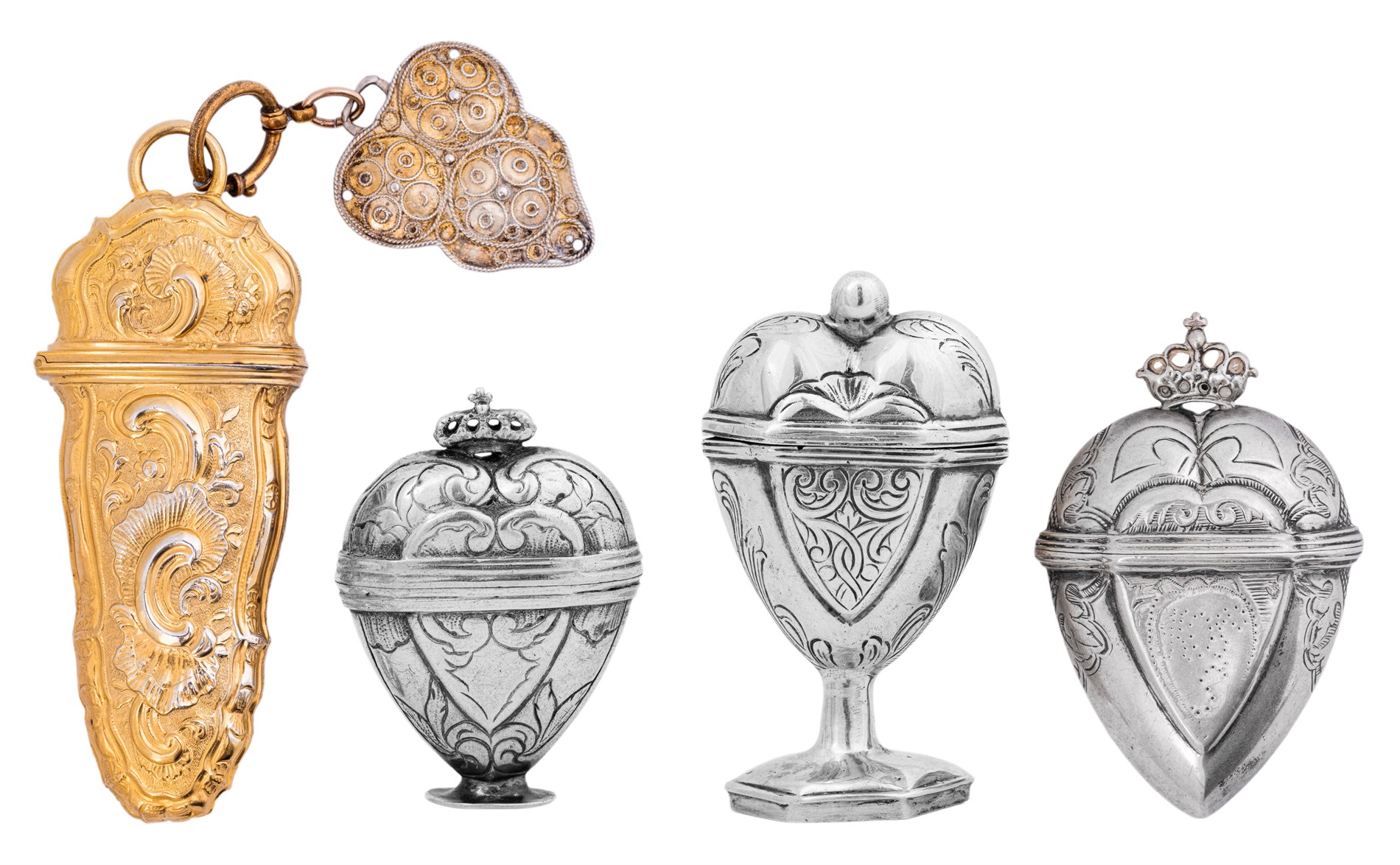 Hjerteformet luktevanshus på oval fot, lokk med krone, drevet med regence dekor, innvendig forgyldt, mesterstempel, 1700 tallet første halvdel ant. Bergen