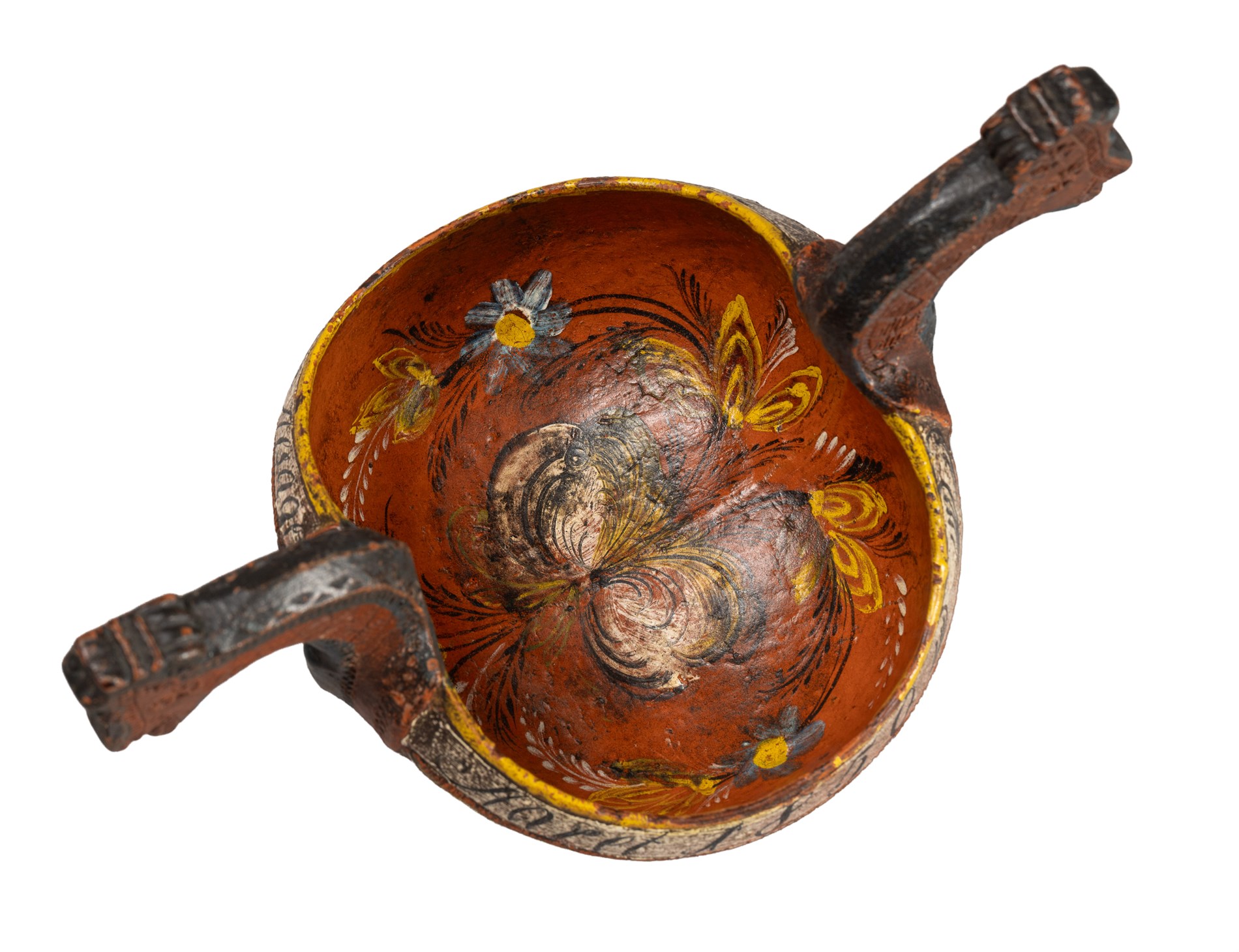 Antagelig en 1700 talls kjenge som er senere dekorert. 23 x 13 x 14 cm, Påskrift: Tomas Torgiersen Alsager Aaret 1850