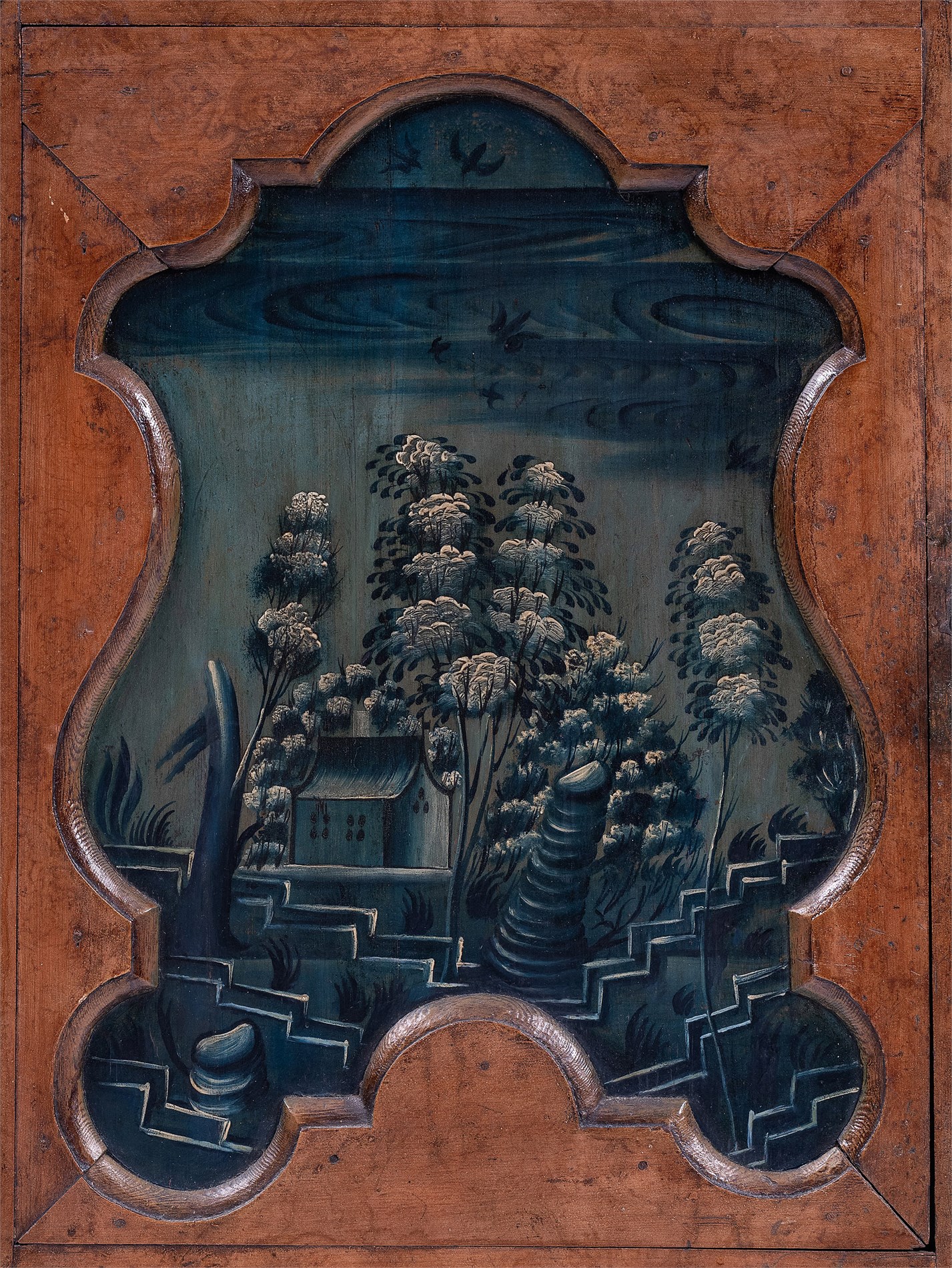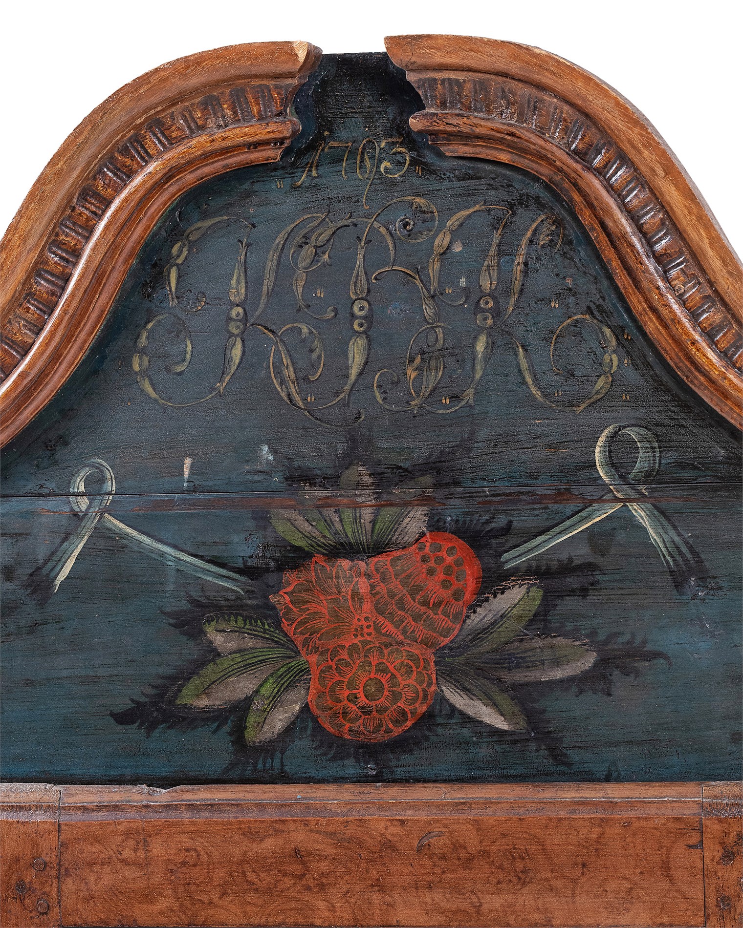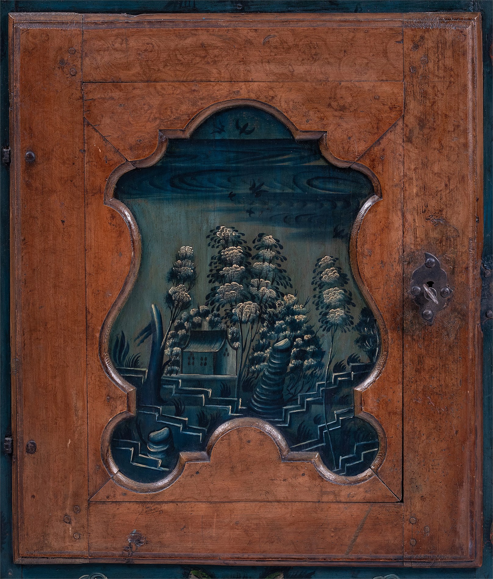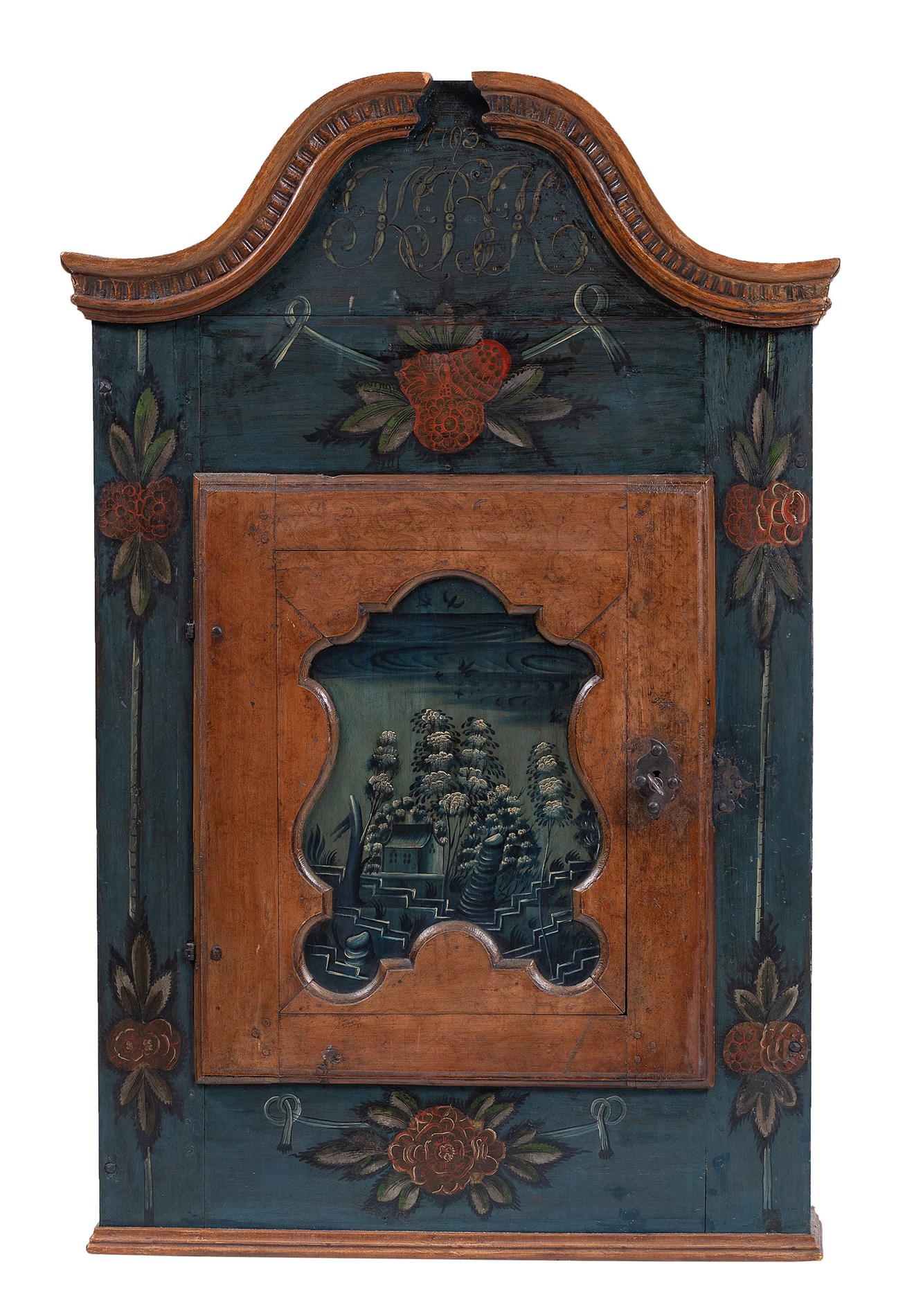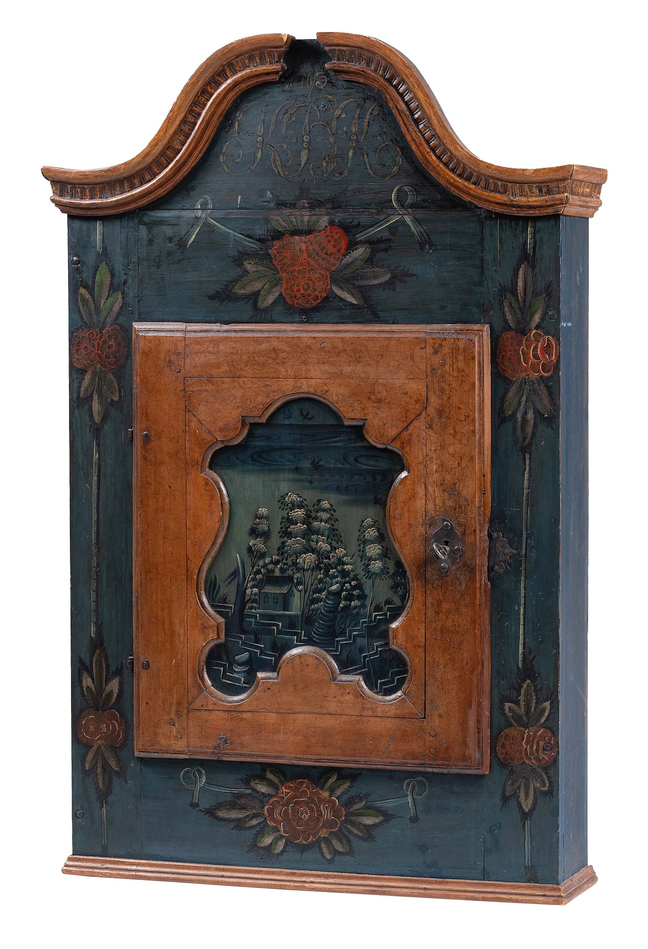 Hengeskap rosemalt av Ola Hermundsson Berge (1768-1825). Dør med formet speilfylling med rosemalt norsk kineseridekor og omramming med draperinger og lenker med blomsterosetter i Louis XVI-stil. Valdres, anno 1793. Avbildet i Rosemaling i Valdres, Nils Ellingsgard 2001, s. 94.