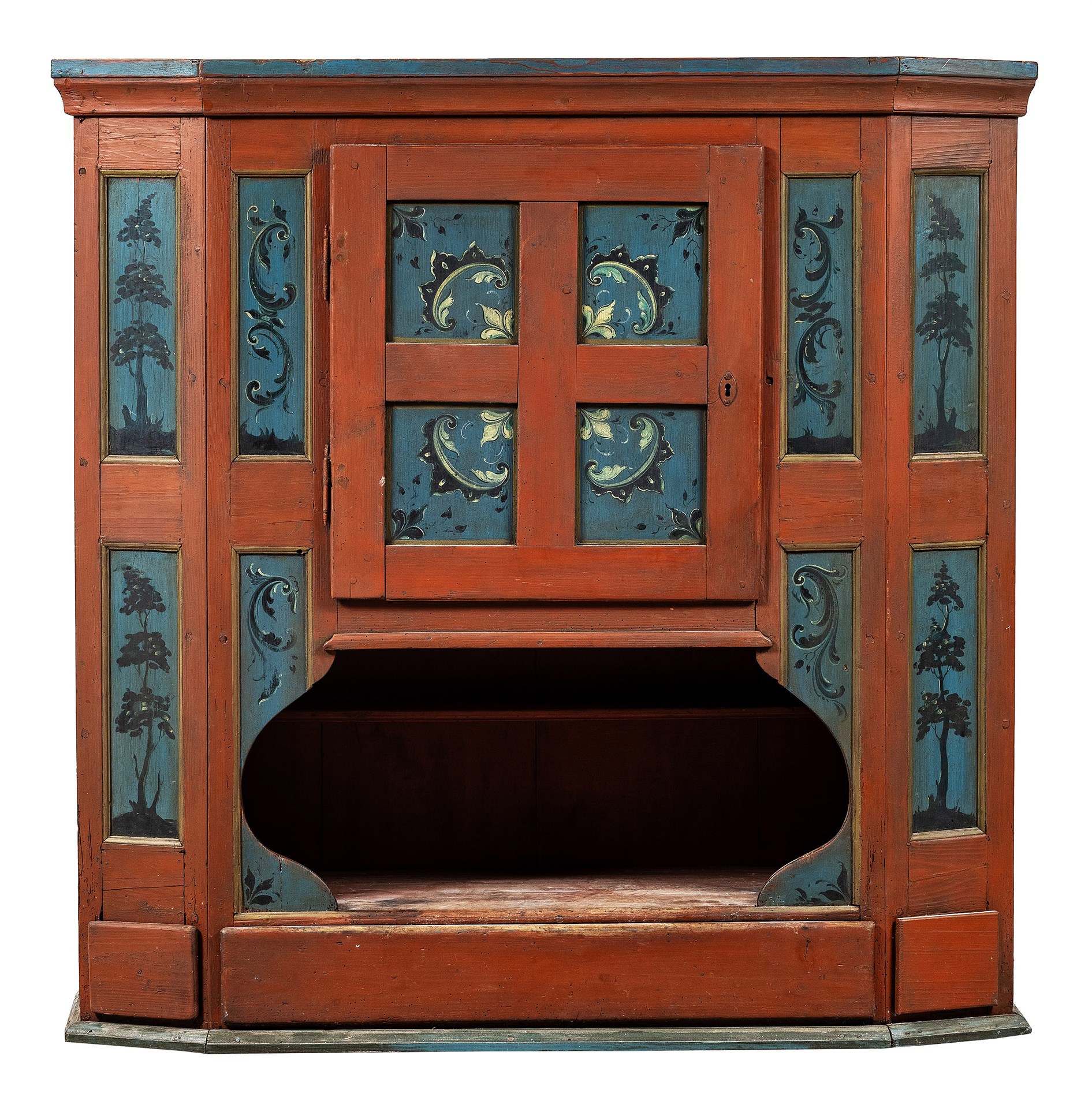 1700-talls overskap med skårede fyllinger og sprang nede, med sekundærmalt dekor i rokokkostil