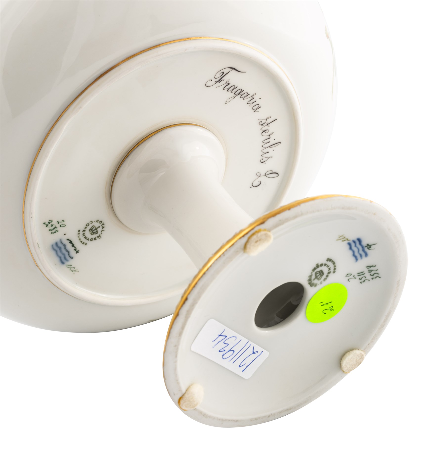 Royal Copenhagen, stettefat, håndmalt og gullstafert porselen. Motiv av fragaria sterilis; tepperot. Høyde 13,5 diameter 20 cm. 20/3588