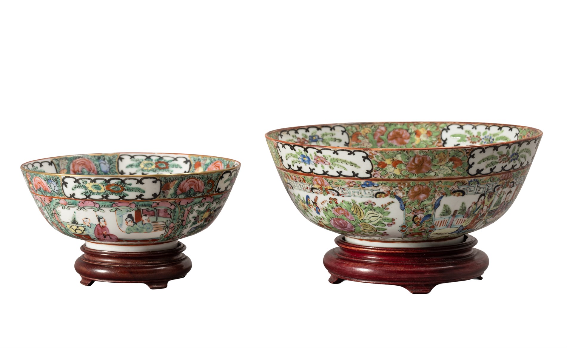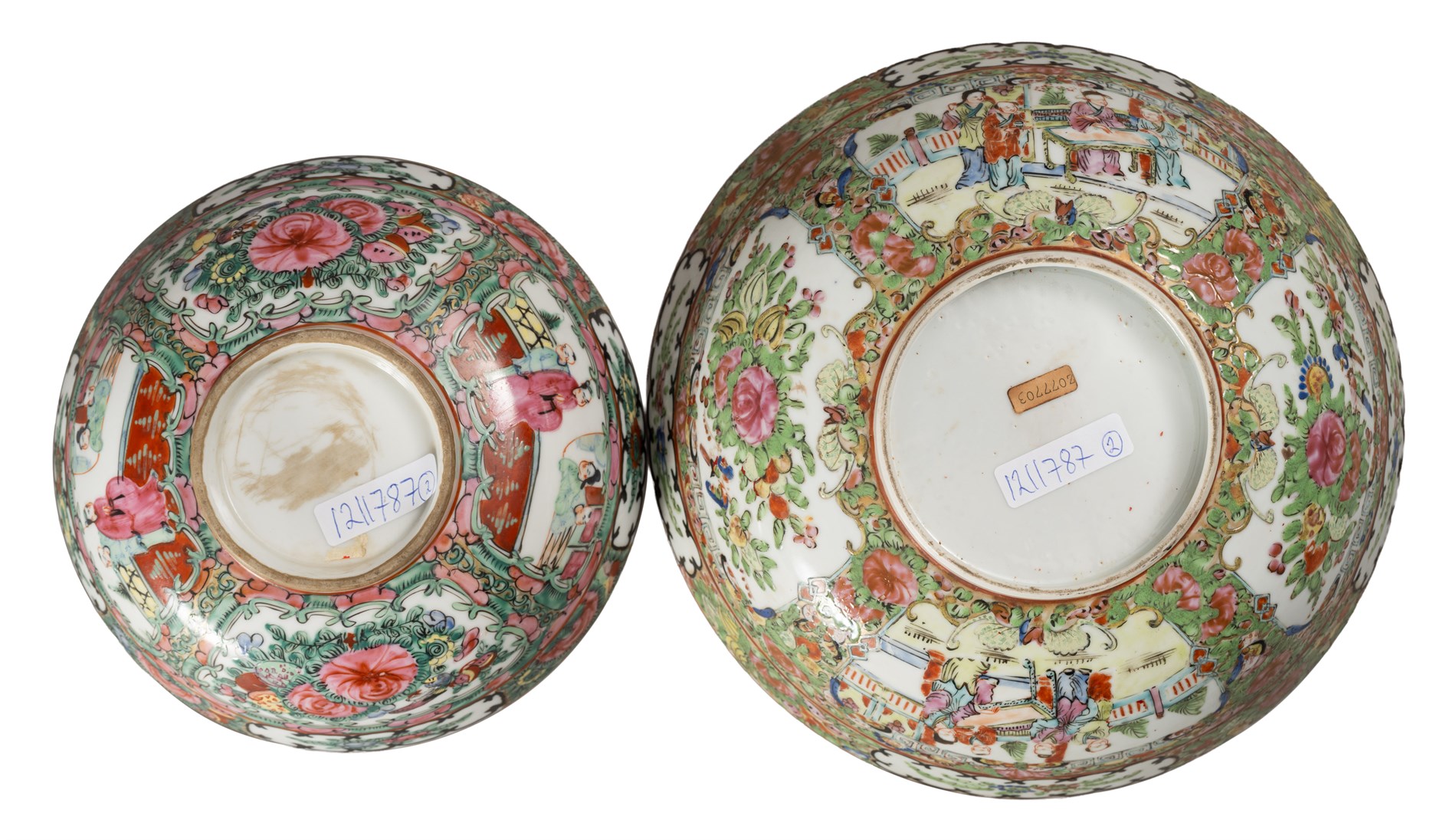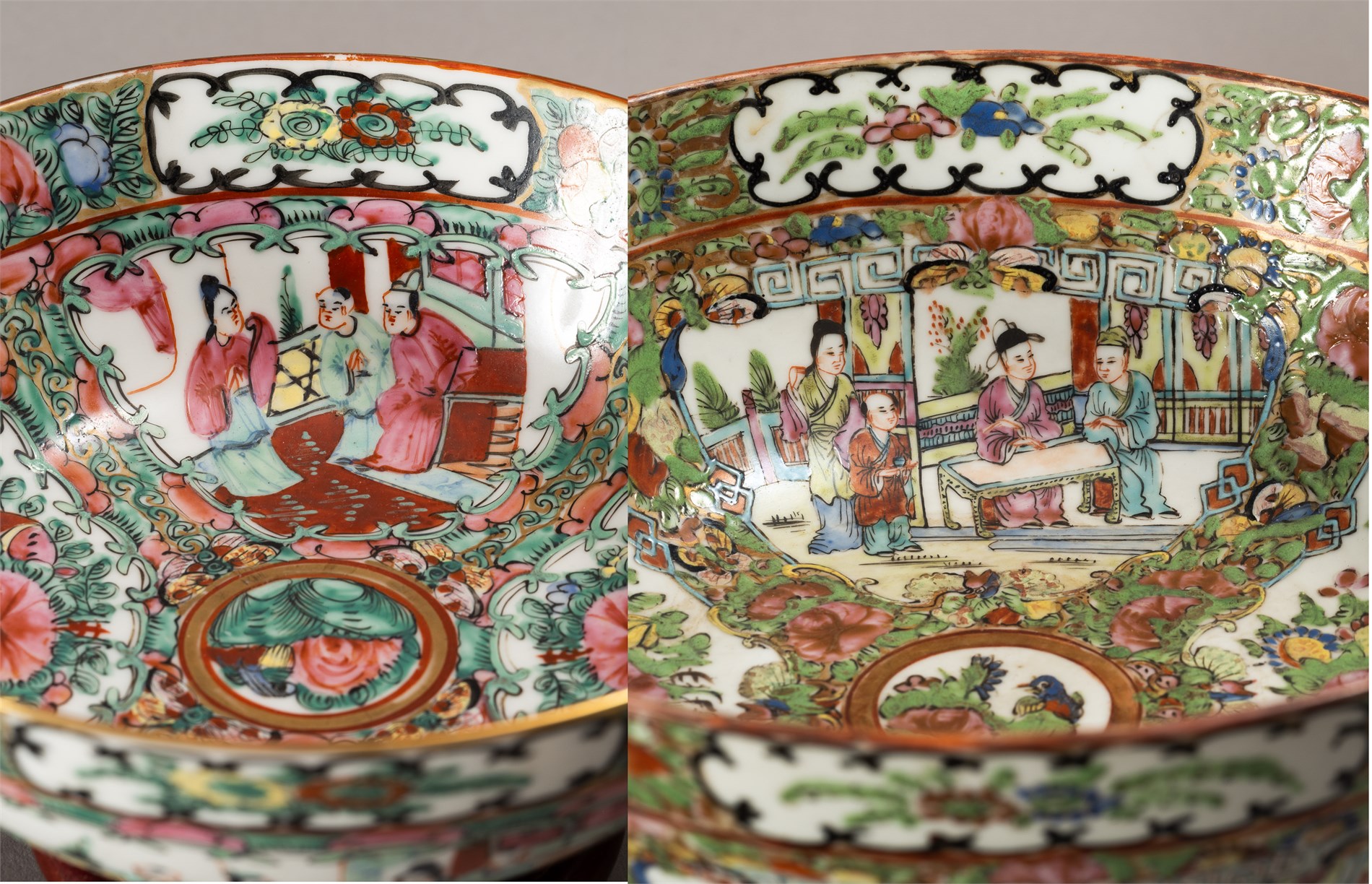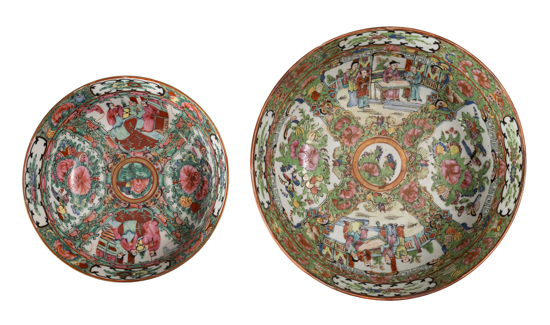 Porselen, canton emalje, 1900 Guangxu, liten ø: 18 cm, stor ø: 23 cm