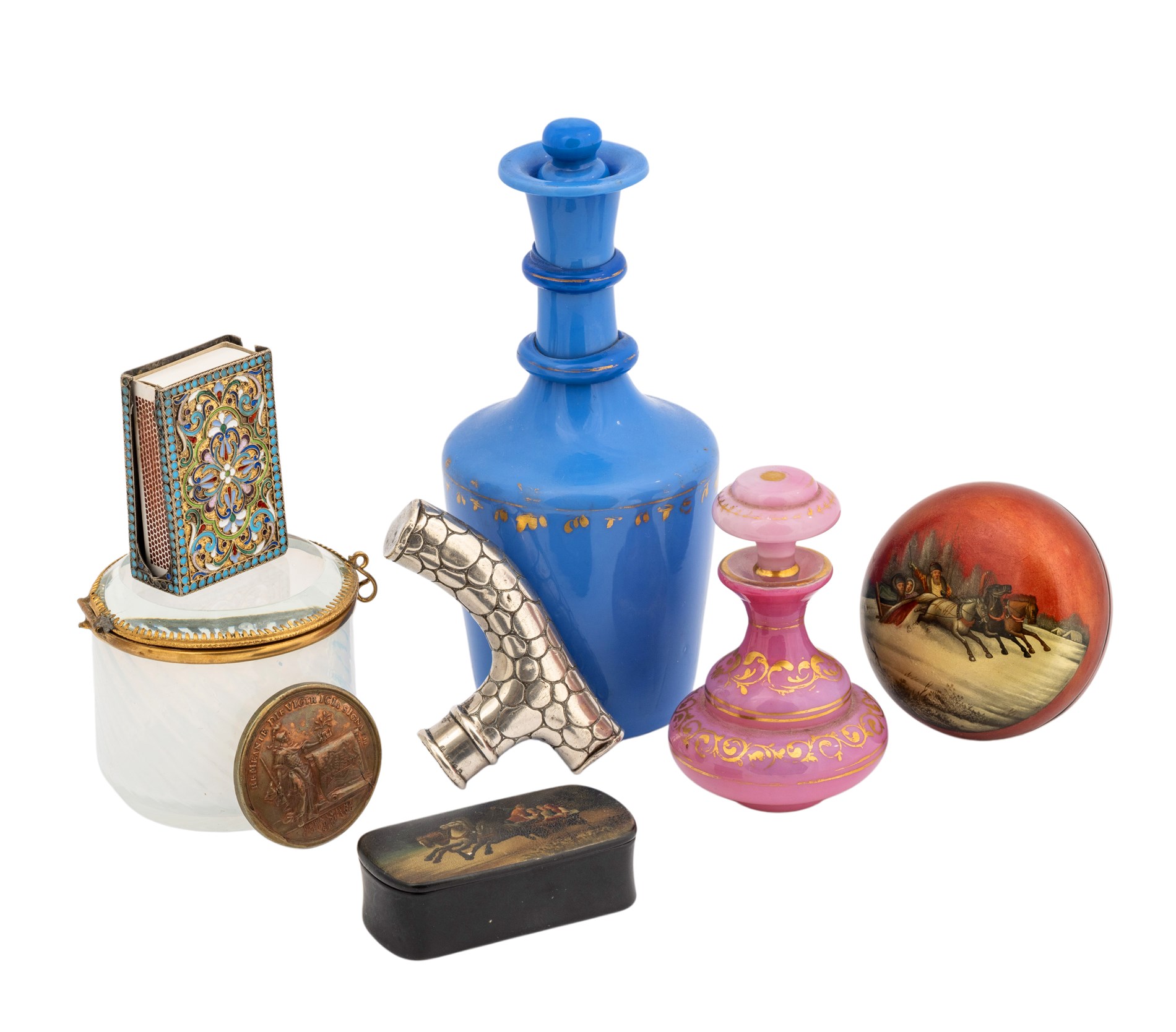 2 flakanger, rosa opalinglass med gulldekor H: 10 cm og stor flakong i lavendel opelinglass med gulldekor H:17 samt dåse, opelinglass med forgyldt bronse montering Russland 1800 tallet.