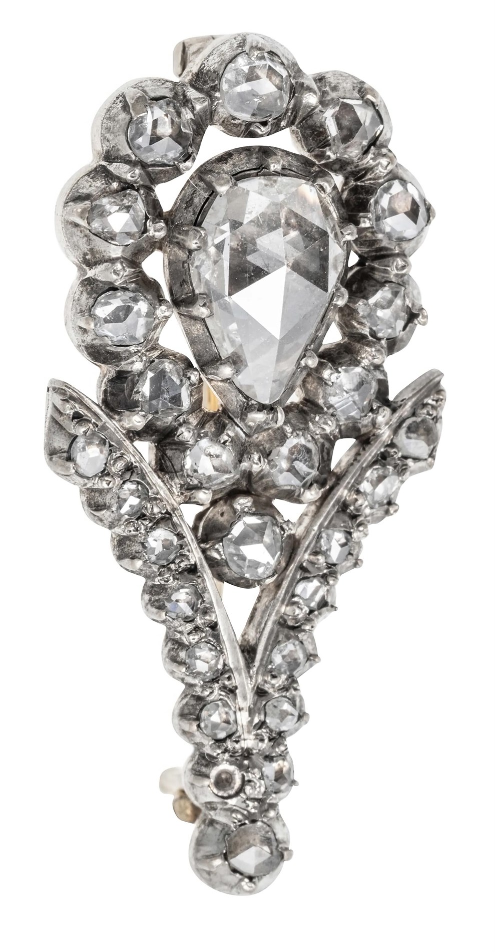 Brosje i gull og sølv med en dråpeformet diamant old cut 1 ct og 26 mindre roseslepne diamanter. Mesterstempel: JT. Tostrup.