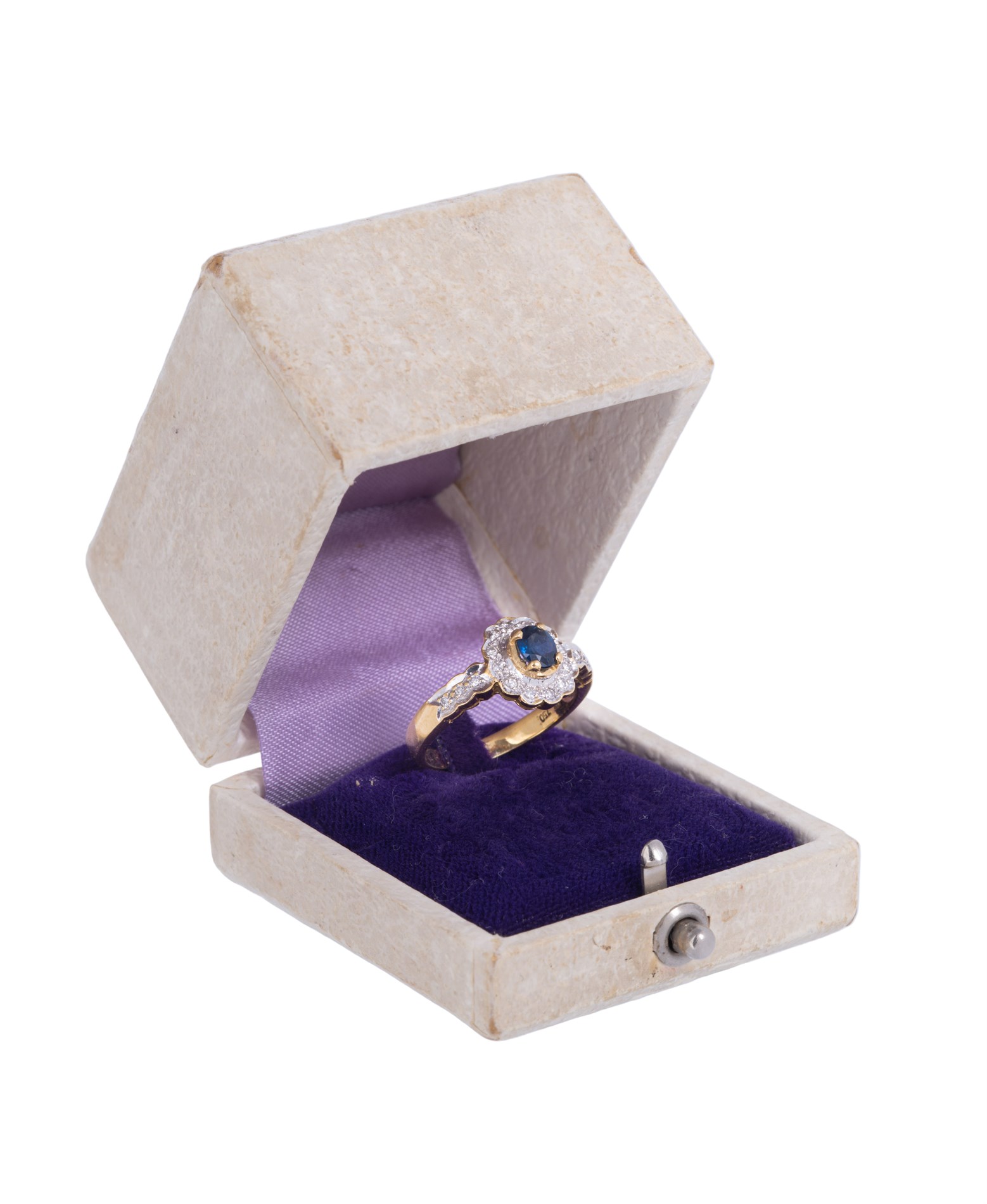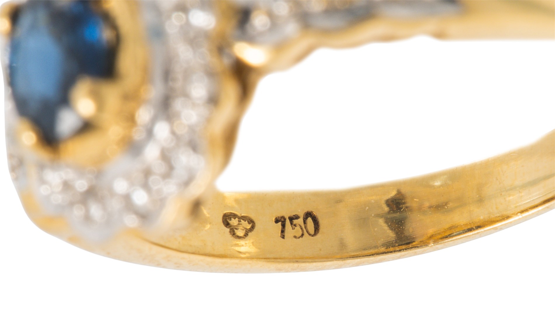 18K gull, diamanter Tot ca 0.12 ct,. safir ca 0.50 ct, Ring str 51