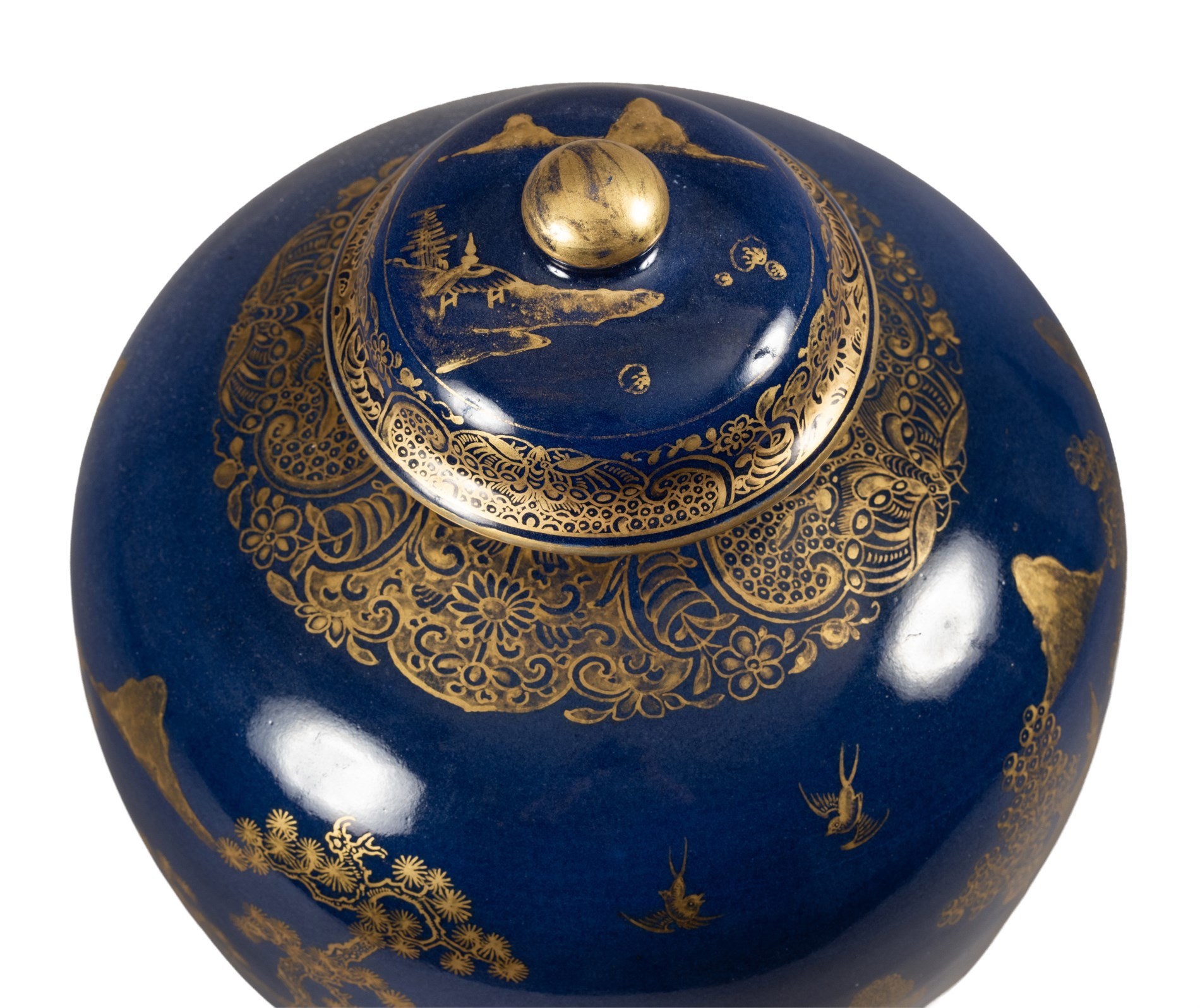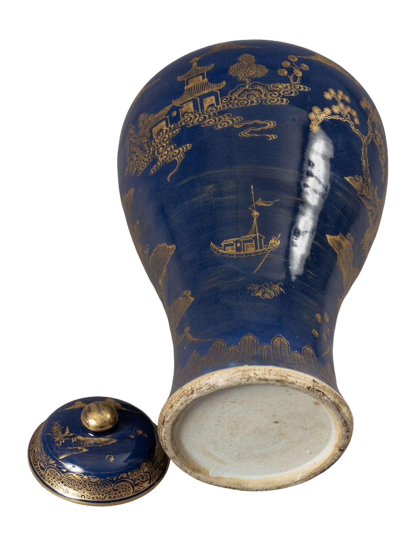 17/1800-tallet. Gullmalt med sjølandskap med pagoder.