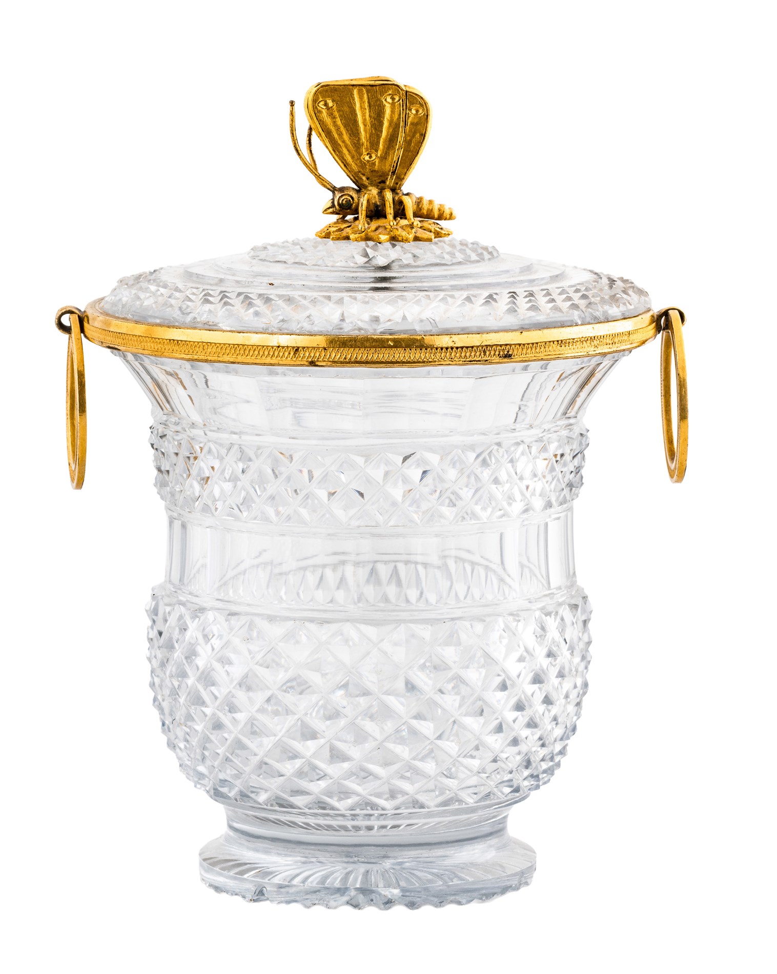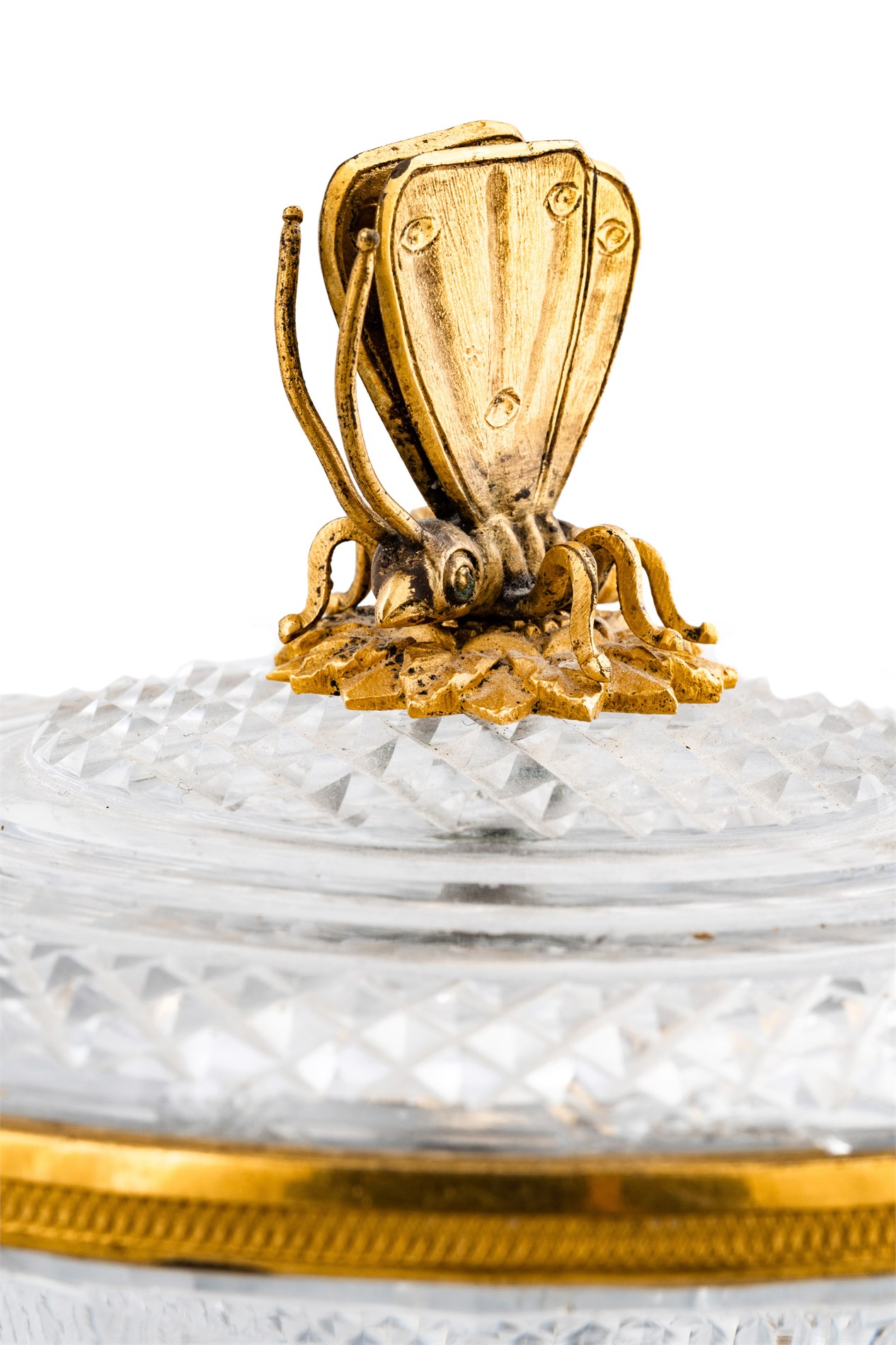 Skjærslepent glass med brennforgylte detaljer. Sommerfugl i topp og hanker for siden.