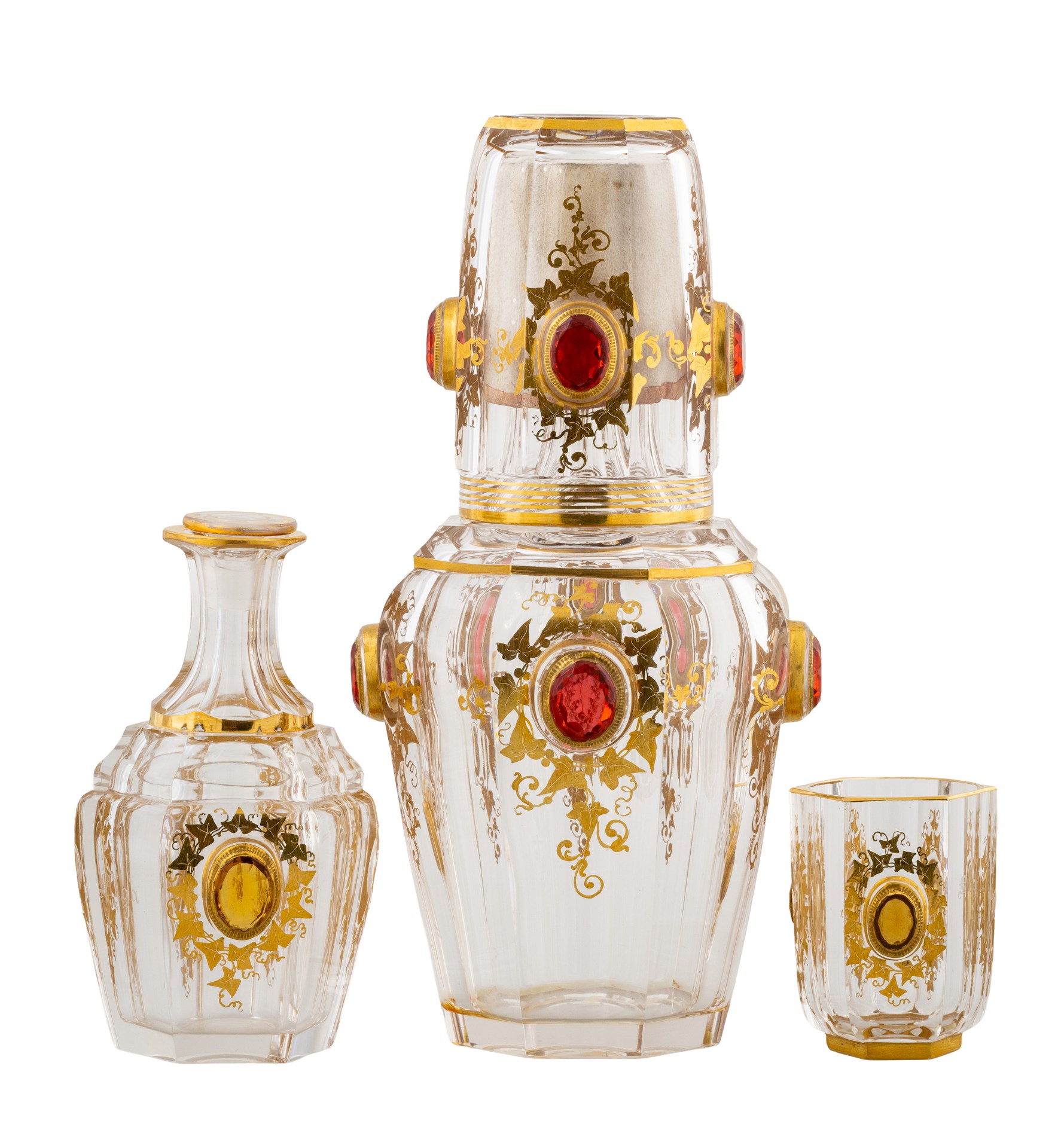 Et par forgylte og stensatte karafler med tilsvarende glass.