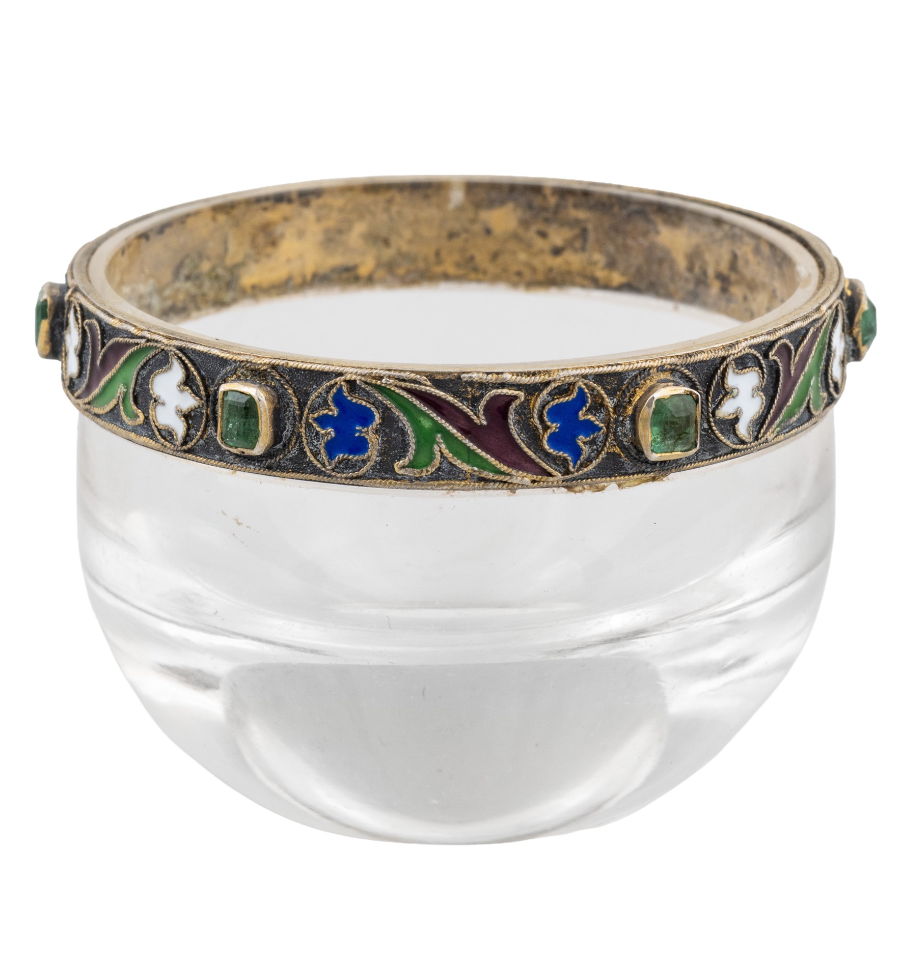 Klart glass. Montert med munningsrand i emaljert sølv med 6 fasetterte smaragder.