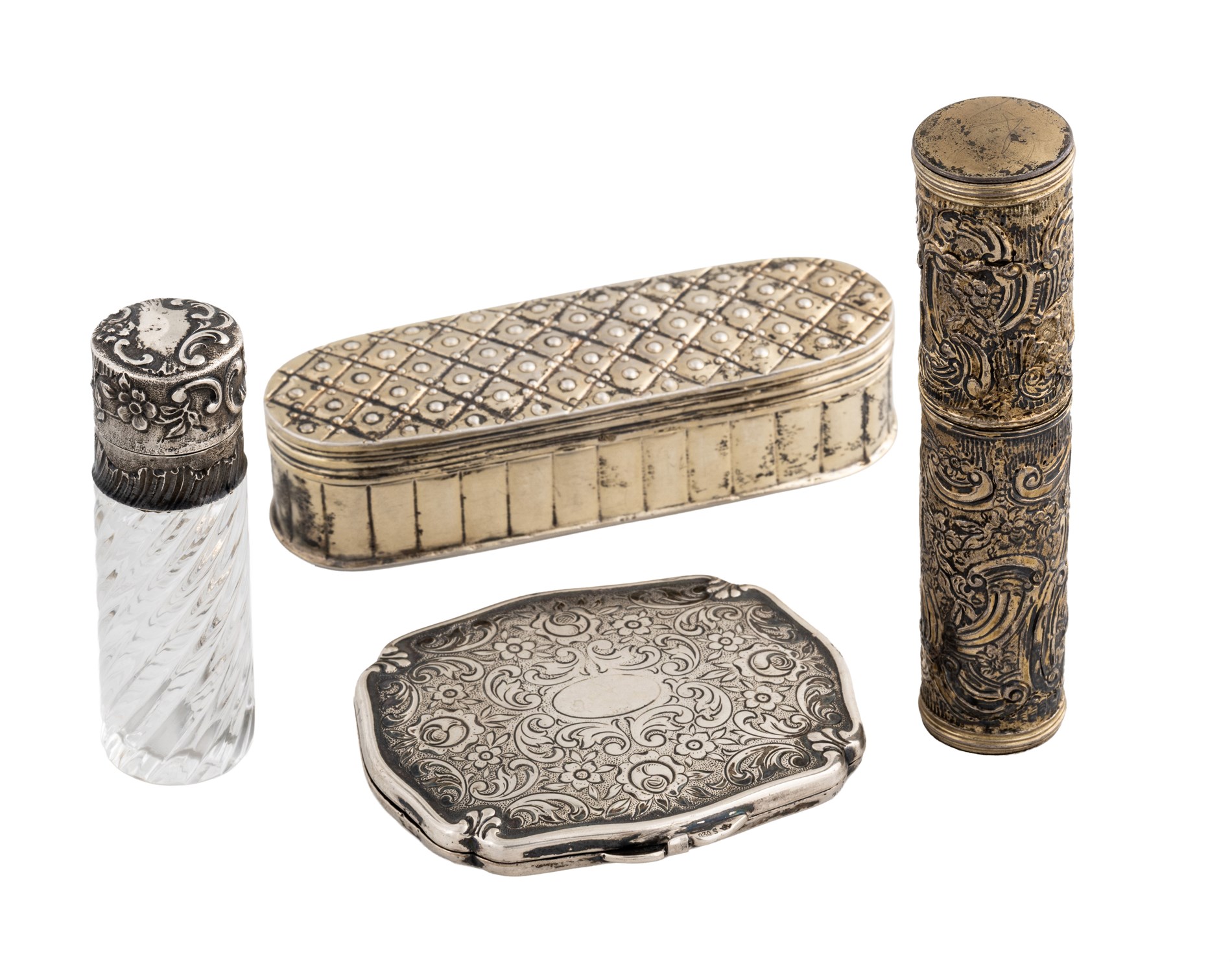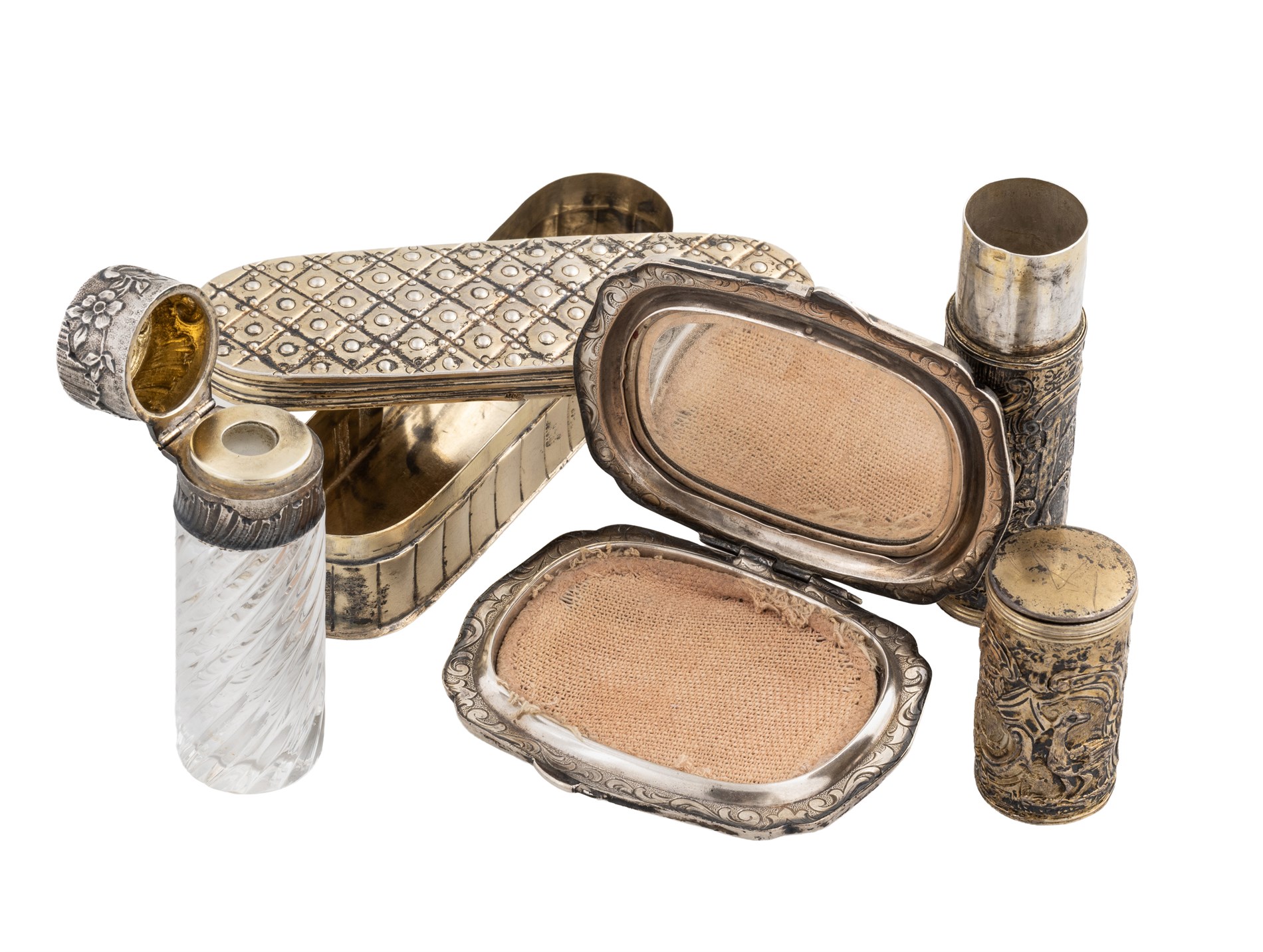 Fire objekter i forsølvede utførelser. Pudderdåse med speil, eske, parfymeflakong og futteral.