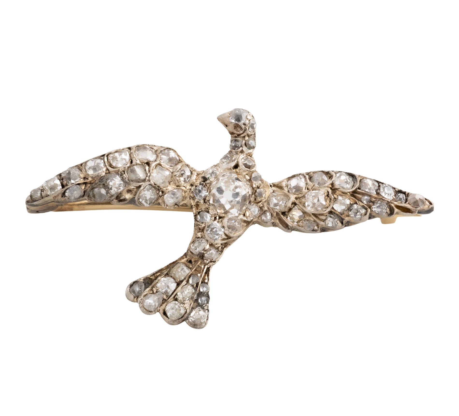 Utført i sølv og gull. Fattet med old cut diamanter.