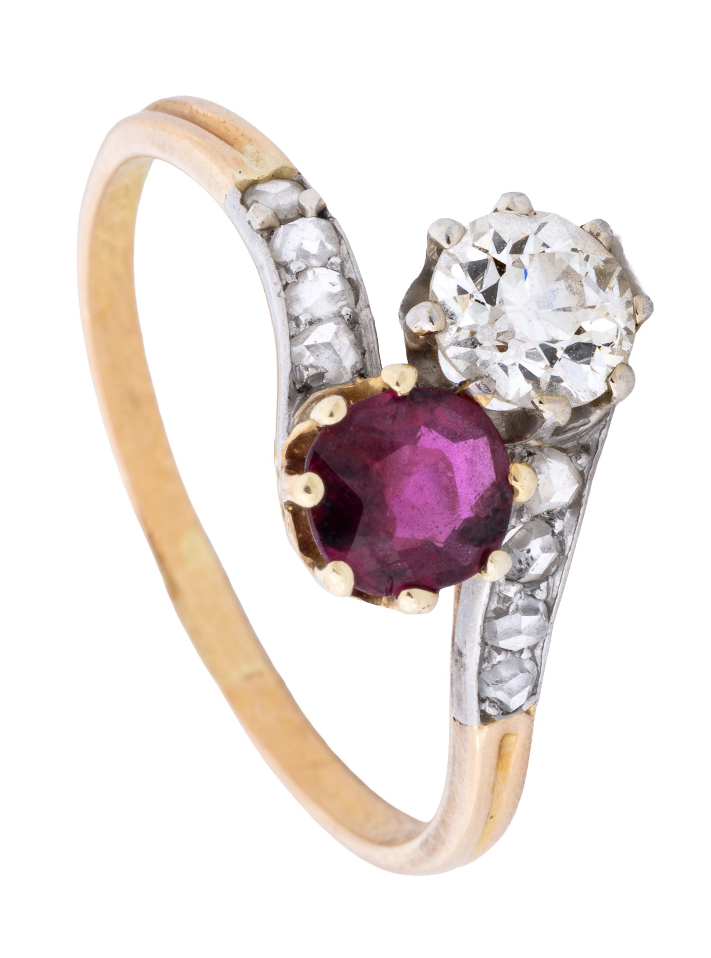 Tvillingring fattet med rubin, old cut diamant og åtte stk. rose cut sidestener.