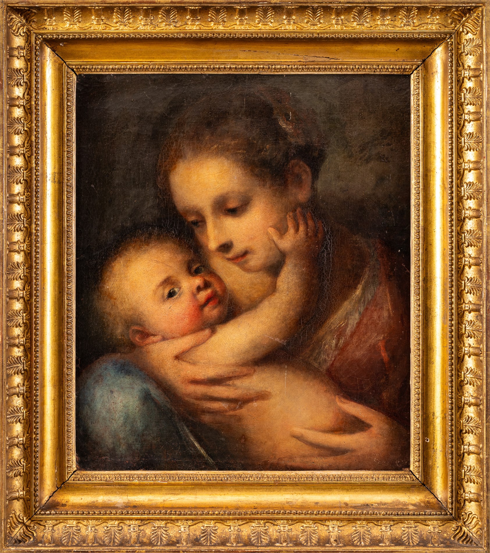 Madonna med barnet, olje på lerret dublert på lerret, 55 x 47 cm, usignert