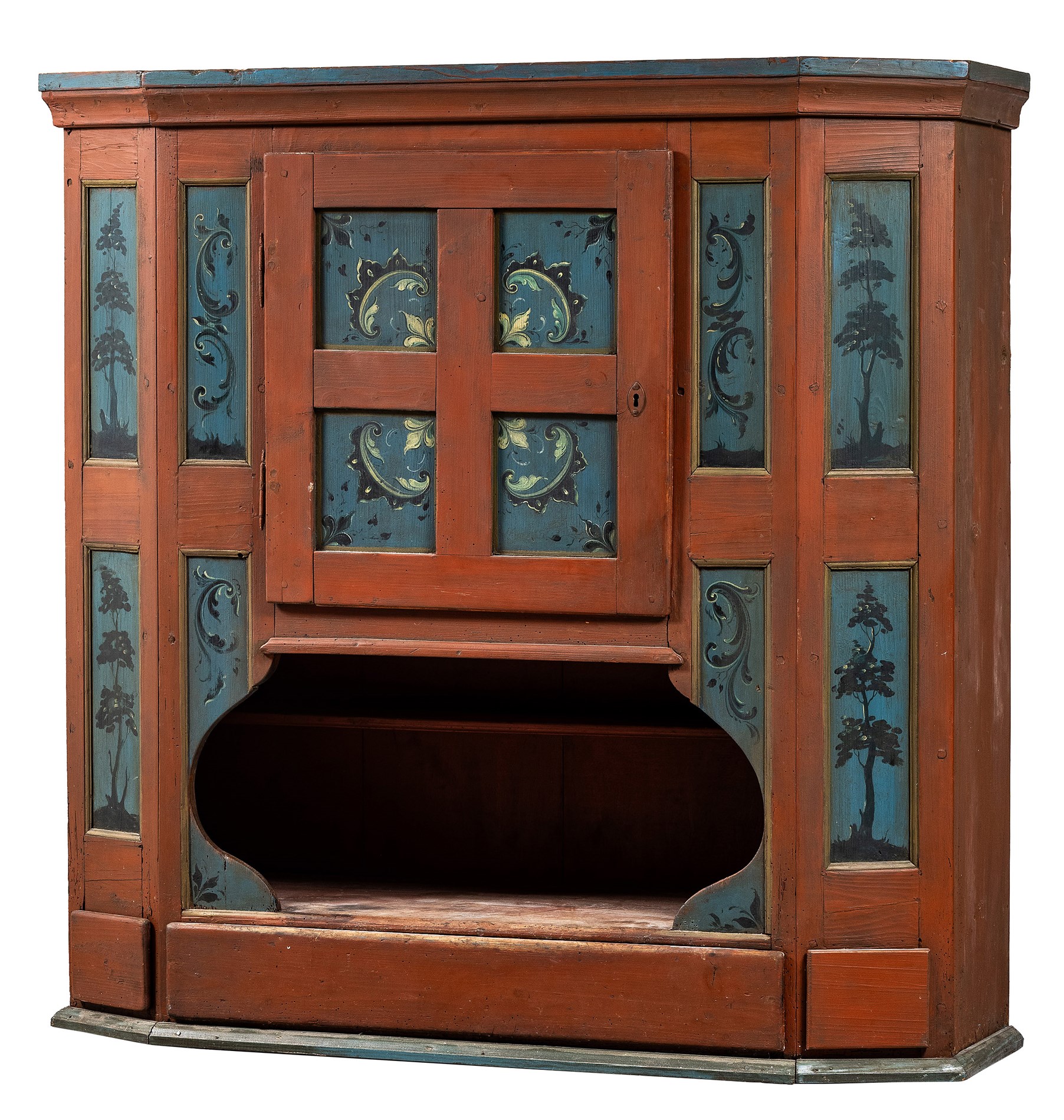 1700-talls overskap med skårede fyllinger og sprang nede, med sekundærmalt dekor i rokokkostil