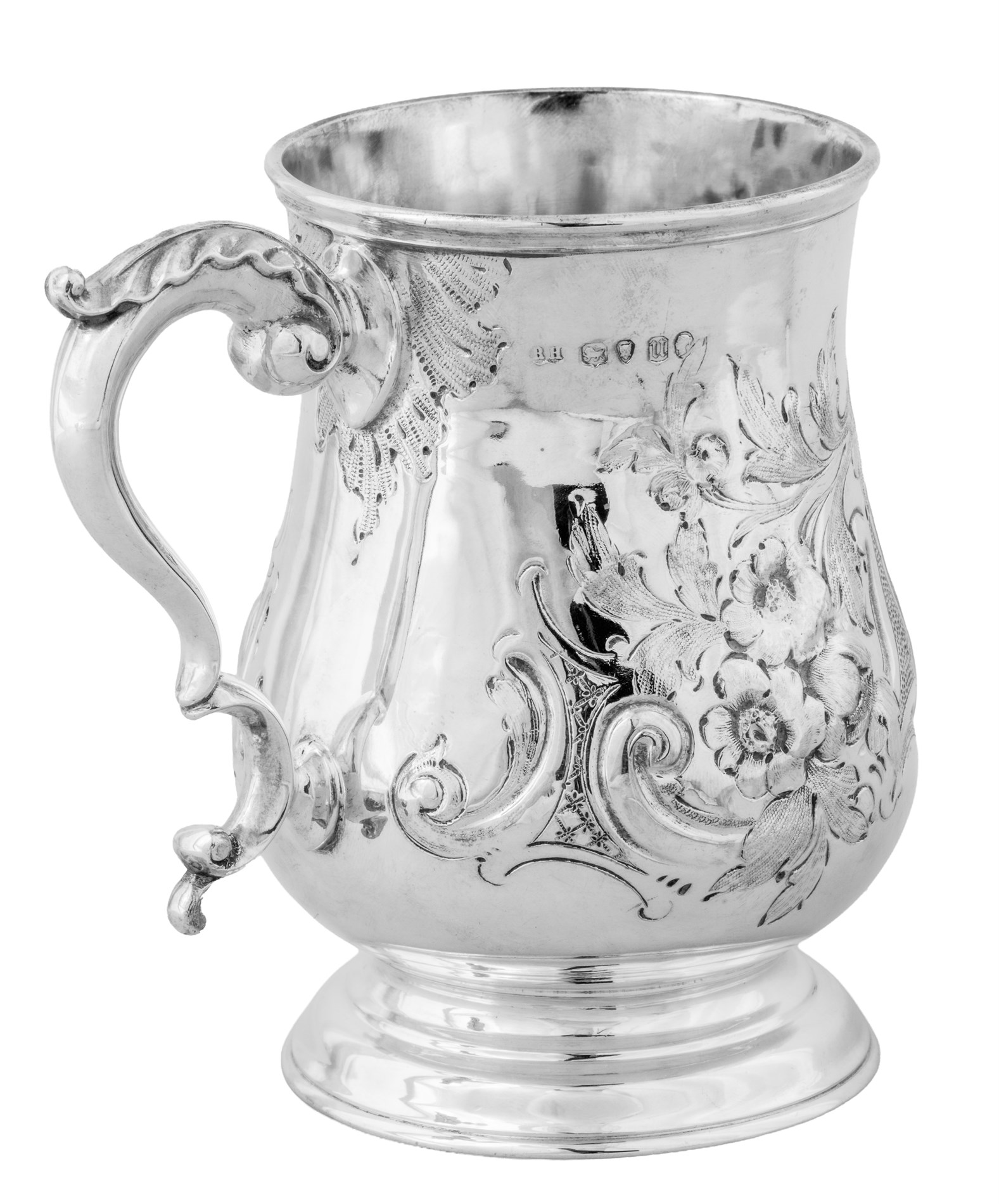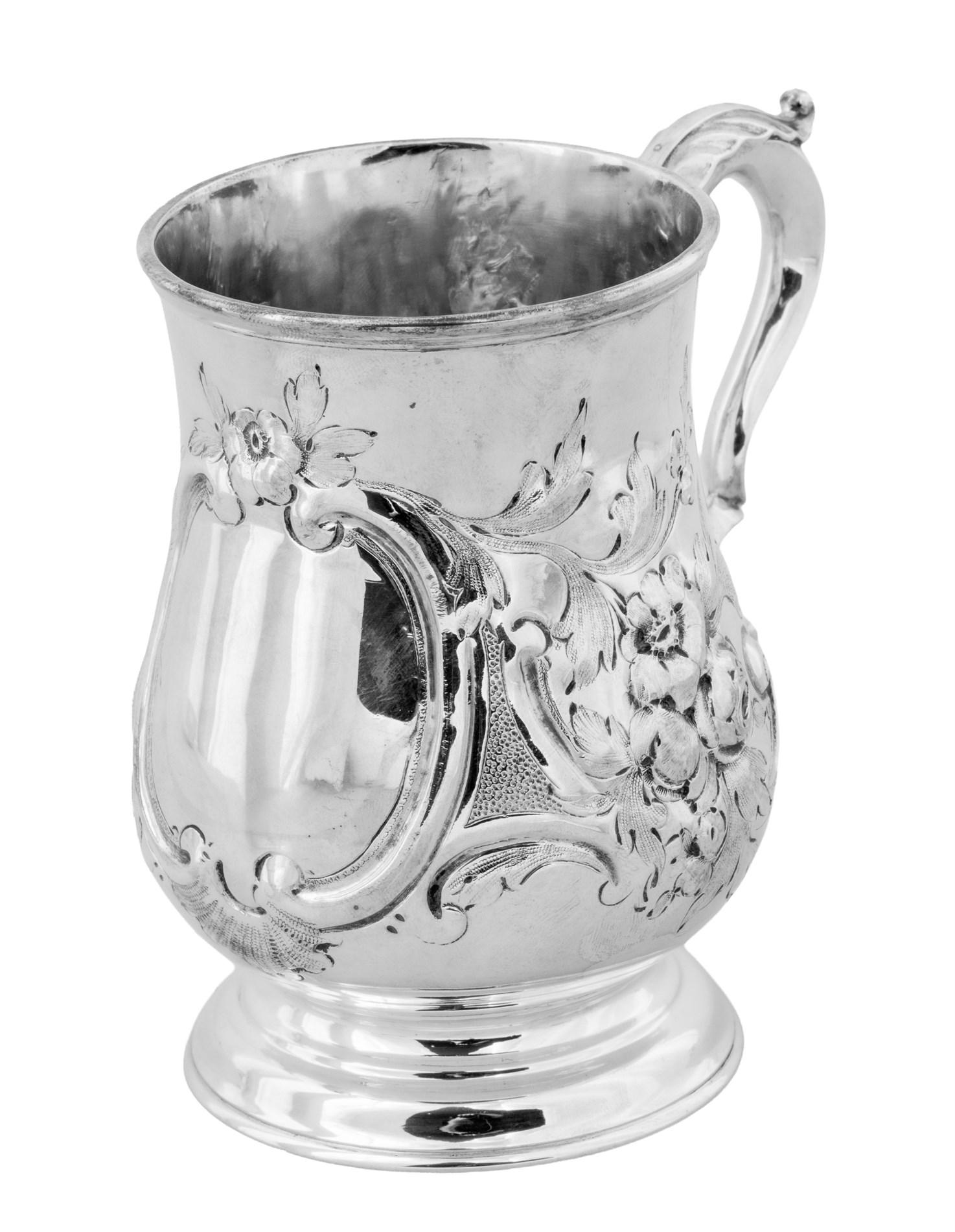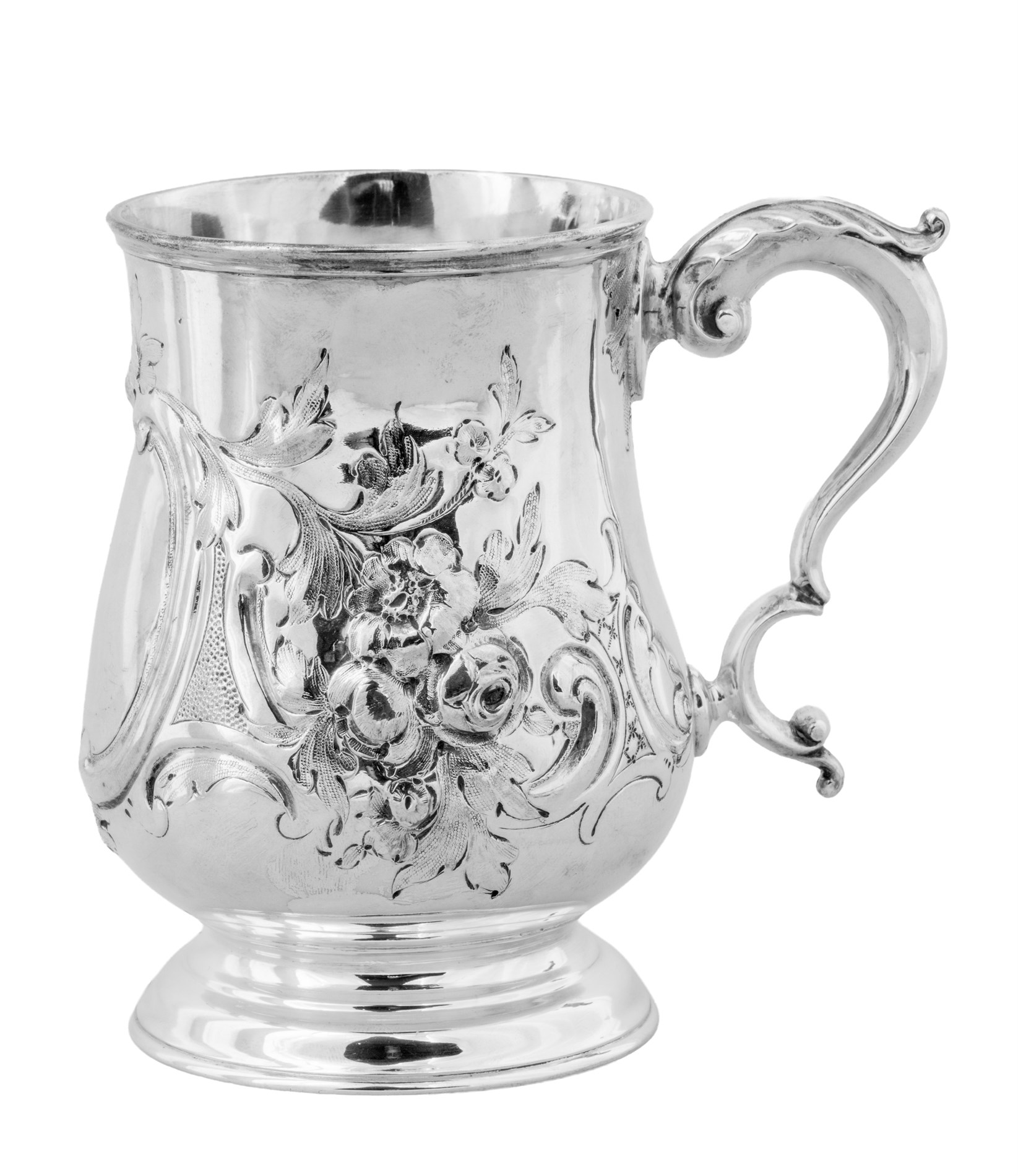Sølv drikkekrus med hank, siselert og drevet dekor.