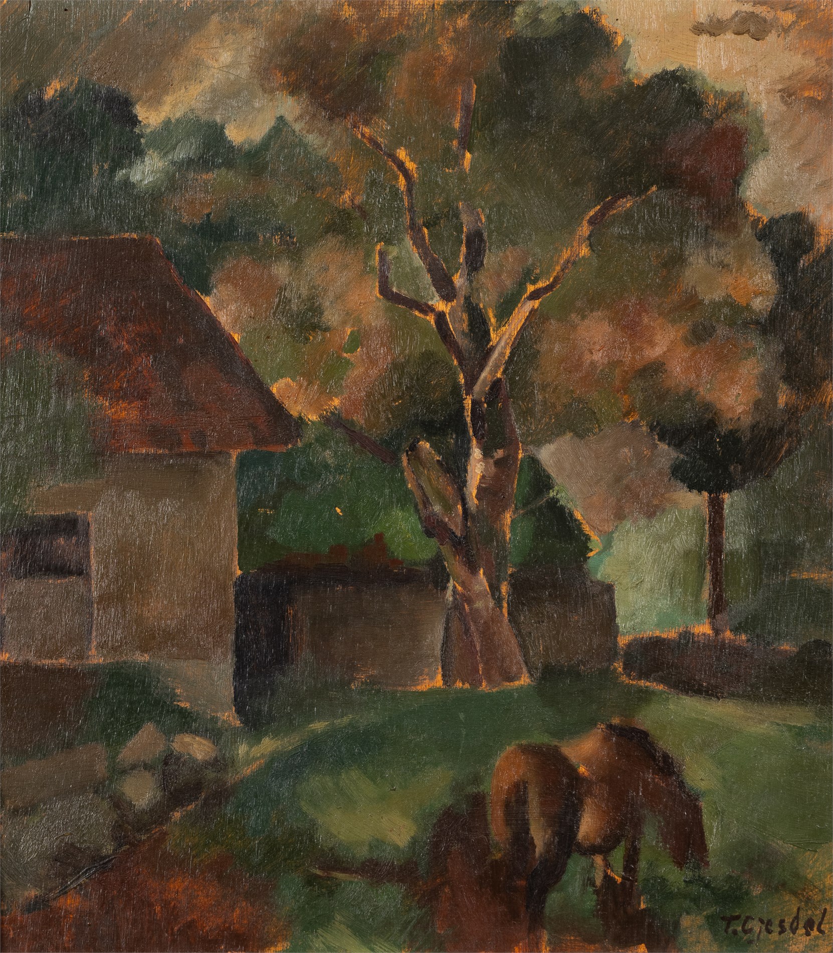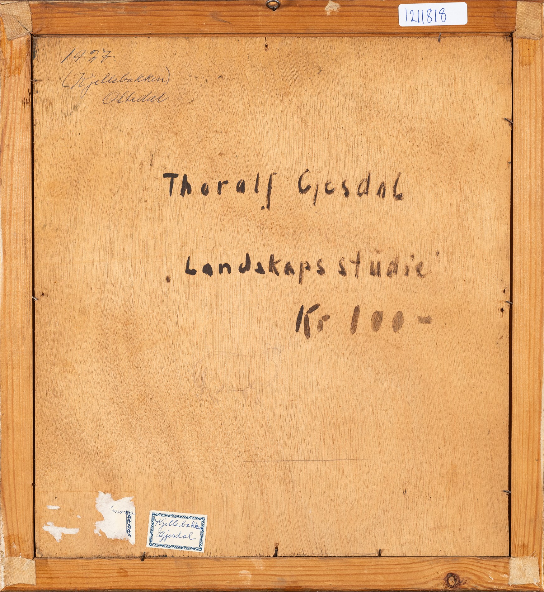 "Landskapsstudie", Olje på plate, 30,5 x 28 cm, Signert nede til høyre: T. Gjesdal