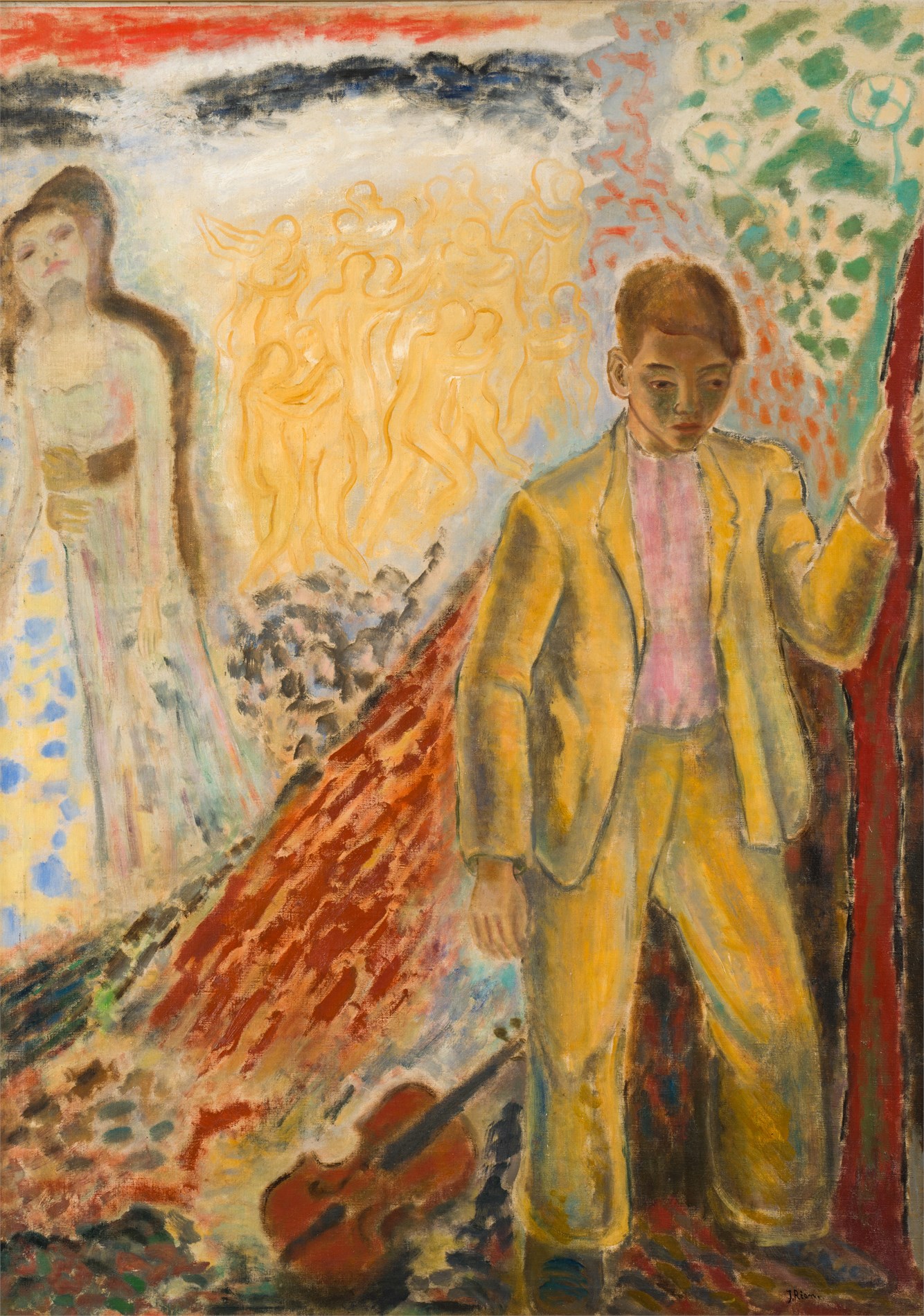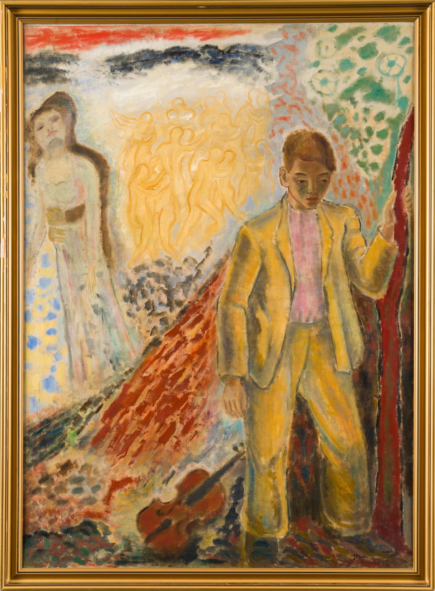 Spelleman, 1930 tallet, Olje på lerret, 113 x 81 cm, Signert nede til høyre: J Rian