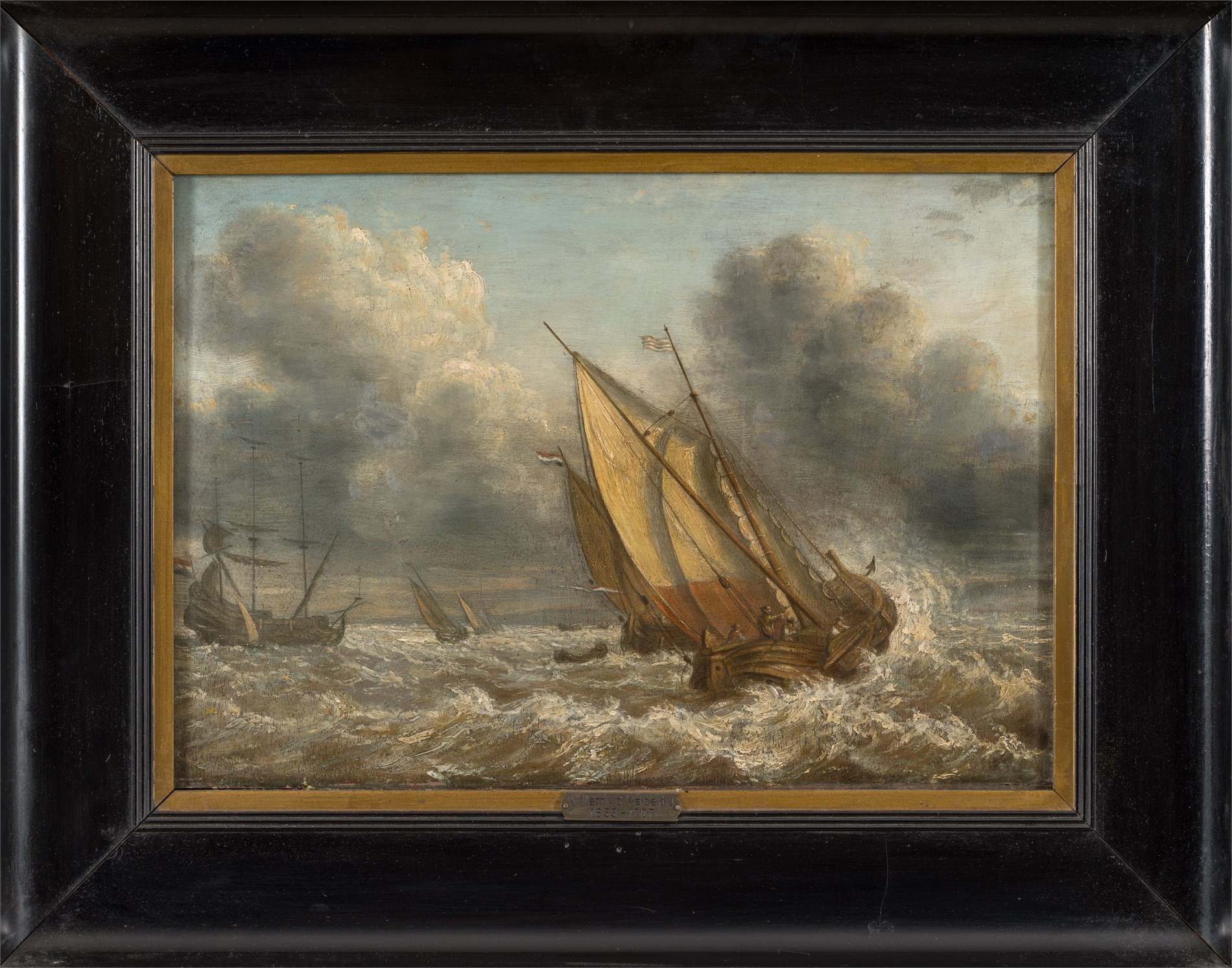 Uidentifisert kunstner, Hollandsk skole, Marine, 16/1700 tallet, Olje på plate, 33,5 x 48 cm, Usignert