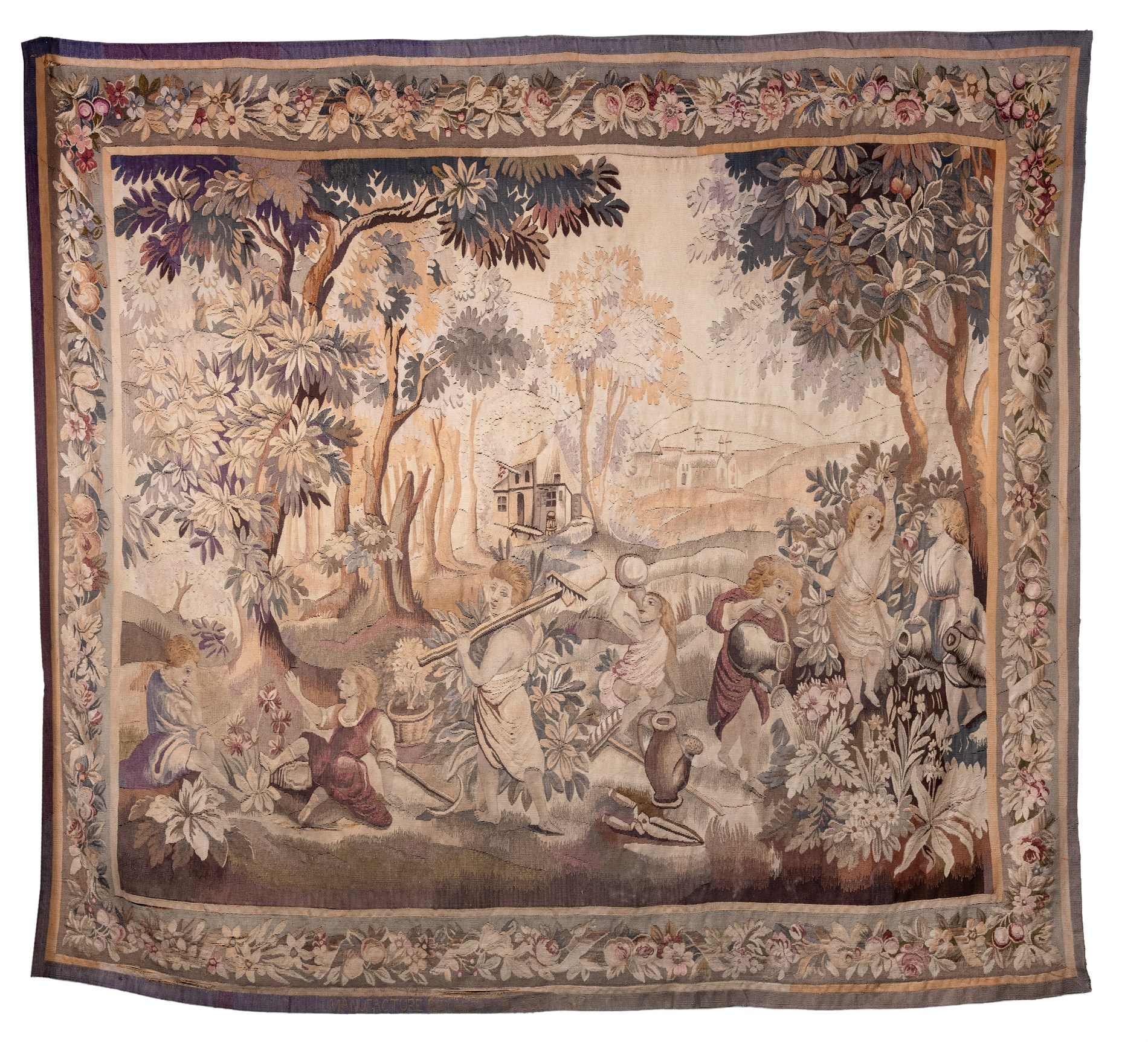 Motiv av hagescener med bønder i frodig landskap. Omramming med blomster og tvunnede bånd. Vevet inn nede: "Manufacture Royale Aubousson 1747".