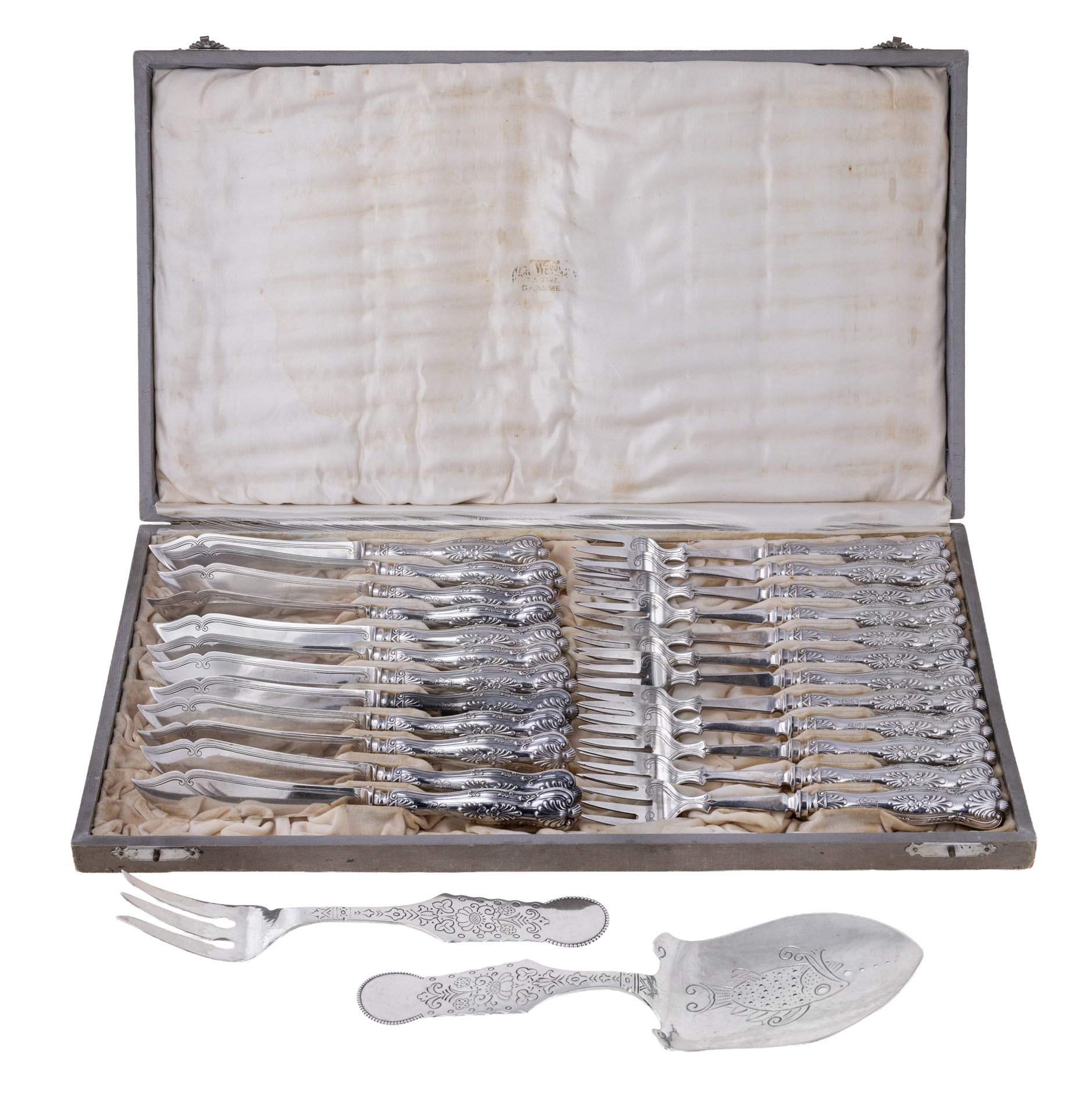 Alle deler på bestikket, inkl. blader, i sølv. Anretningsdeler med spade og gaffel i hamret og presset dekor fra David-Andersen, L: 21,5/24 cm. Fiskekniver og fiskegafler i støpt dekor i historismestil fra Carl Wessmann (Drammen 1889-1933). L: 19,5/21 cm.