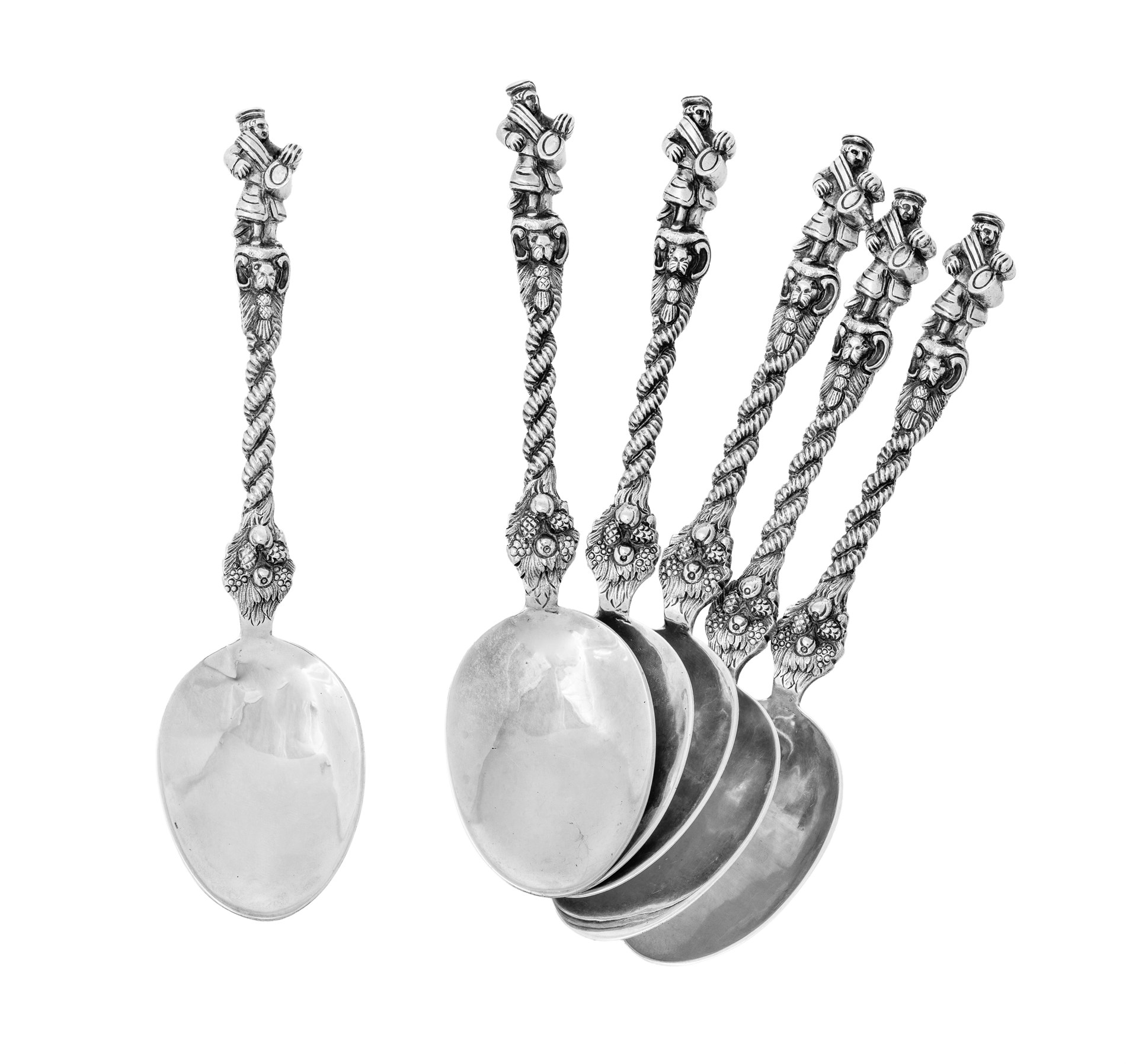 Sølv. Tysk kulturområde, 1900-tallet. 6 stk. med støpt dekor på skaft.