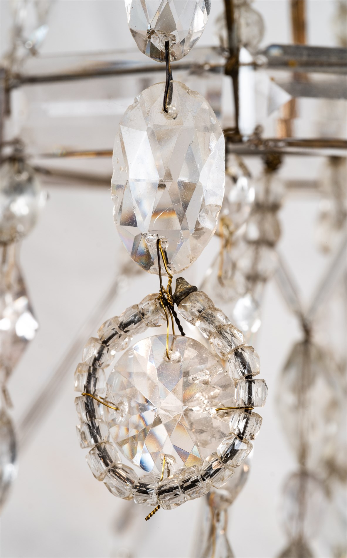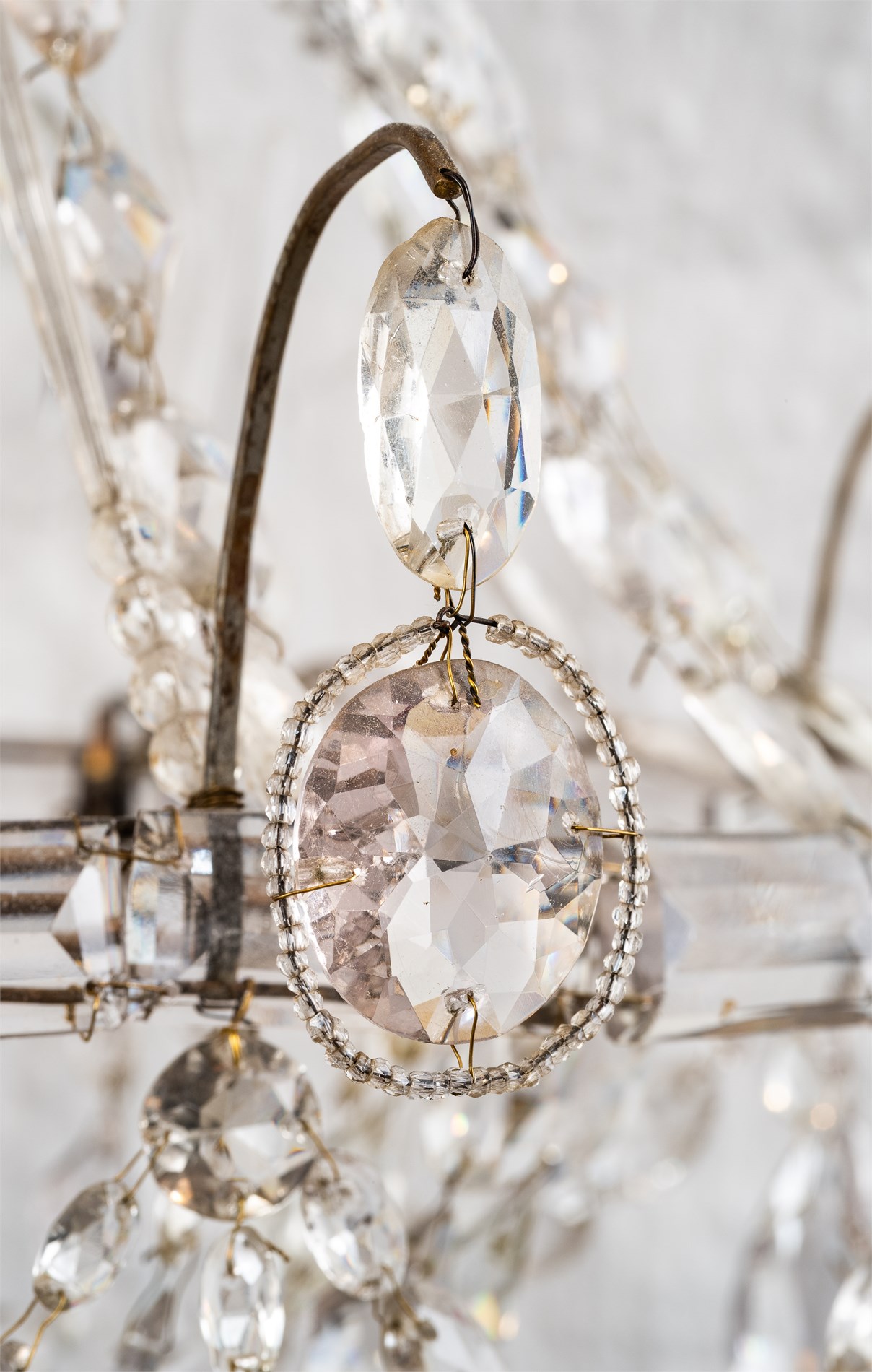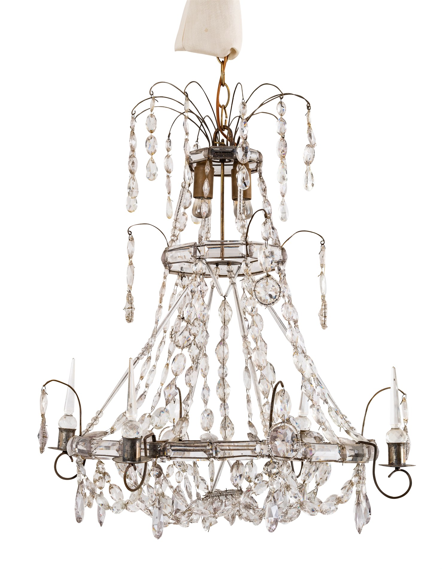 Tilnærmet komplett med prismer. Enkelte kompletteringer og senere ombundet. Fire skjærslepne spyd er løst stukket ned i lysholderne for levende lys. To elektriske fatninger oppe, sokkel til E14. Medfølgende messingkjetting og stoffpose for å skjule denne og ledning.
