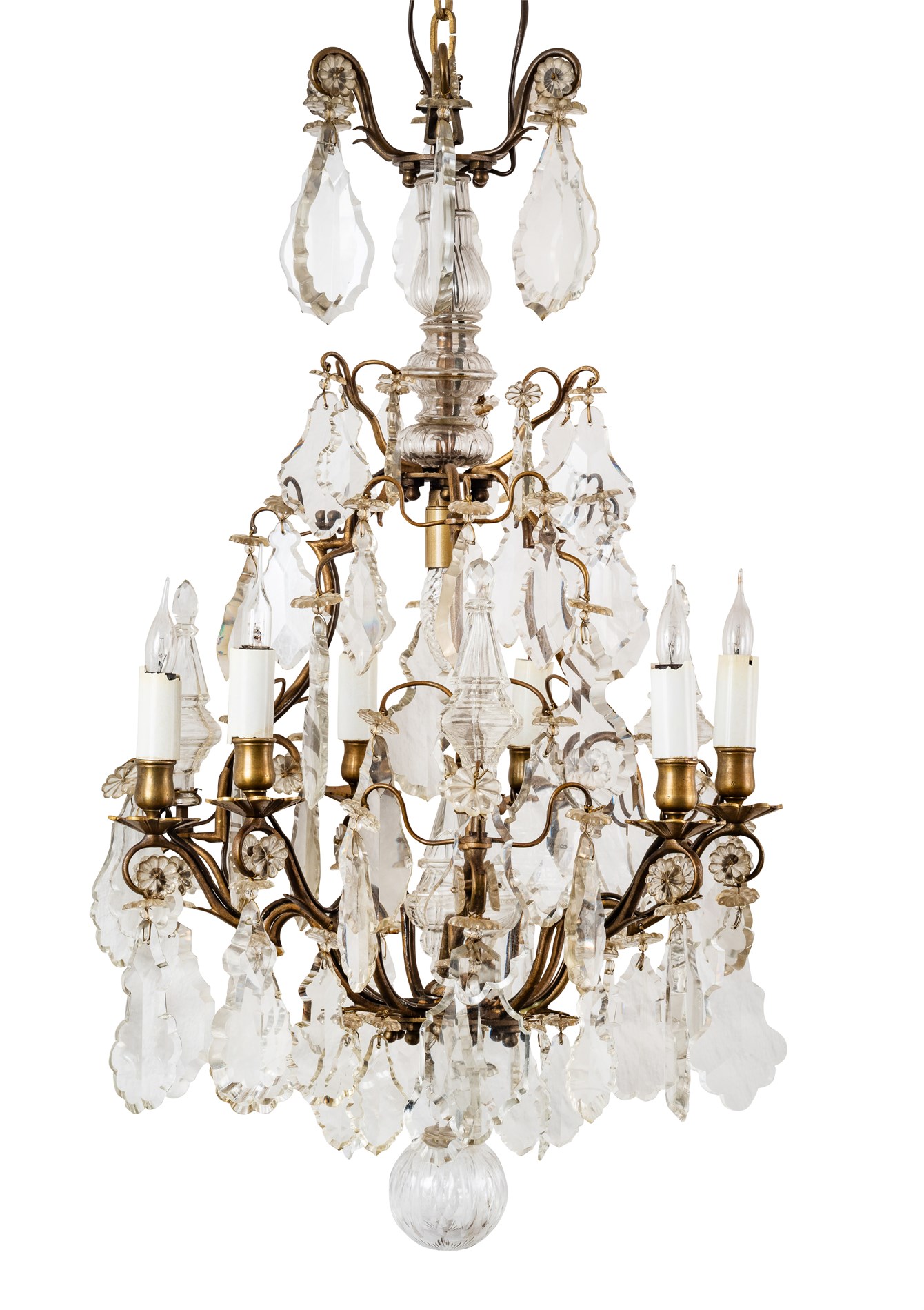 Maria-Theresa-type. Rokokko stil. 1900-tallet. Bronsepatinert messing. Rikt behengt med fasetterte og slepne prismer.
