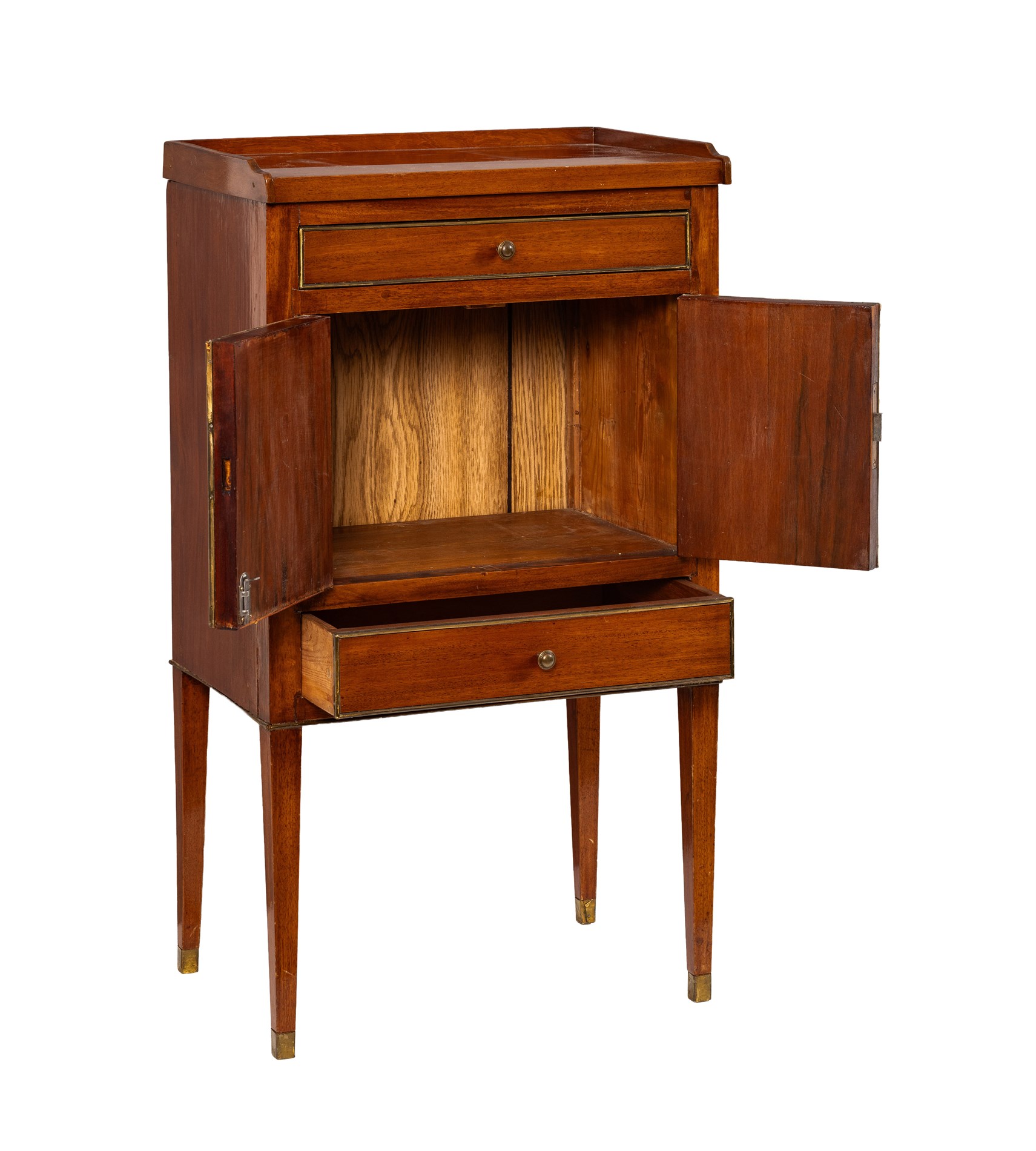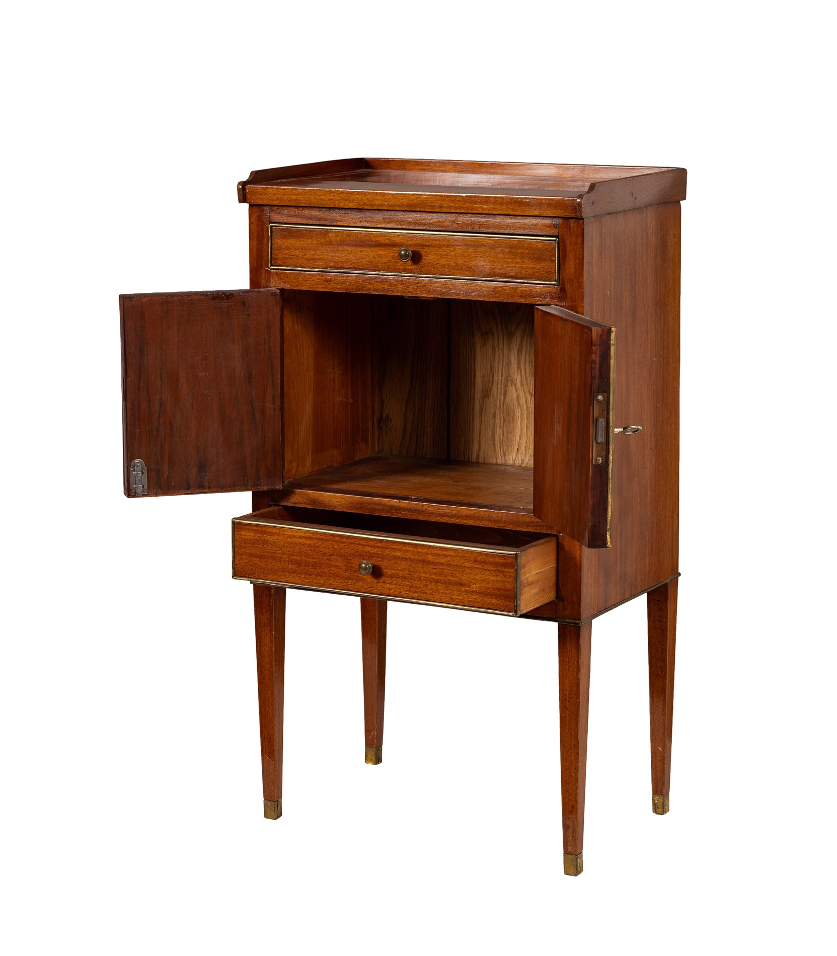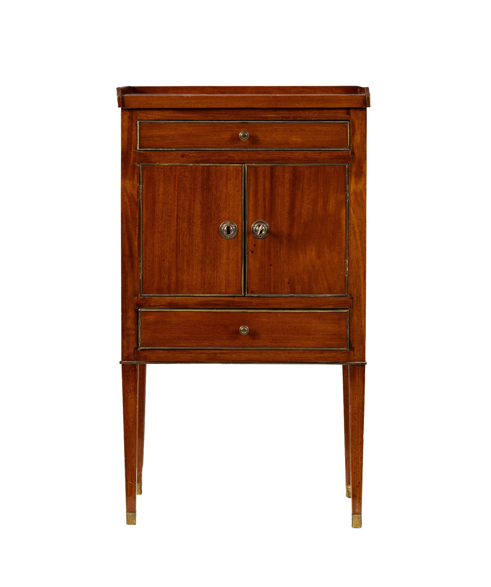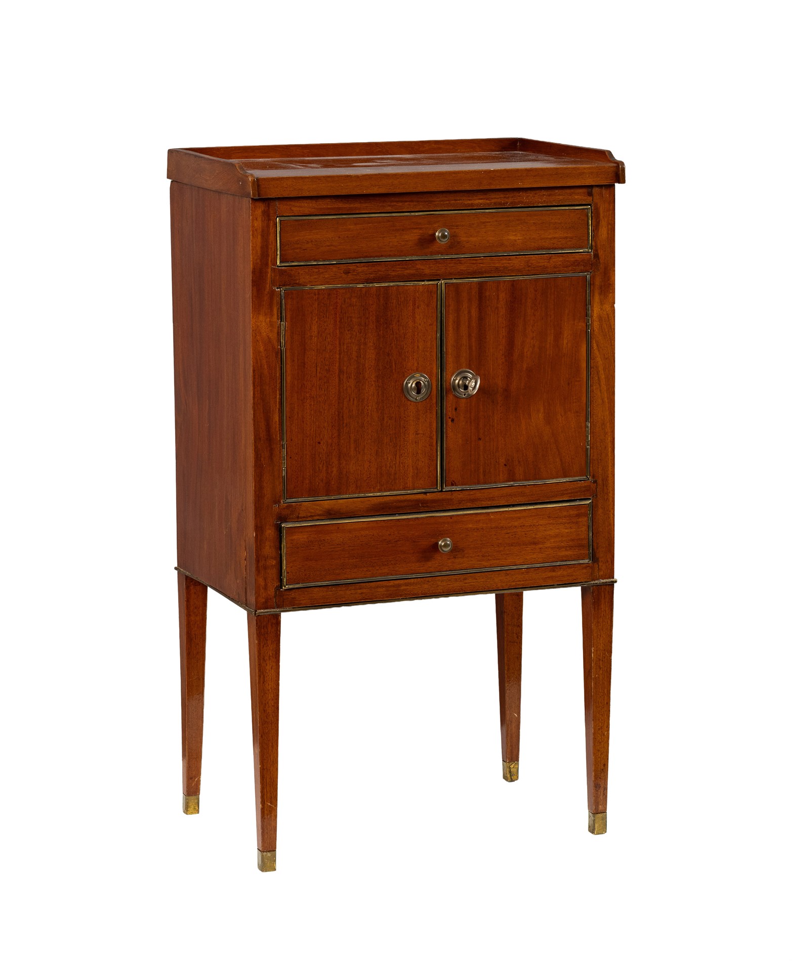 Sengustaviansk, 1800-tallet. Sverige. Mahognifinér med detaljer i messing. Fungerende lås m/nøkkel.