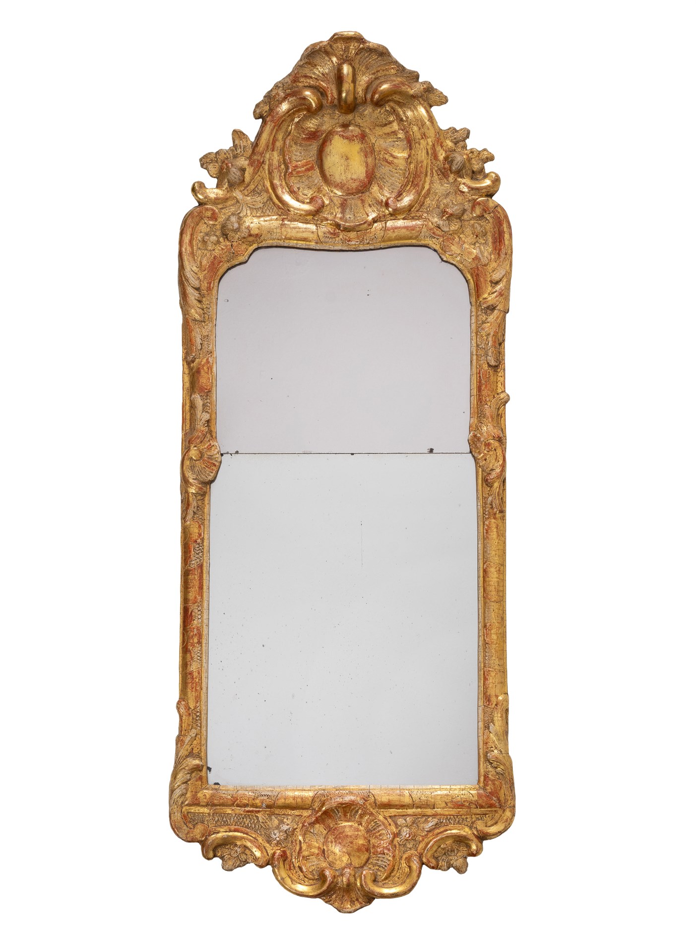 Rokokko, Sverige. 1700-tallet. Provinsiell. Skåret furu med gessogrunning og forgylling. To-delt originalt speilglass.