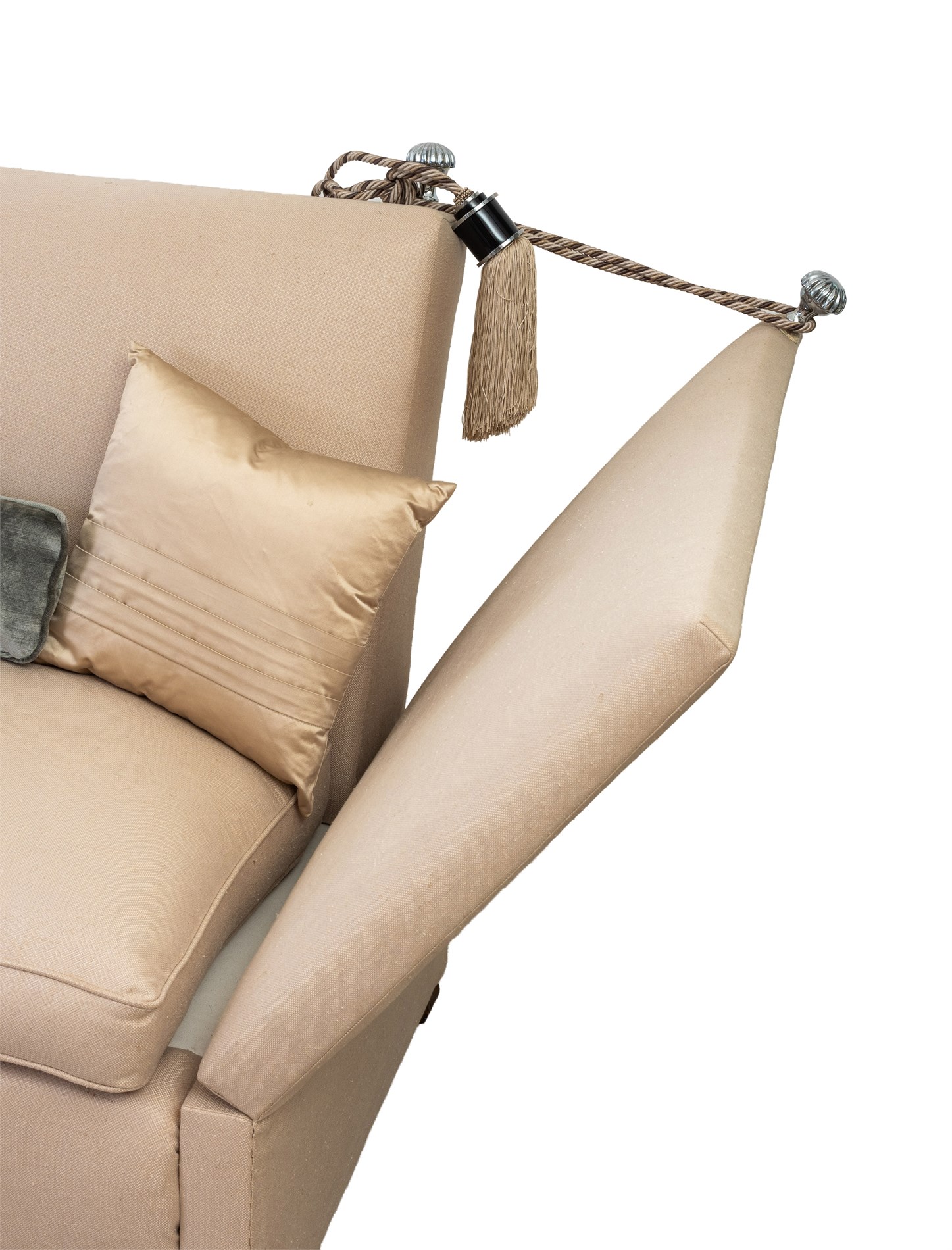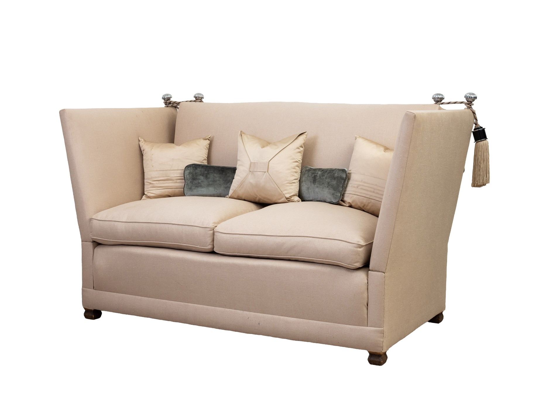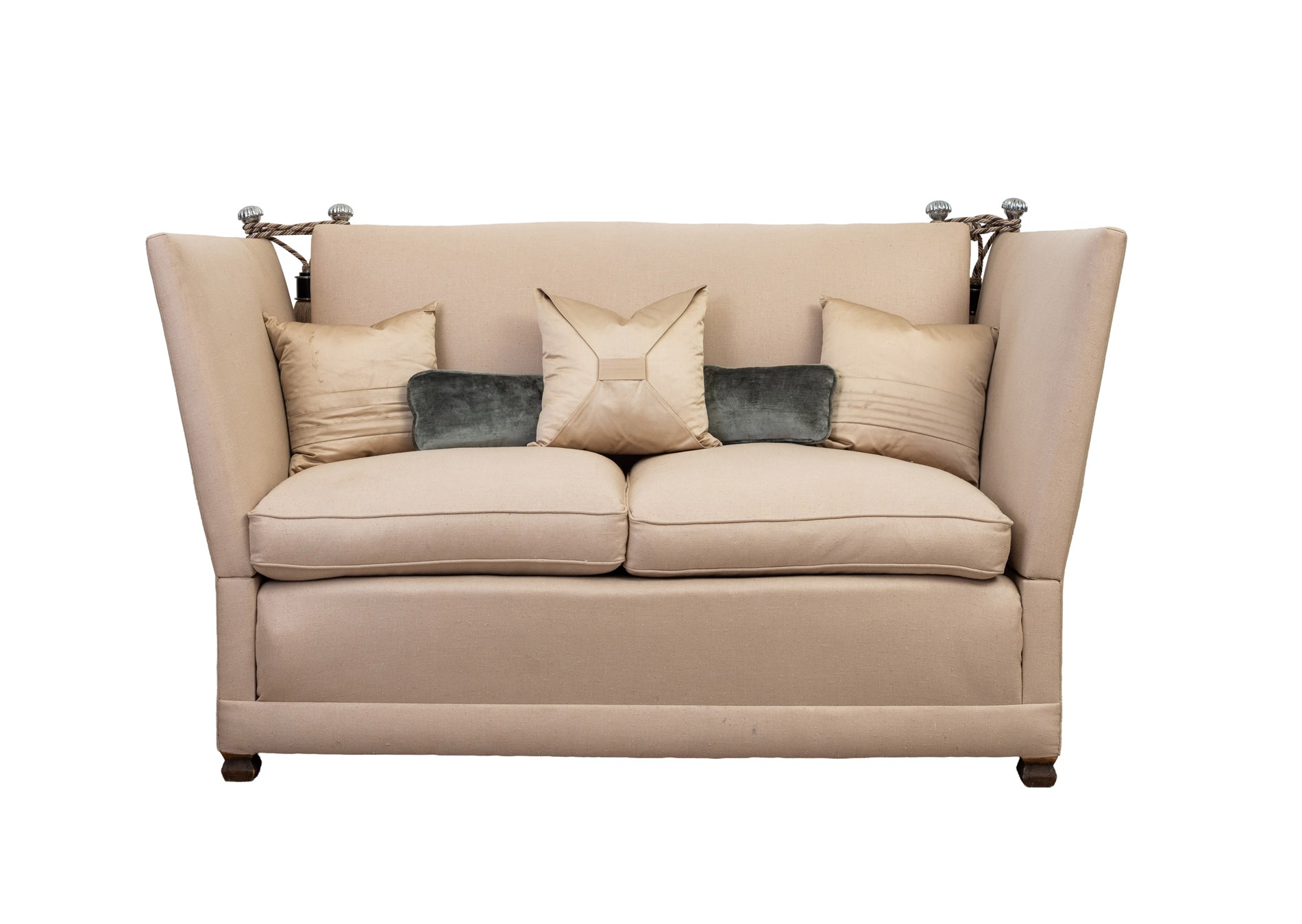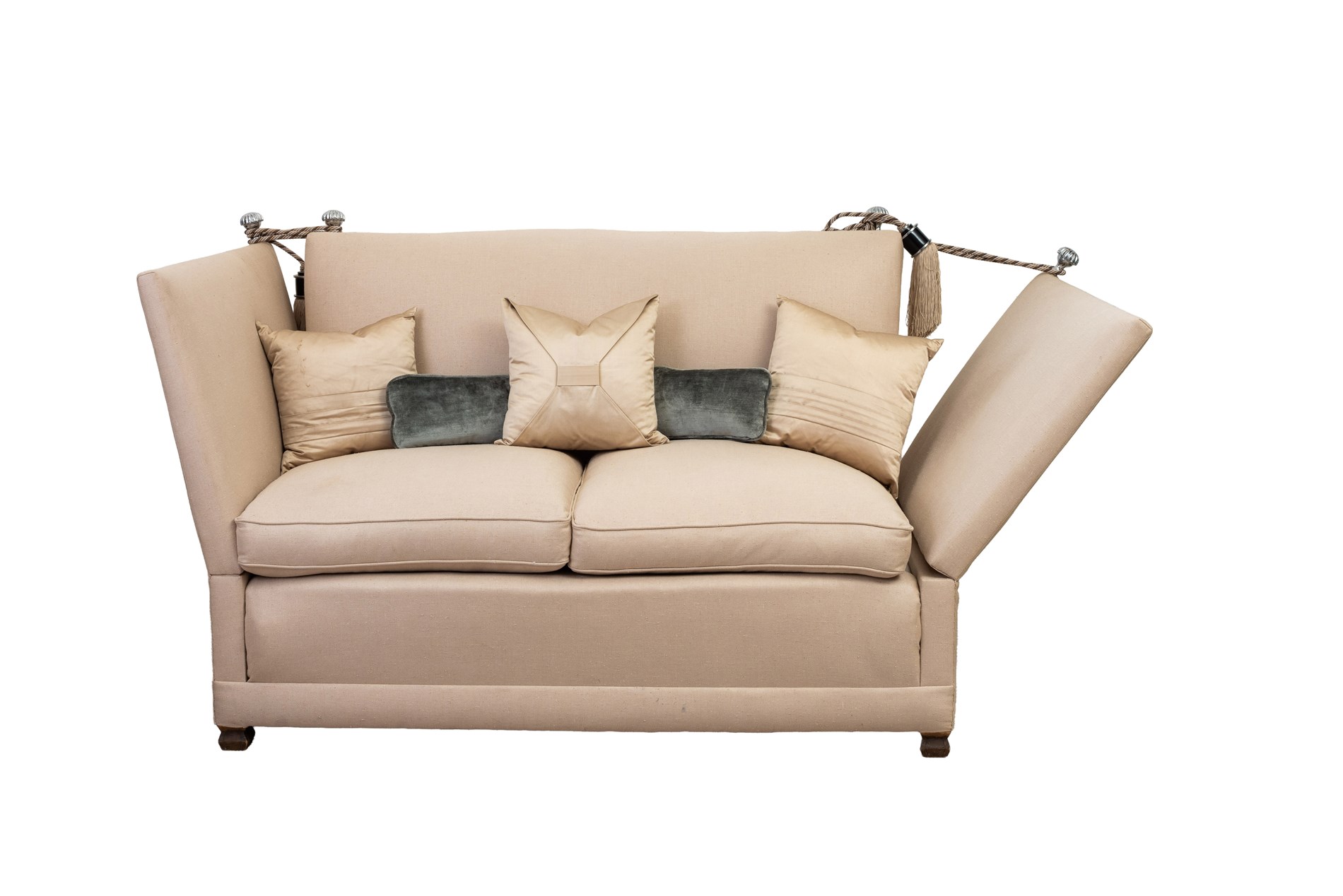 To-seter sofa trukket i beige tekstil. Dusker og utfellbar for sidene. Medfølgende to puffer og fem puter. 2000-tallet.