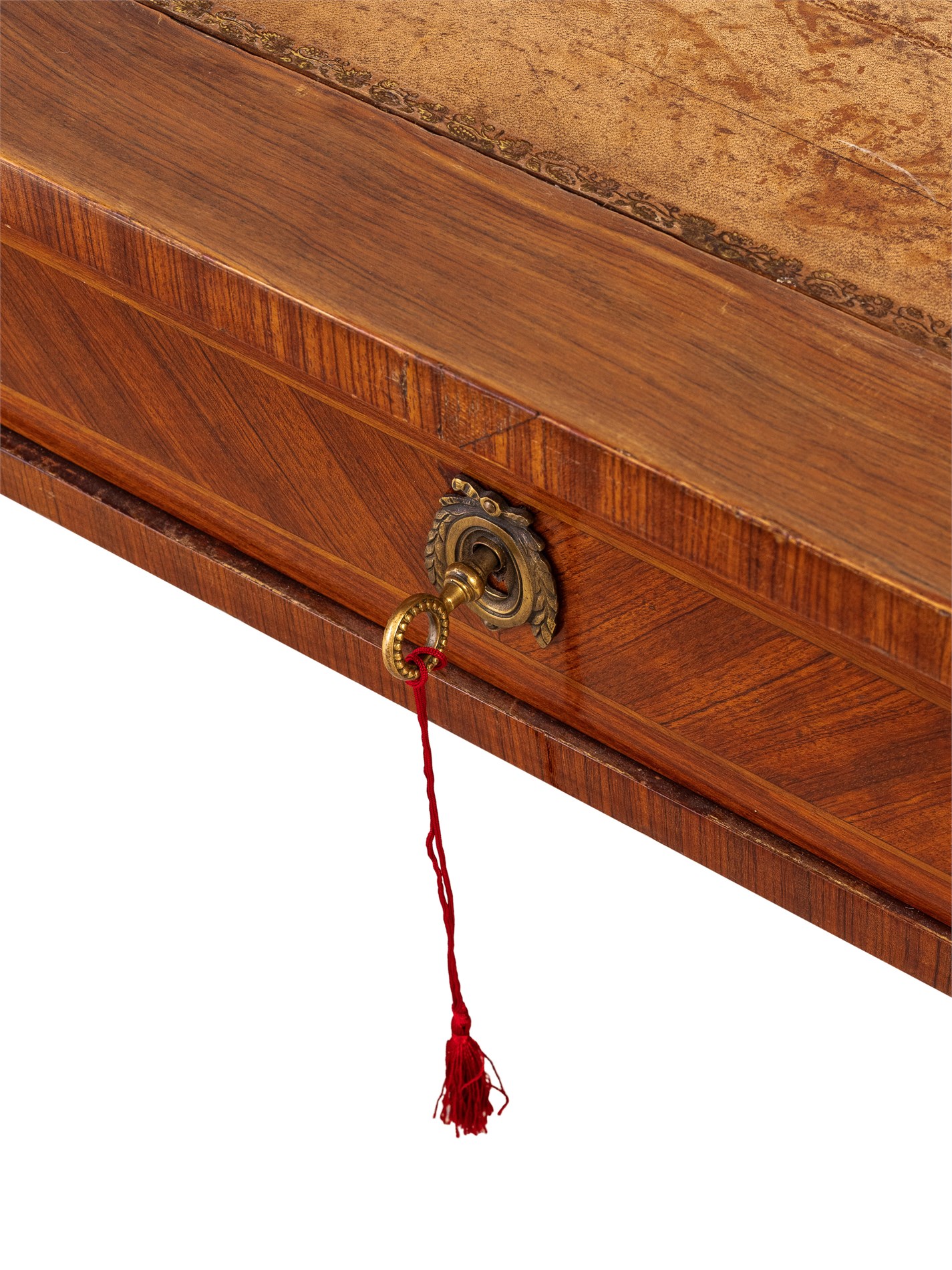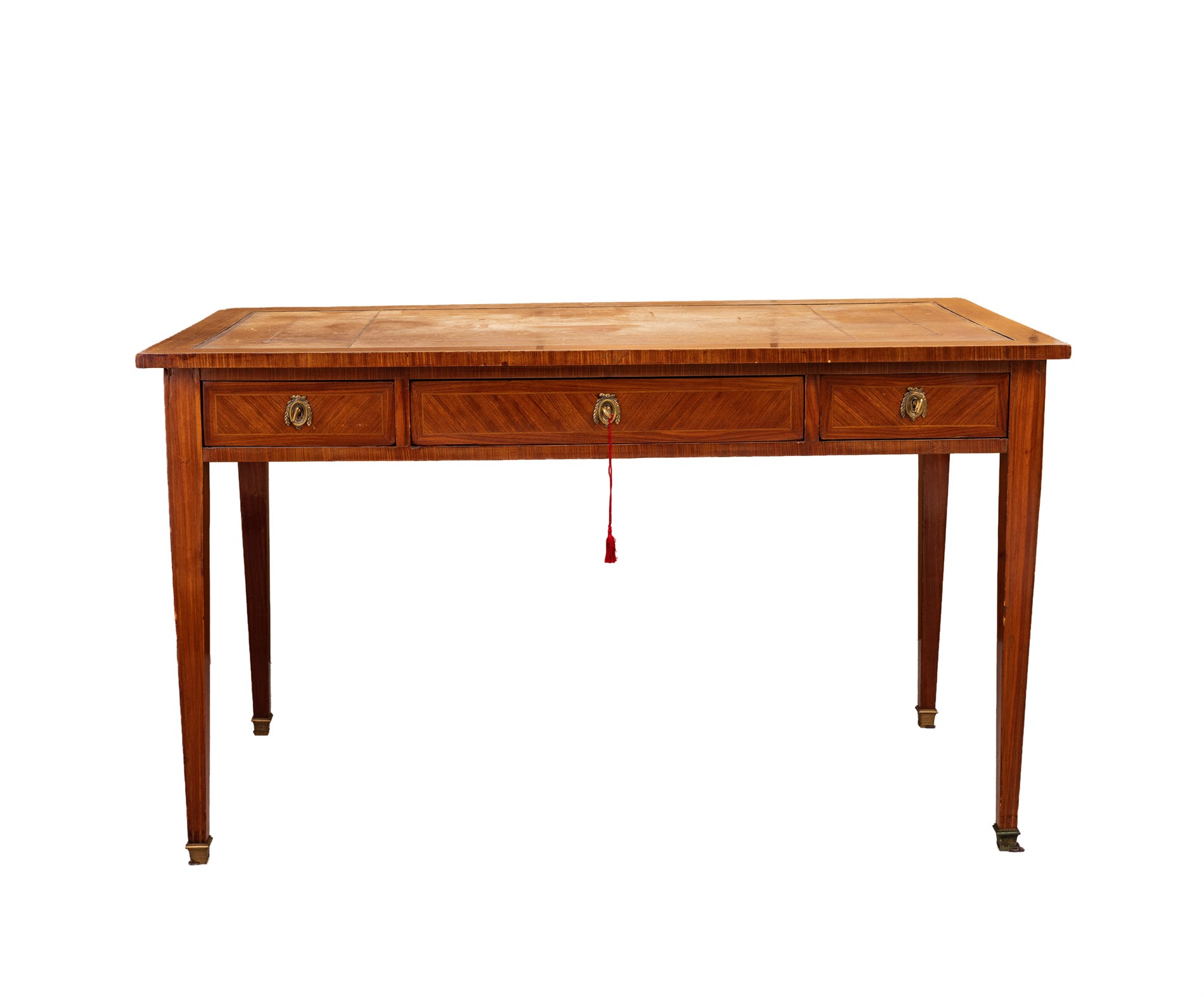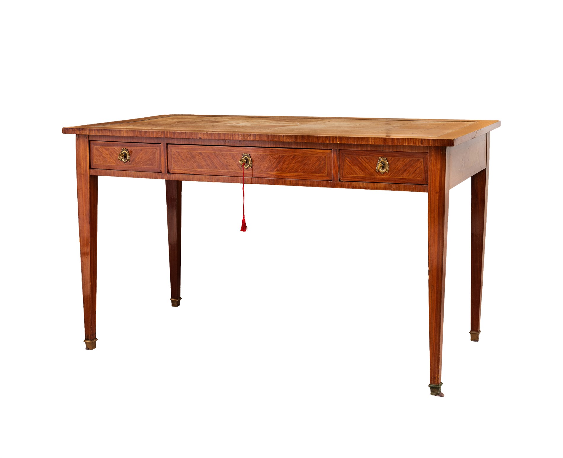 Louis XVI-stil, Frankrike. Ca. år 1900. Bureau plat-type. Finér av mahogni og lyst frukttre. Skive i beige skinn med preget dekor med rester av forgylling.
