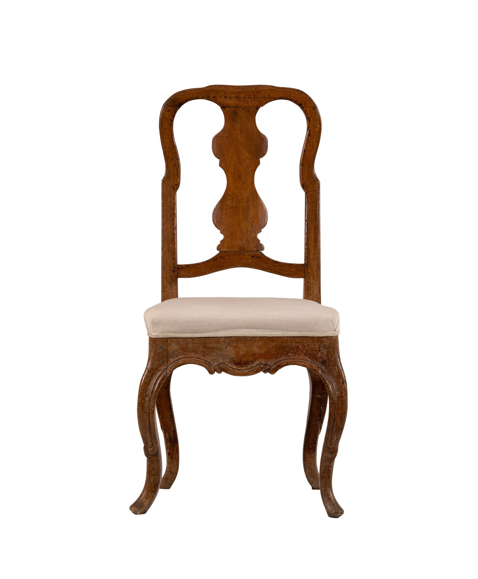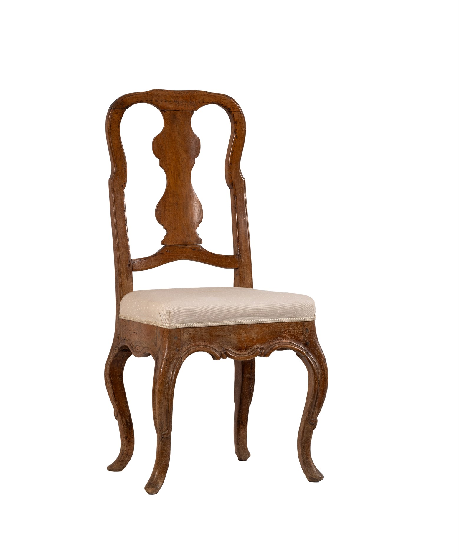 Senbarokk, 1700-tallets første halvdel. Utført i eik med skårede detaljer. Sete stoppet og trukket med lys tekstil.