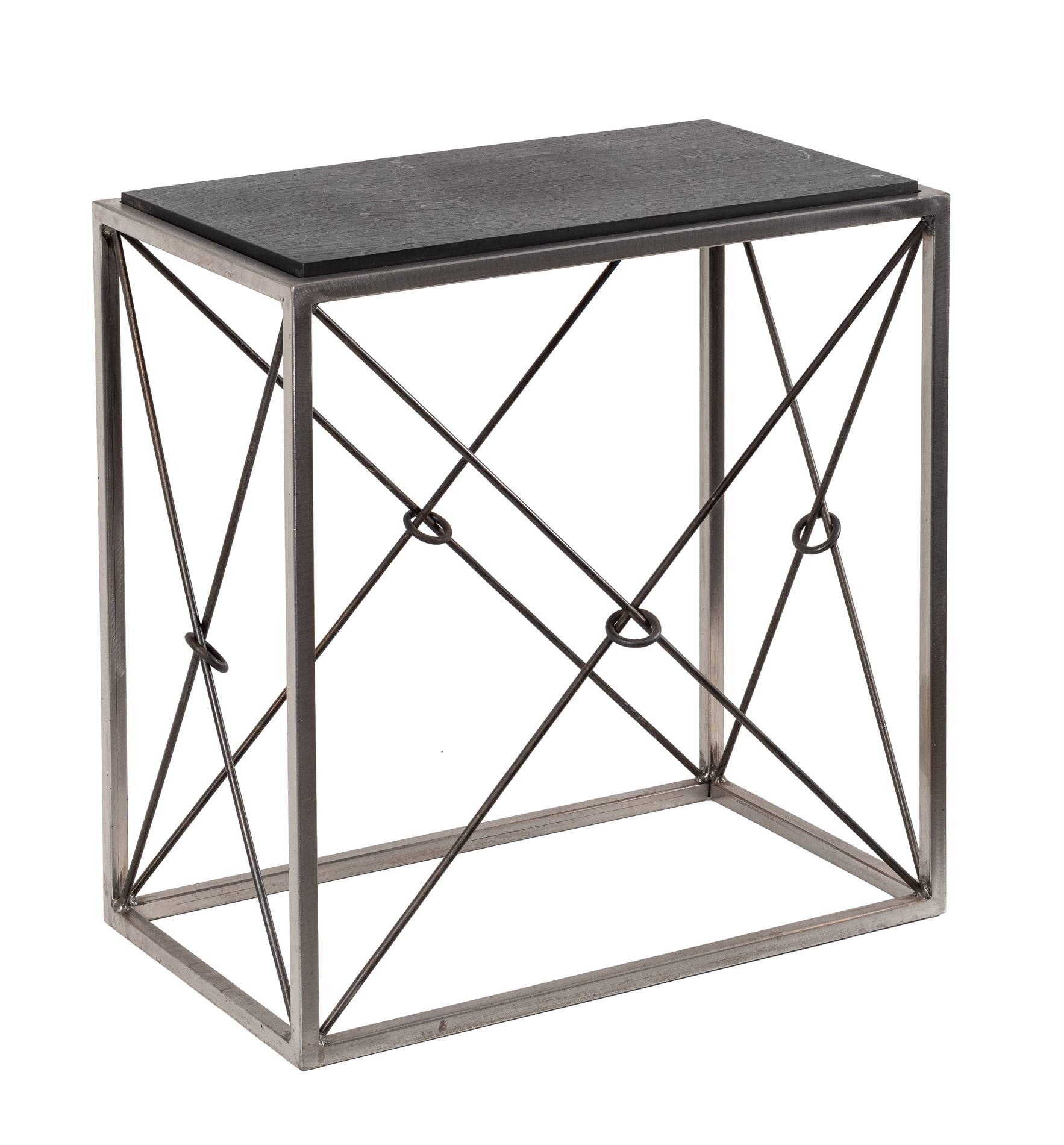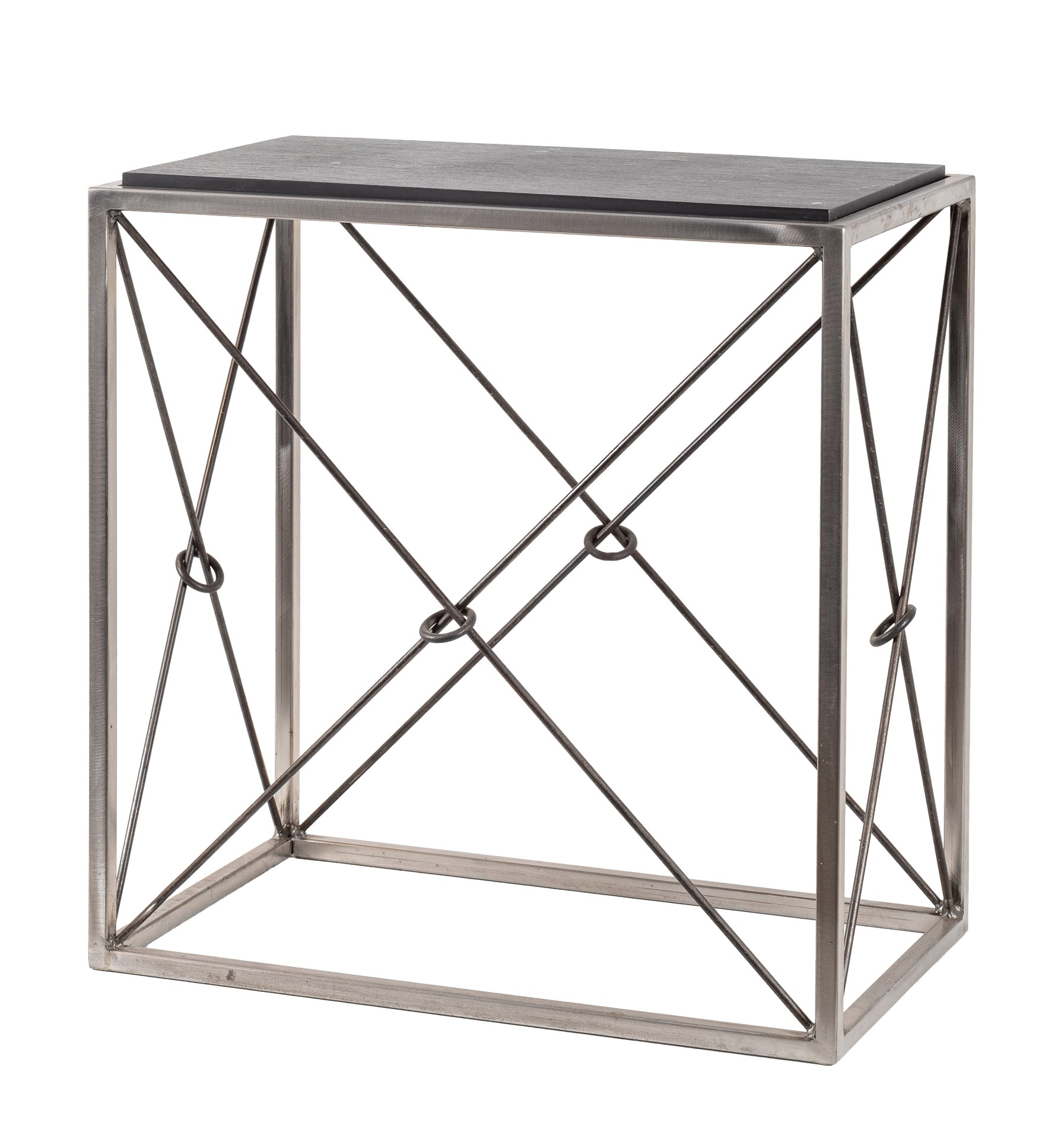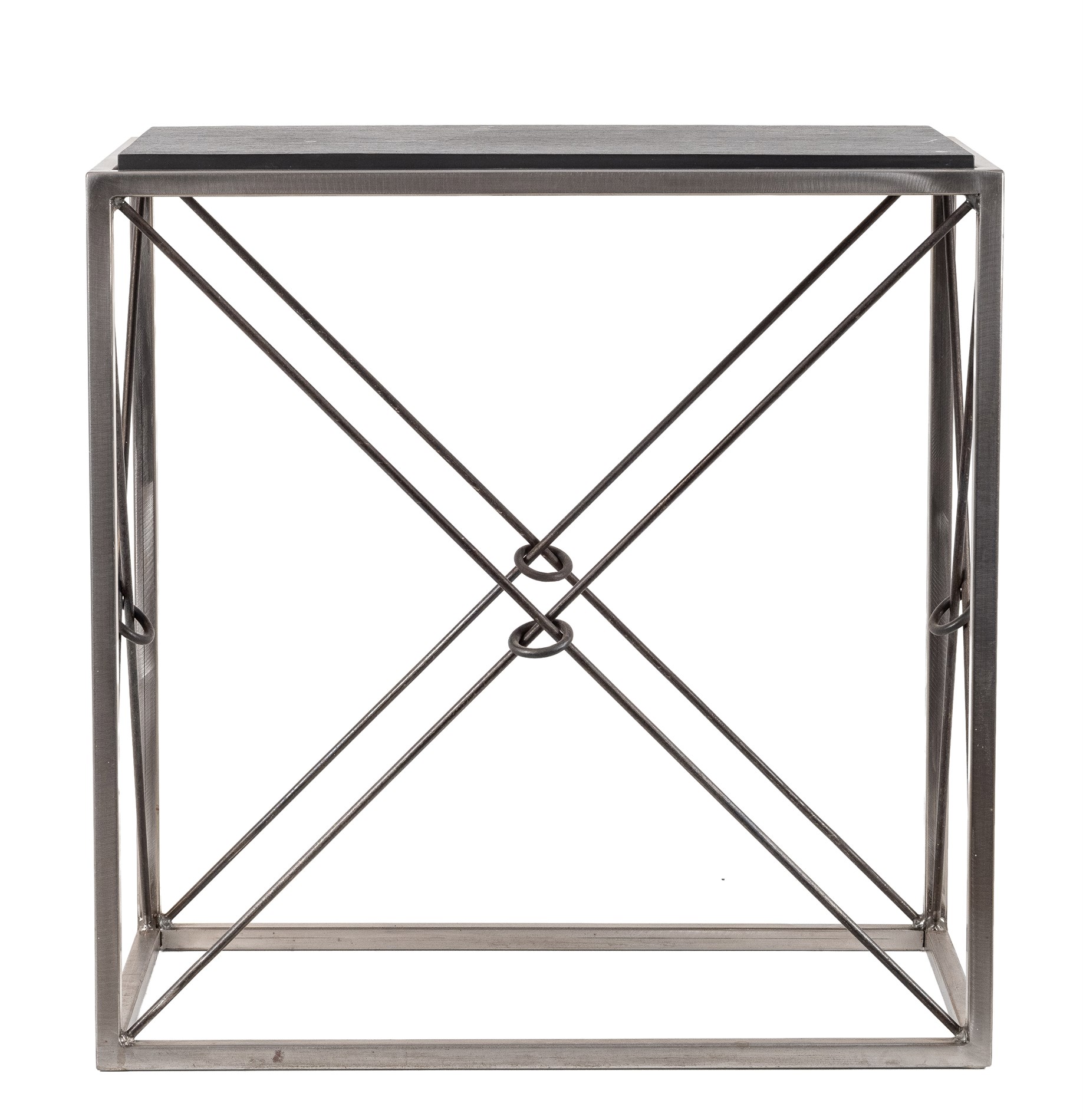 Designet av Yvonne Stenersen (1941-2025). Utført i patinert sveisestål med ringer og nedfelt bordplate i sort skifer.