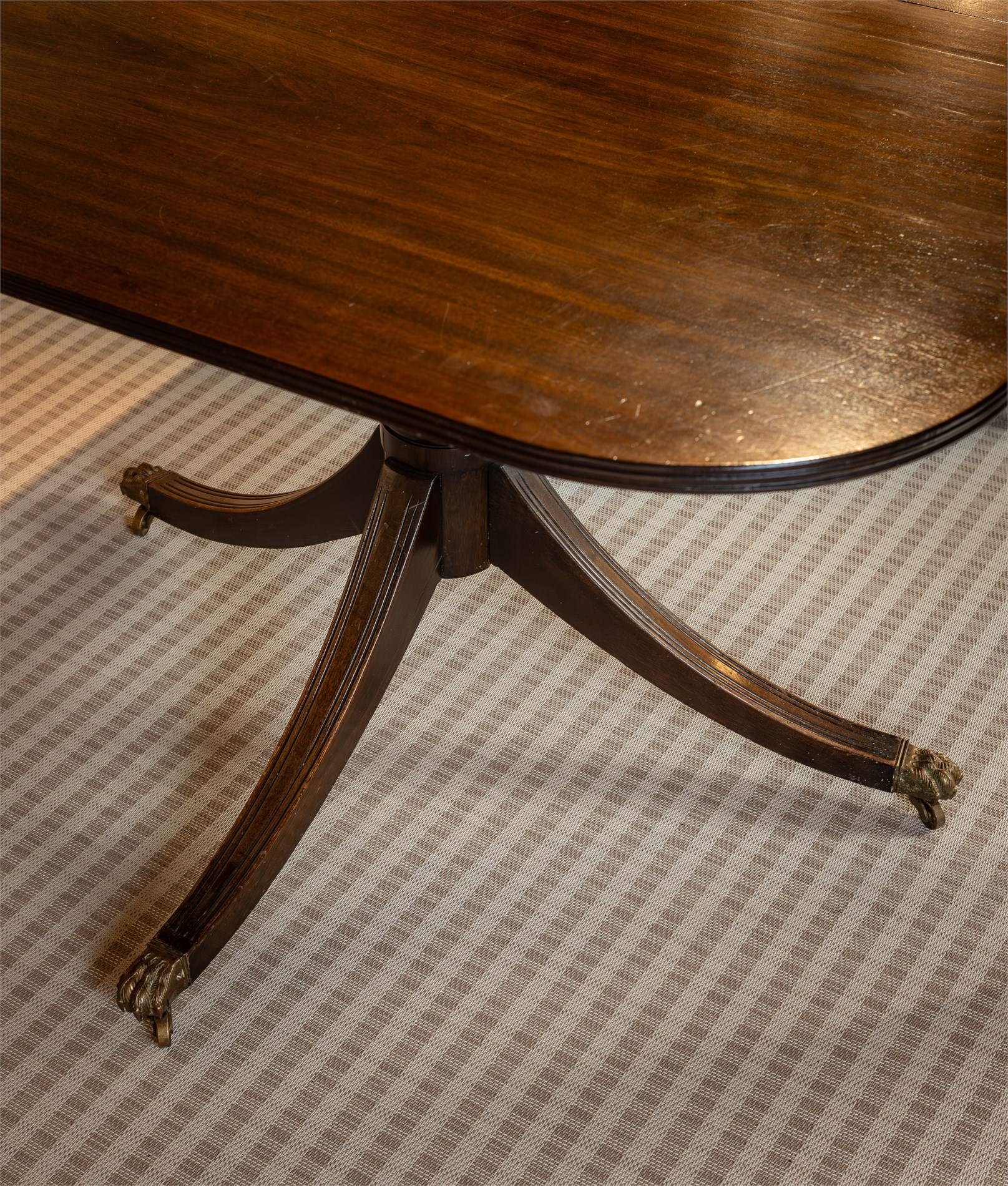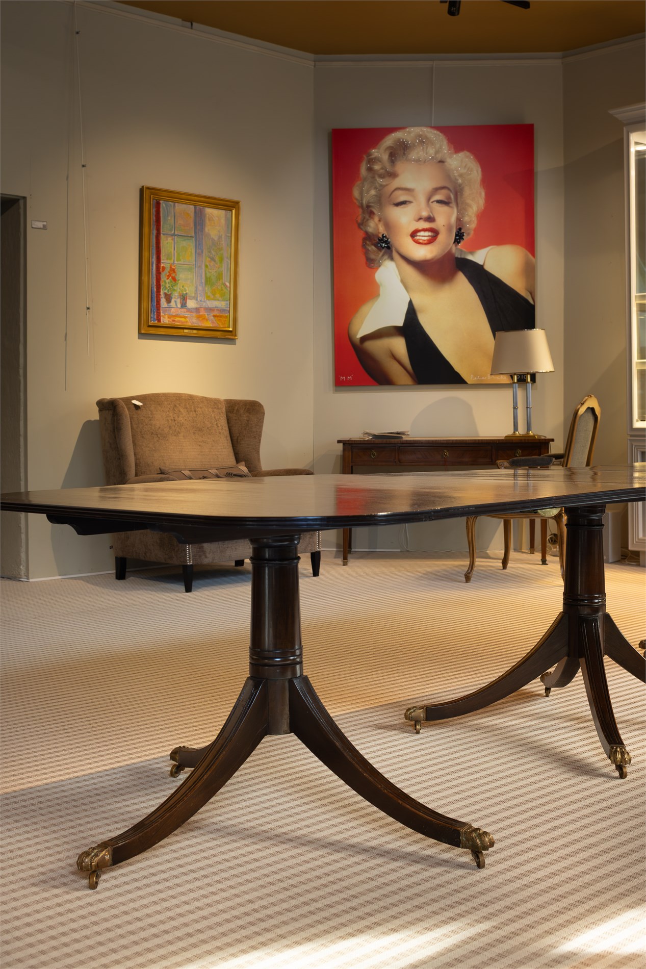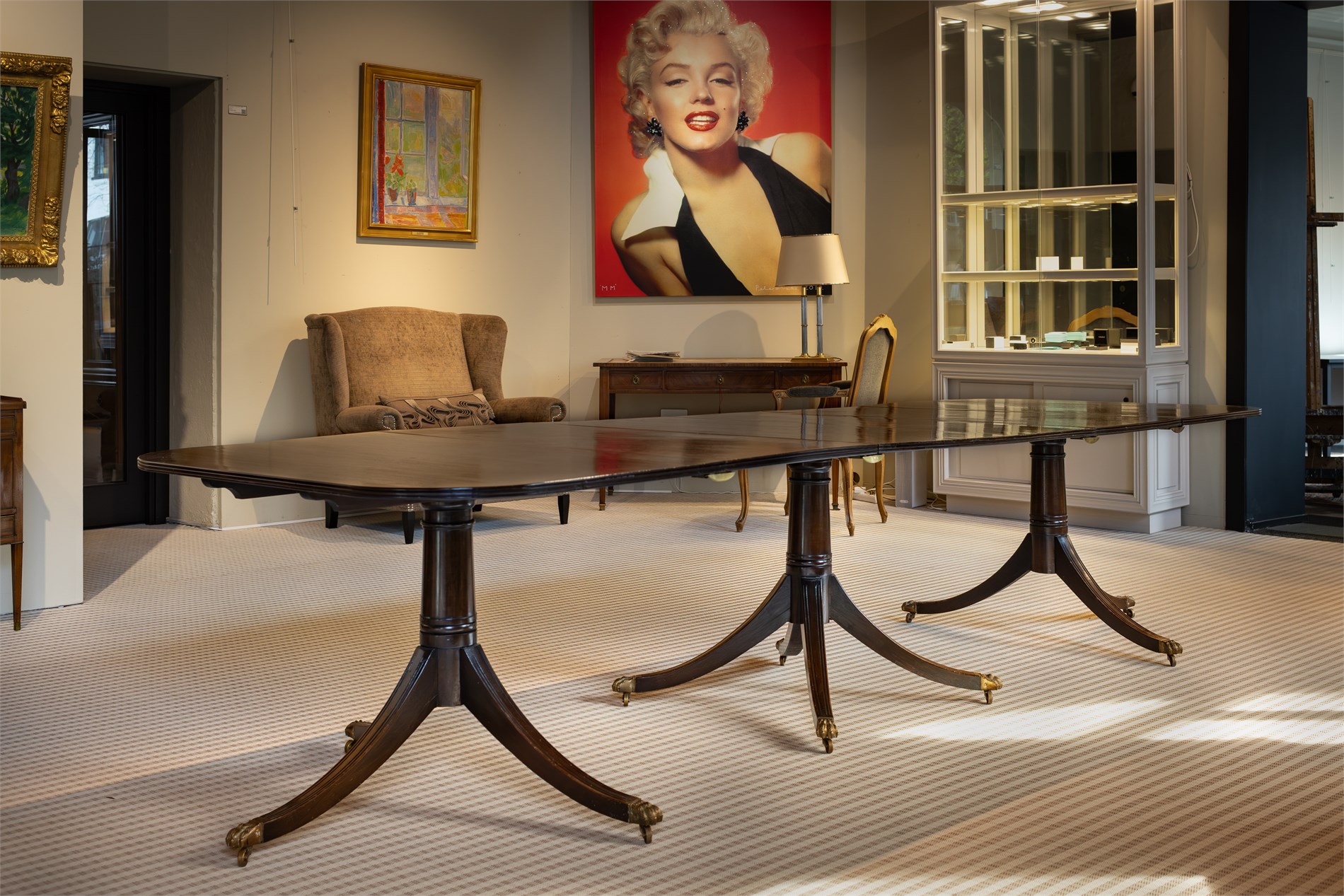 Regency-stil. Sent 1800-tallet. Mahogni med detaljer i messing. Tre understell med én plate hver, samt to ekstra ileggsplater. Løveføtter med trinser.