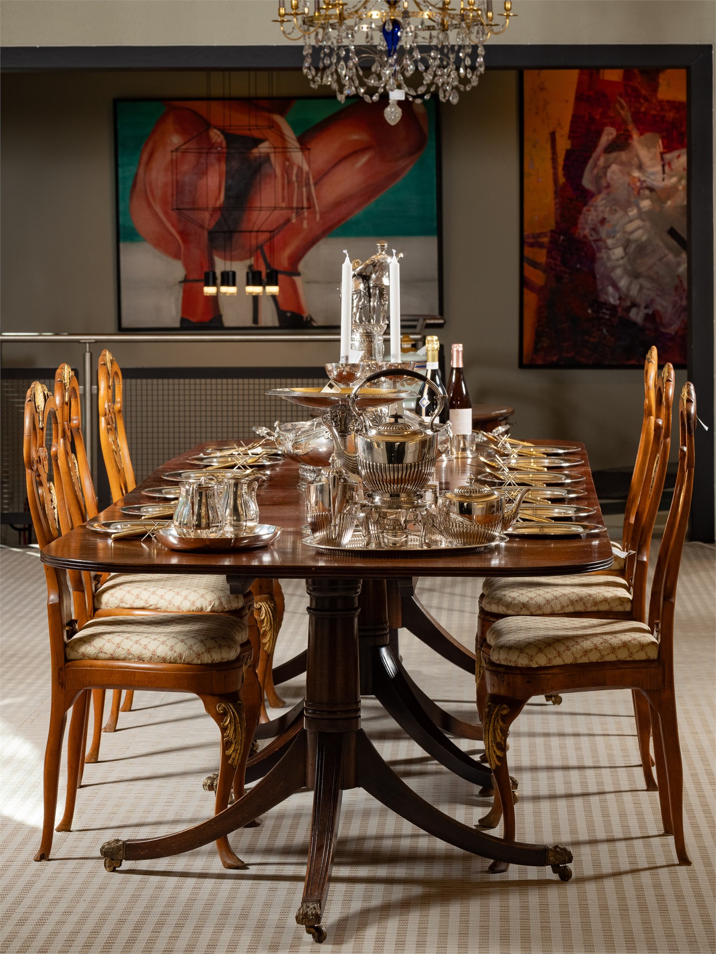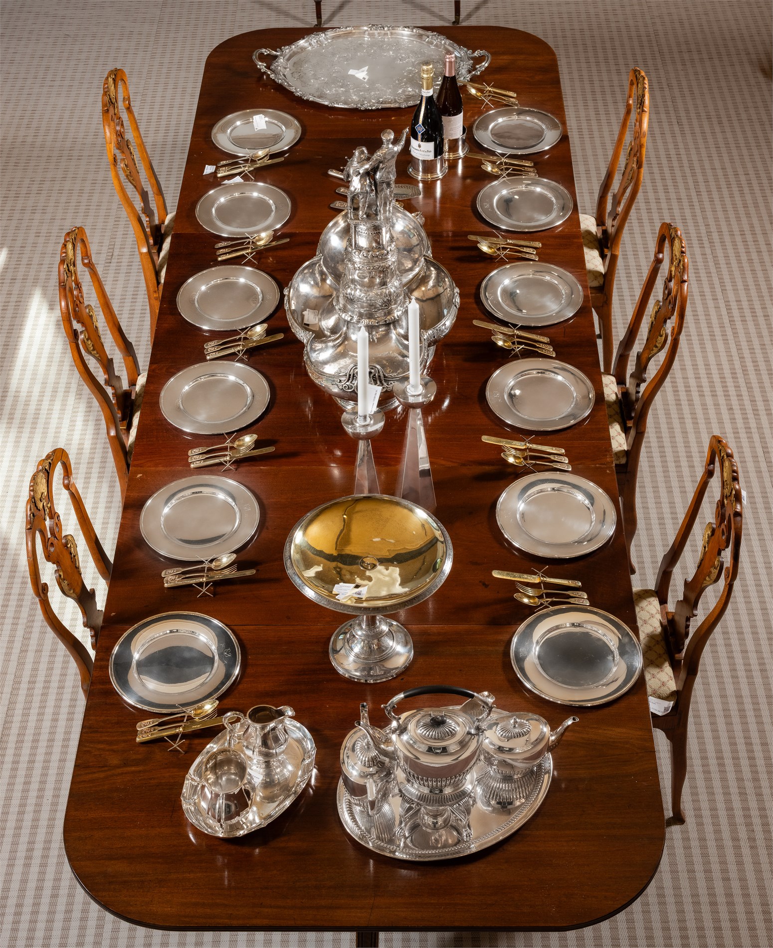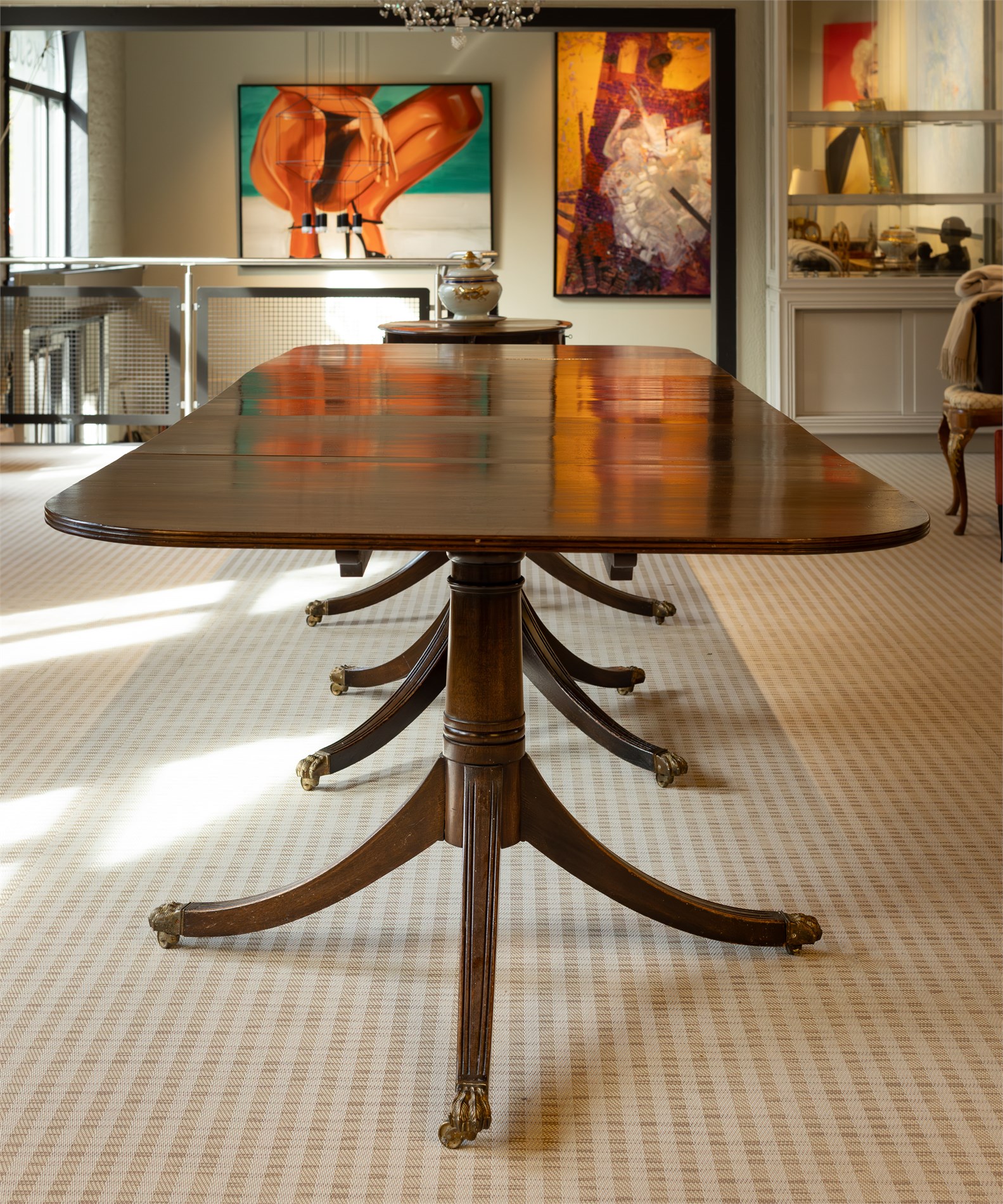 Regency-stil. Sent 1800-tallet. Mahogni med detaljer i messing. Tre understell med én plate hver, samt to ekstra ileggsplater. Løveføtter med trinser.