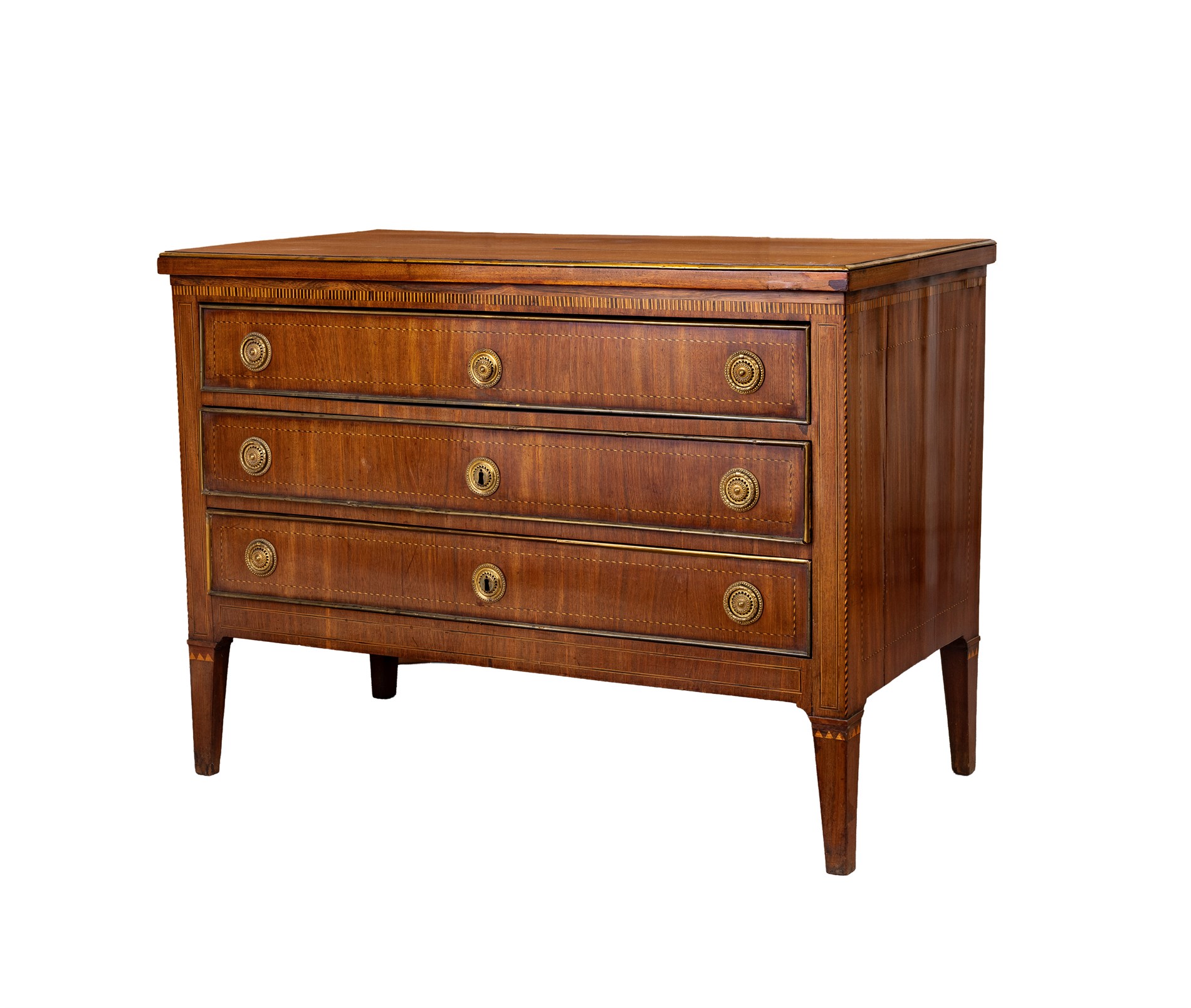 Gustaviansk, tidlig 1800-tallet. Sverige. Finér av valnøtt, frukttre og ibenholt på blindtre av furu. Forgylte ringbeslag og detaljer i messing. Tre skuffer.
