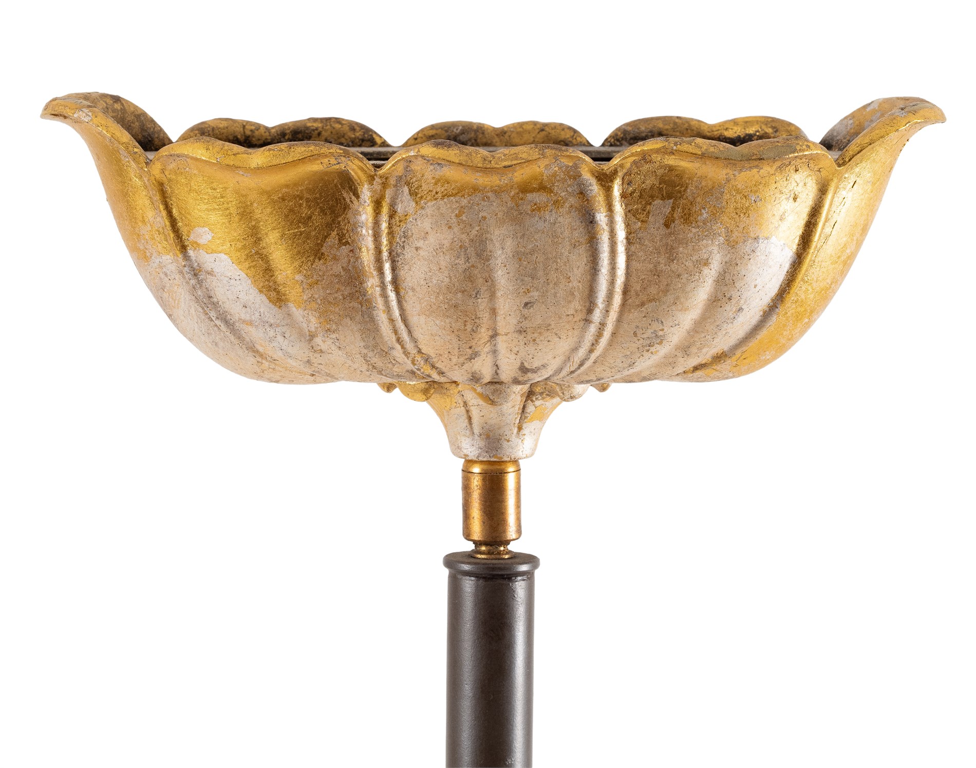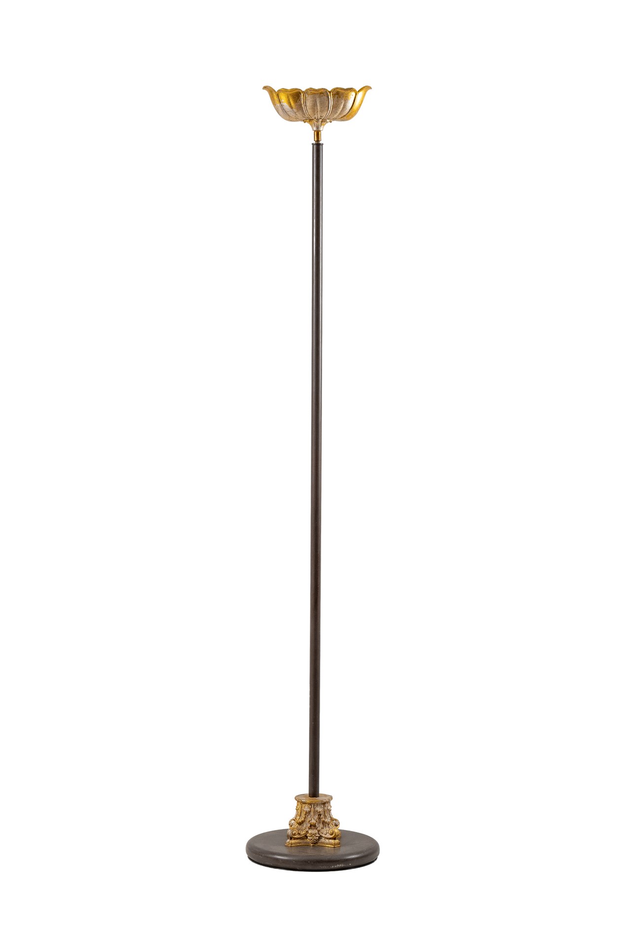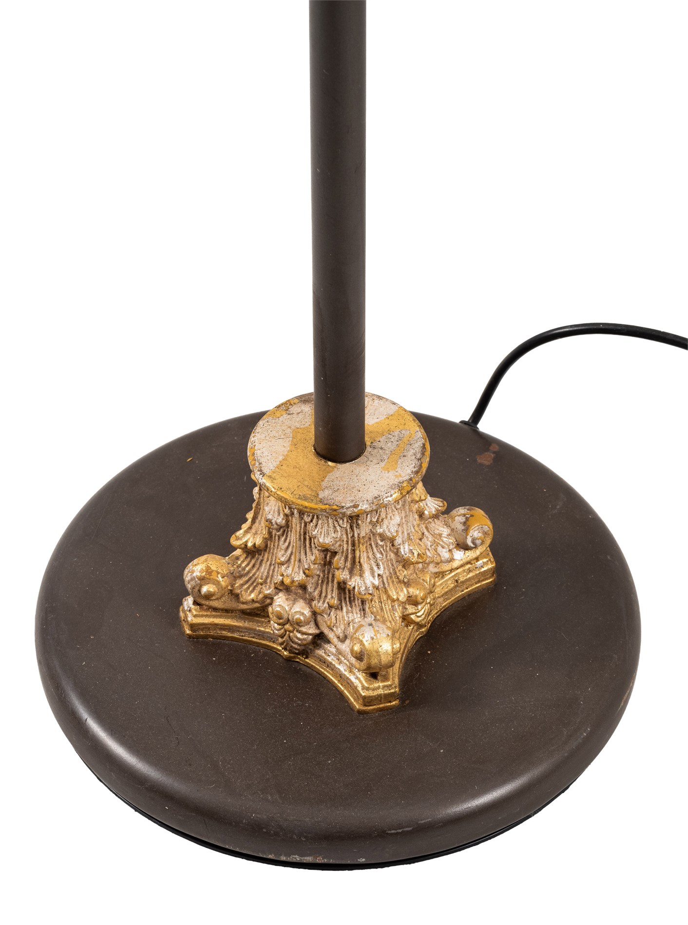 Nyere produksjon på klassisk manér. Fotstykke som forgylt korintisk kapitél og lysholder opp formet som begerblomst, med to sokler til E14.